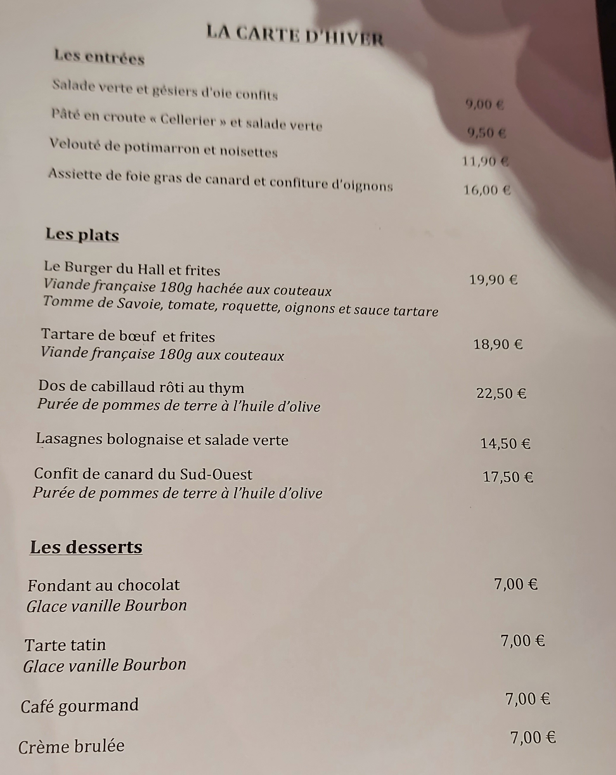 Des plats chers peu quantitatifs. Le plat de calamar tenait dans un cassolette de 4 morceaux....Nous avons demandé une part de gratin en plus mais il fallait payer un supplément de 5 euros çà fait cher la patate ! Même margée. Heureusement c'était bon mais on est ressorti avec la faim et une note de 35 euros pour 2 sans desserts ni boissons ! Je ne recommande pas!