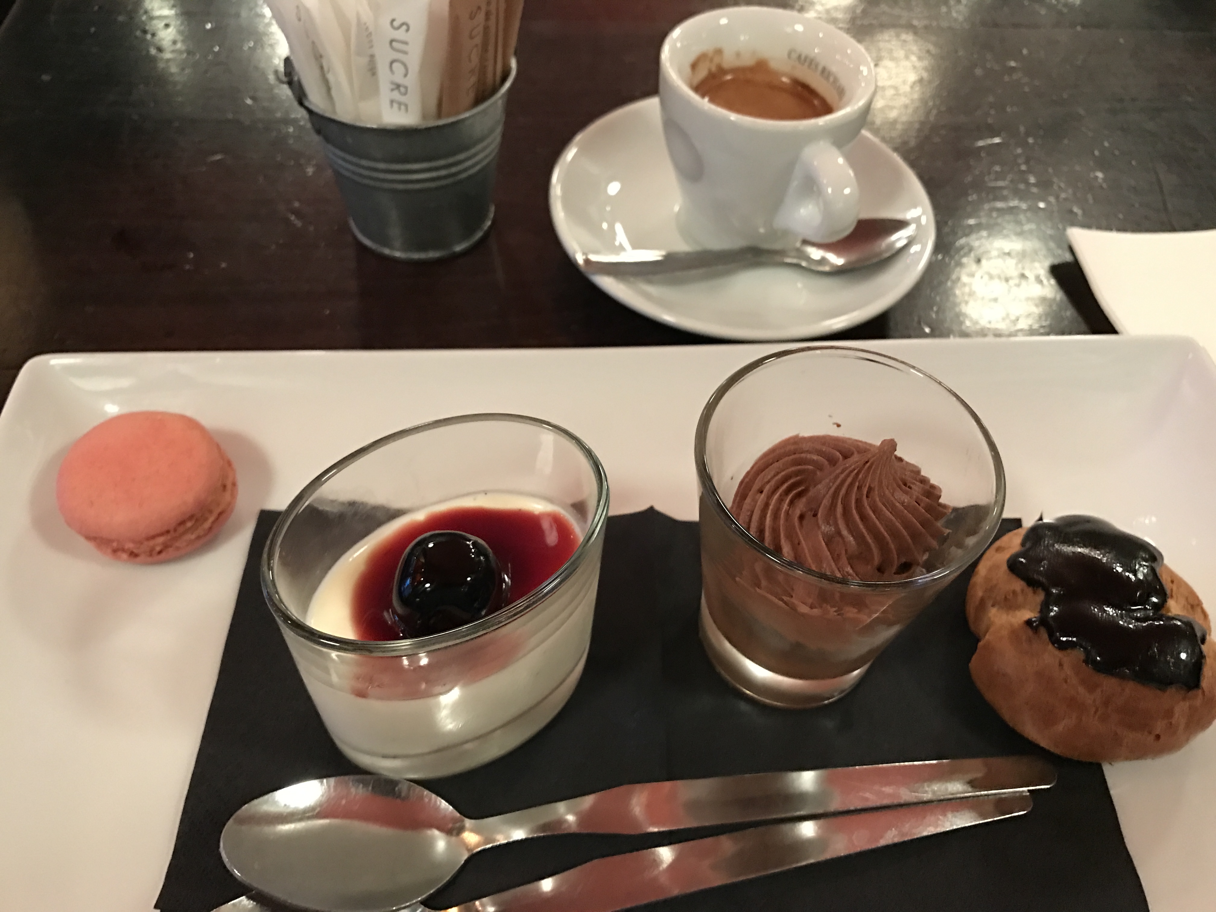 Bon chocolat chaud Desserts un peu cher 10euros minimum Paris Brest revisité, pas un vrai paris Brest Serveurs peu souriants