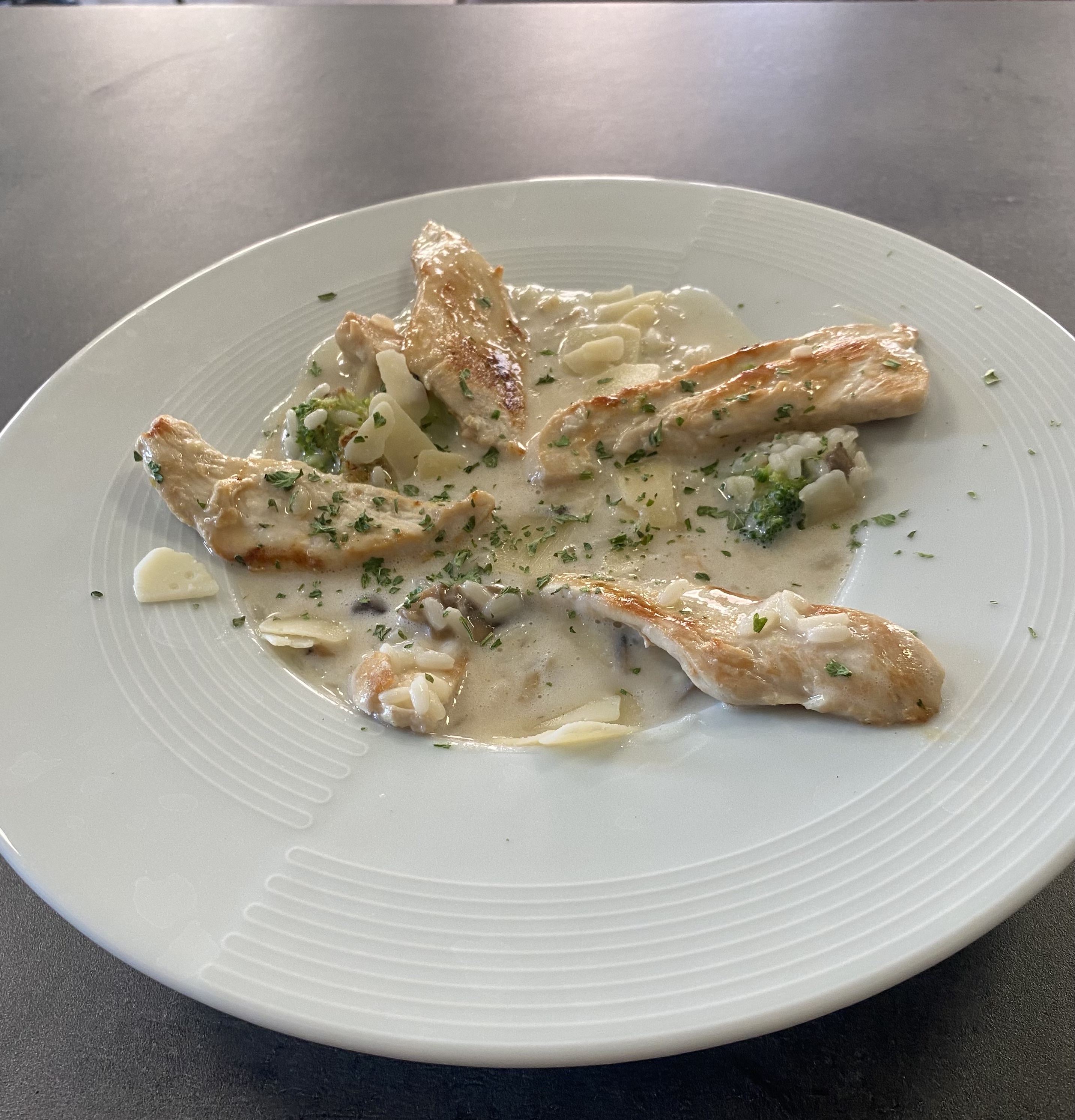 Bonne cuisine. Personnel chaleureux. Plat du jour risotto au poulet très bien. Ne vous fiez pas au apparence, c’était copieux !