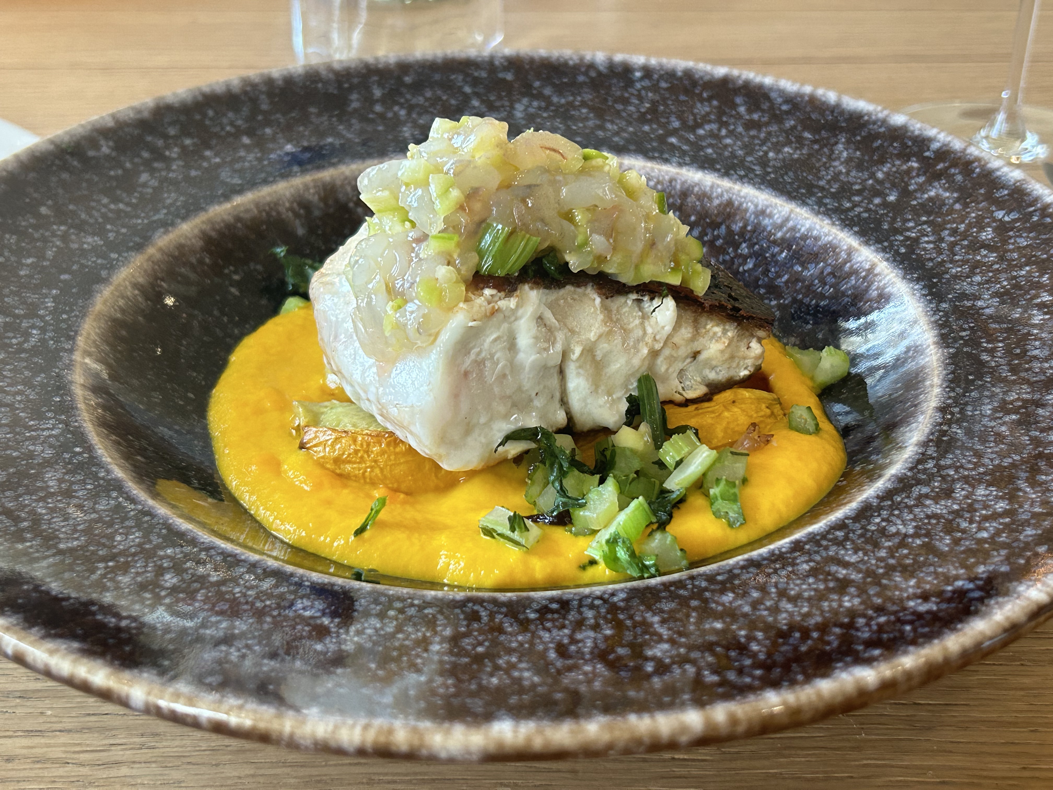 Menu du midi délicieux, des produits frais assemblés de manière osée mais équilibrée! Visite du chef à la table appréciable en fin de repas. Je recommande fortement