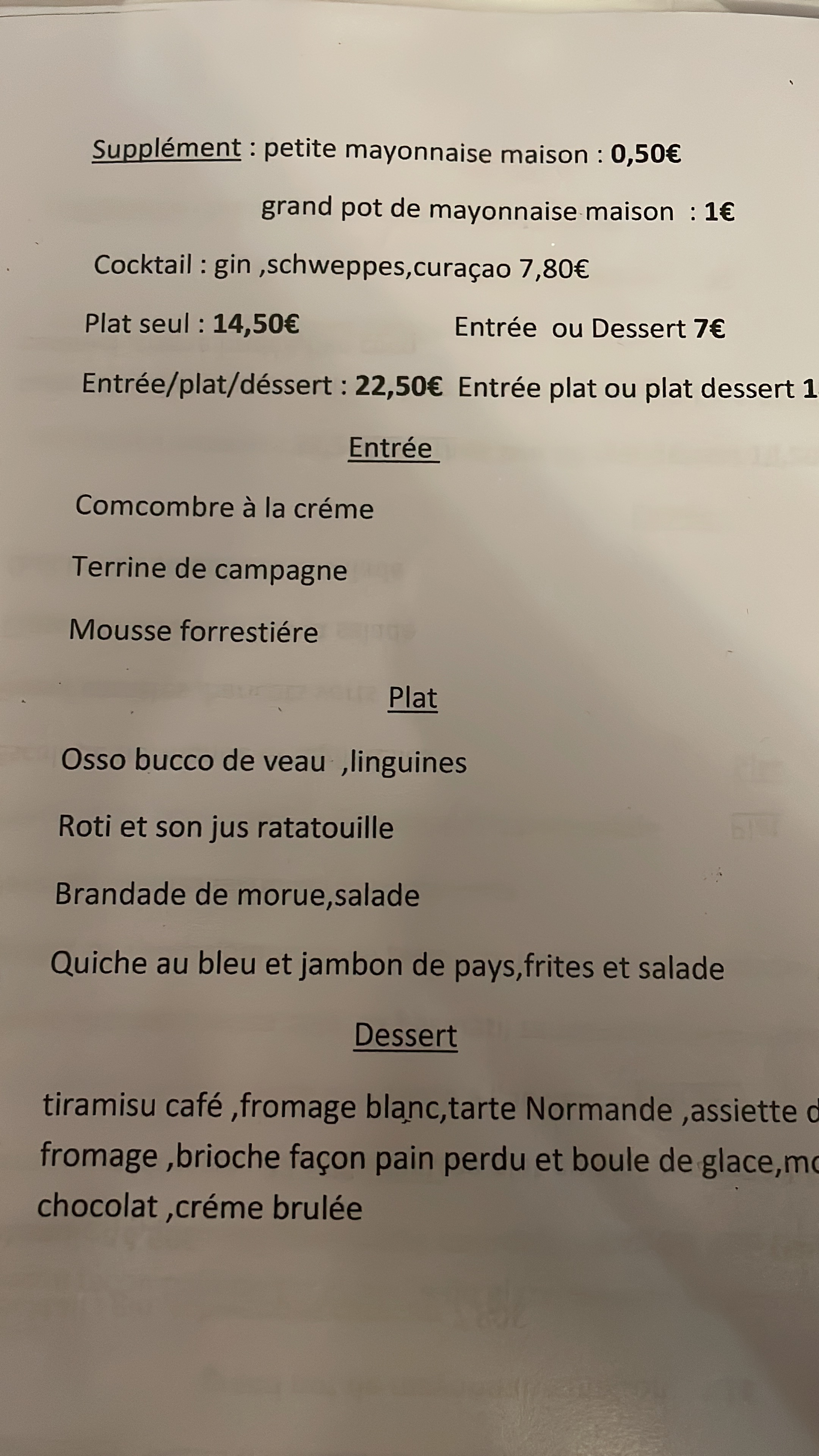 Convivial, on y est bien accueilli. Formules midi à 14€ entrée-plat/ plat-dessert. 16€ entré/plat/dessert. Les frites sont un peu brunes (huile oxydé/ cuisson ?). La tarte tatin est excellente.