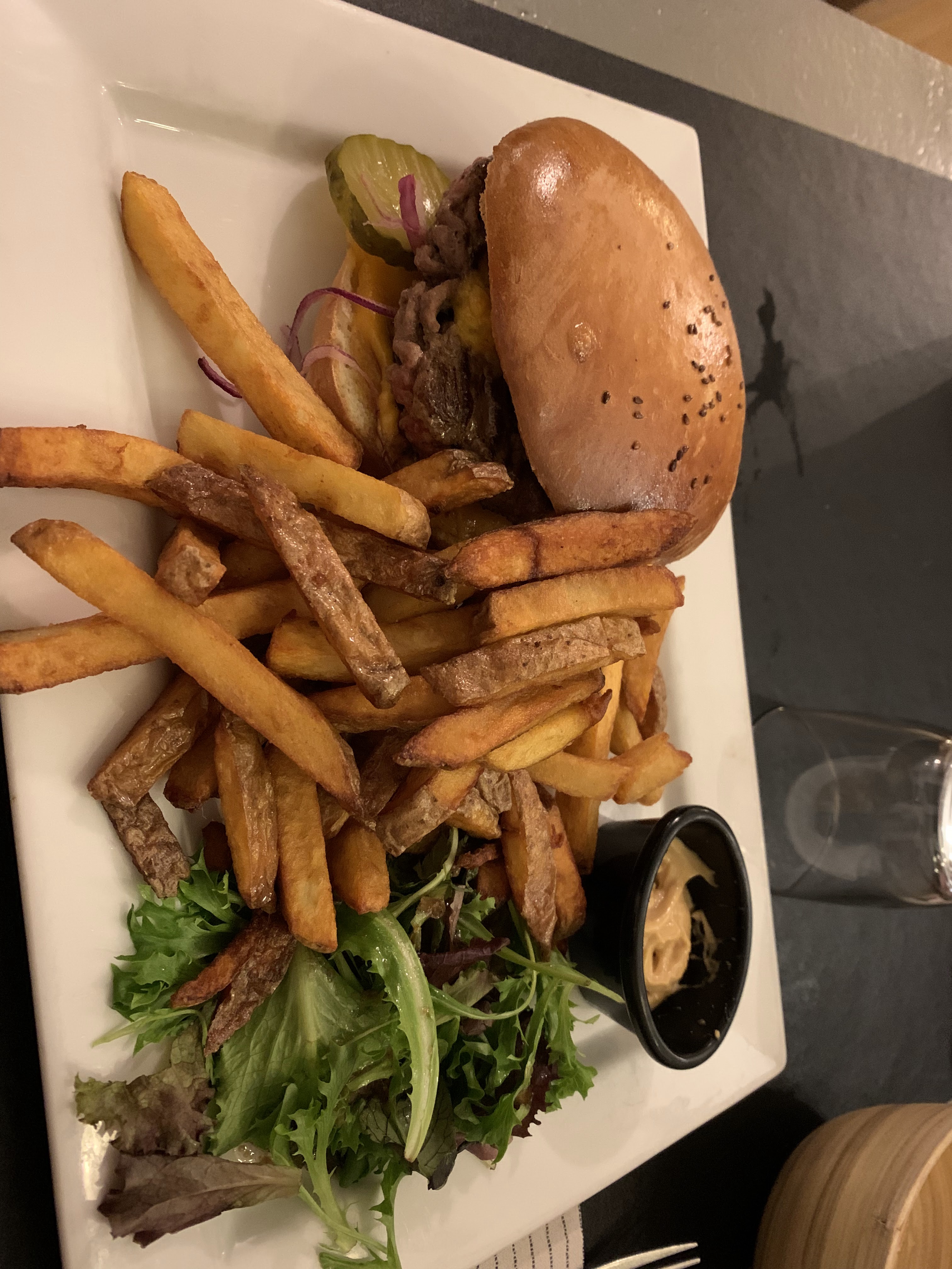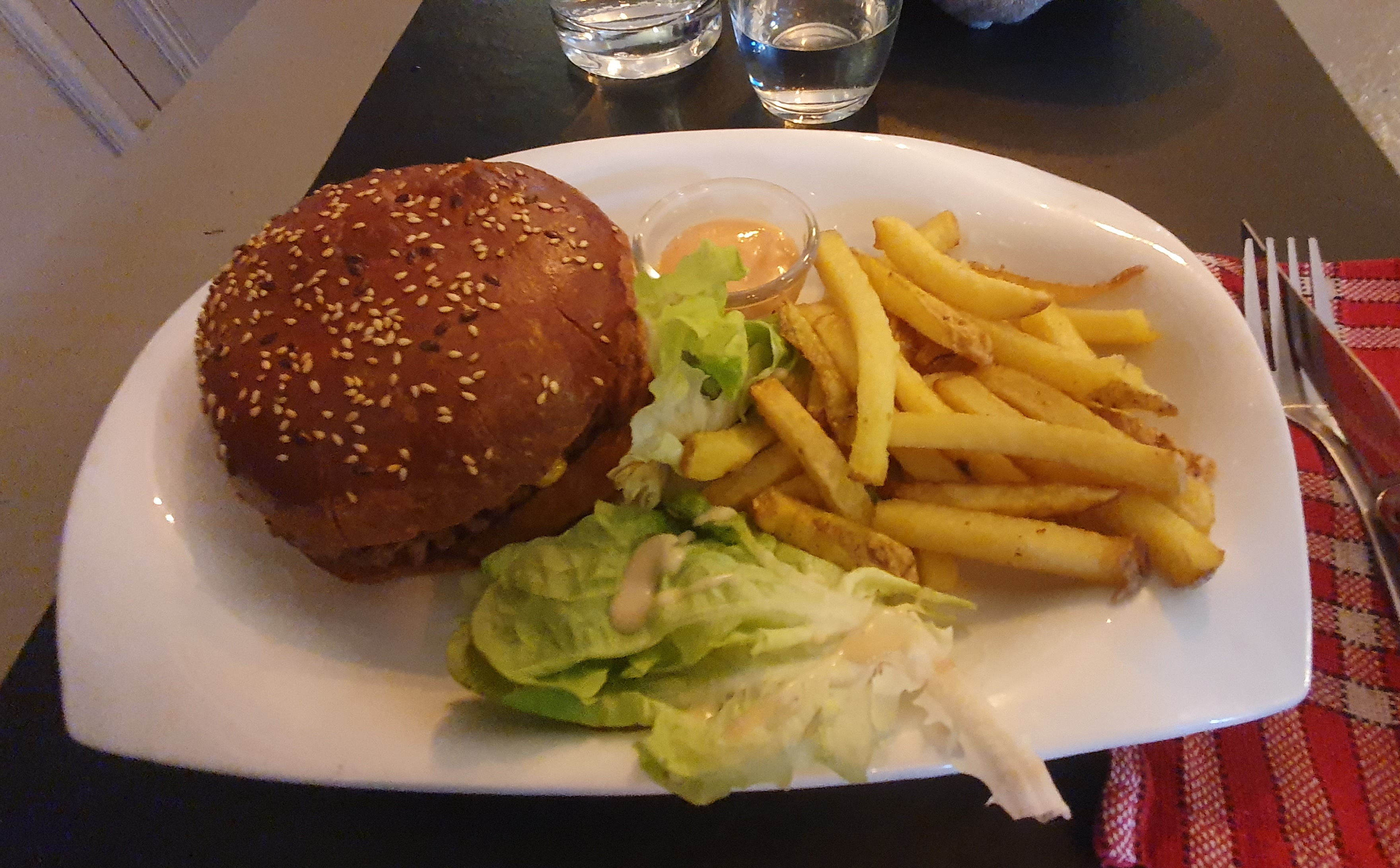 Velouté très bon. Burger très moyen avec viande (surgelée) froide. Frittes trop grasses. Serveuse charmante et arrangeante. Plus une brasserie qu'un restaurant.