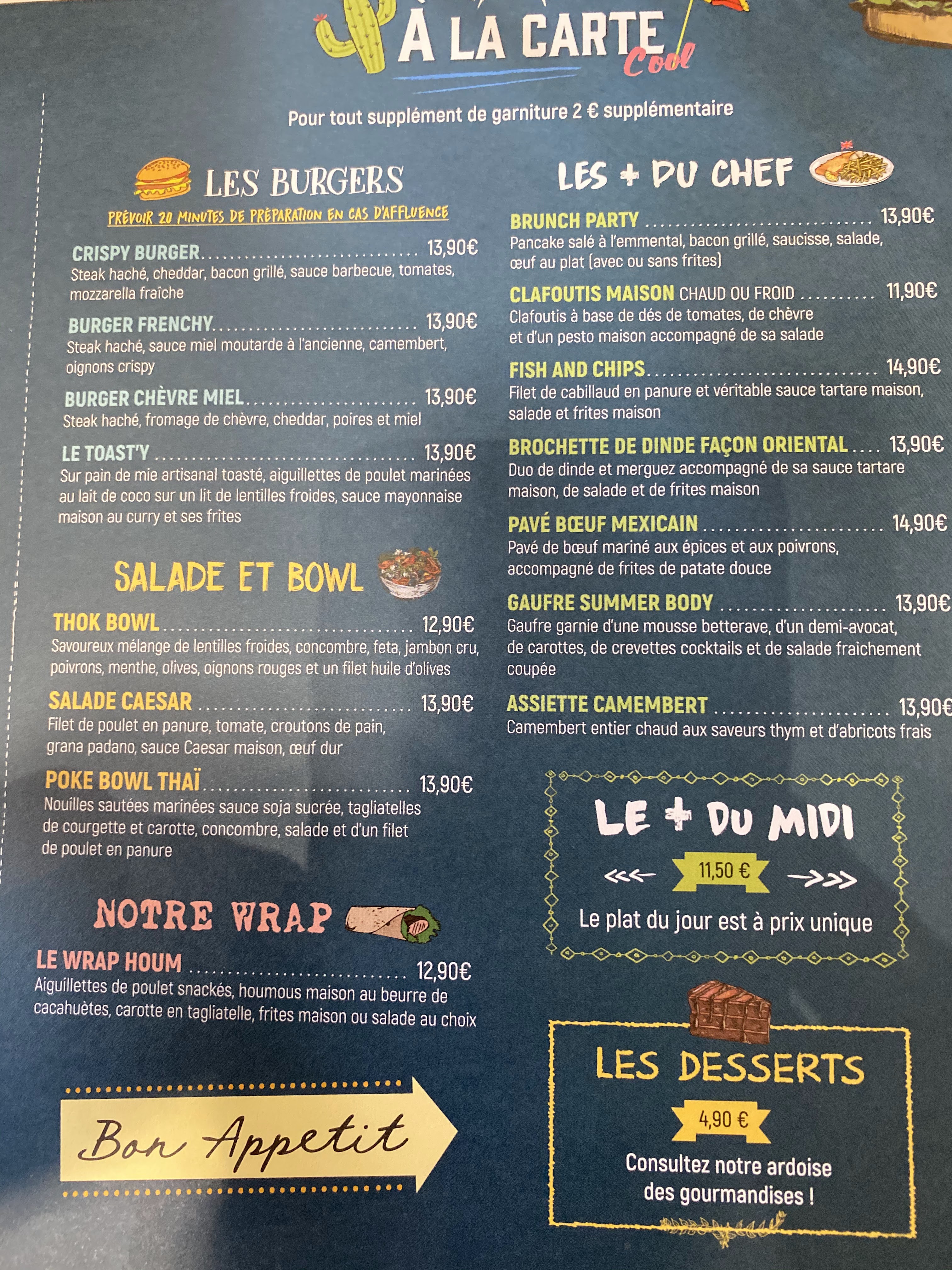 La carte n'est pas chère, mais la cuisine n'est pas à la hauteur. Un burger inondé de sauce barbecue, des frites surgelées sans goût, une crêpe plutôt rigide. Beau lieu néanmoins.