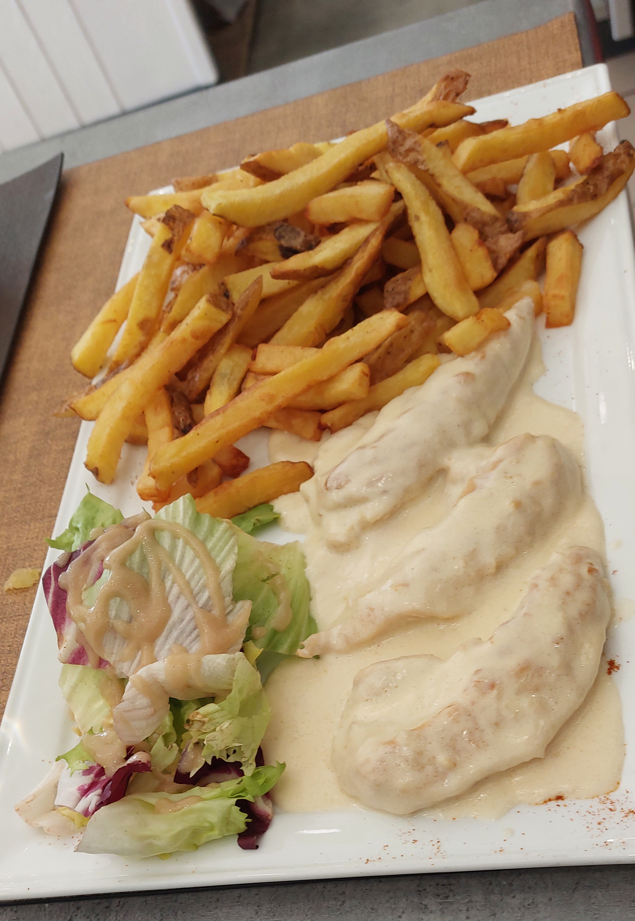 La moitié des frites étaient desséchées. Escalope soit disant forestière : juste un champignon.Mais surtout ce que je n ai pas apprécié c est la réaction des serveuses quand je leur ai fait part de mon ressenti.Elles m ont prise de haut et ont refusé la critique. Au lieu de dire qu elles étaient désolées, elles ont mal réagi. Pas du tout pro.