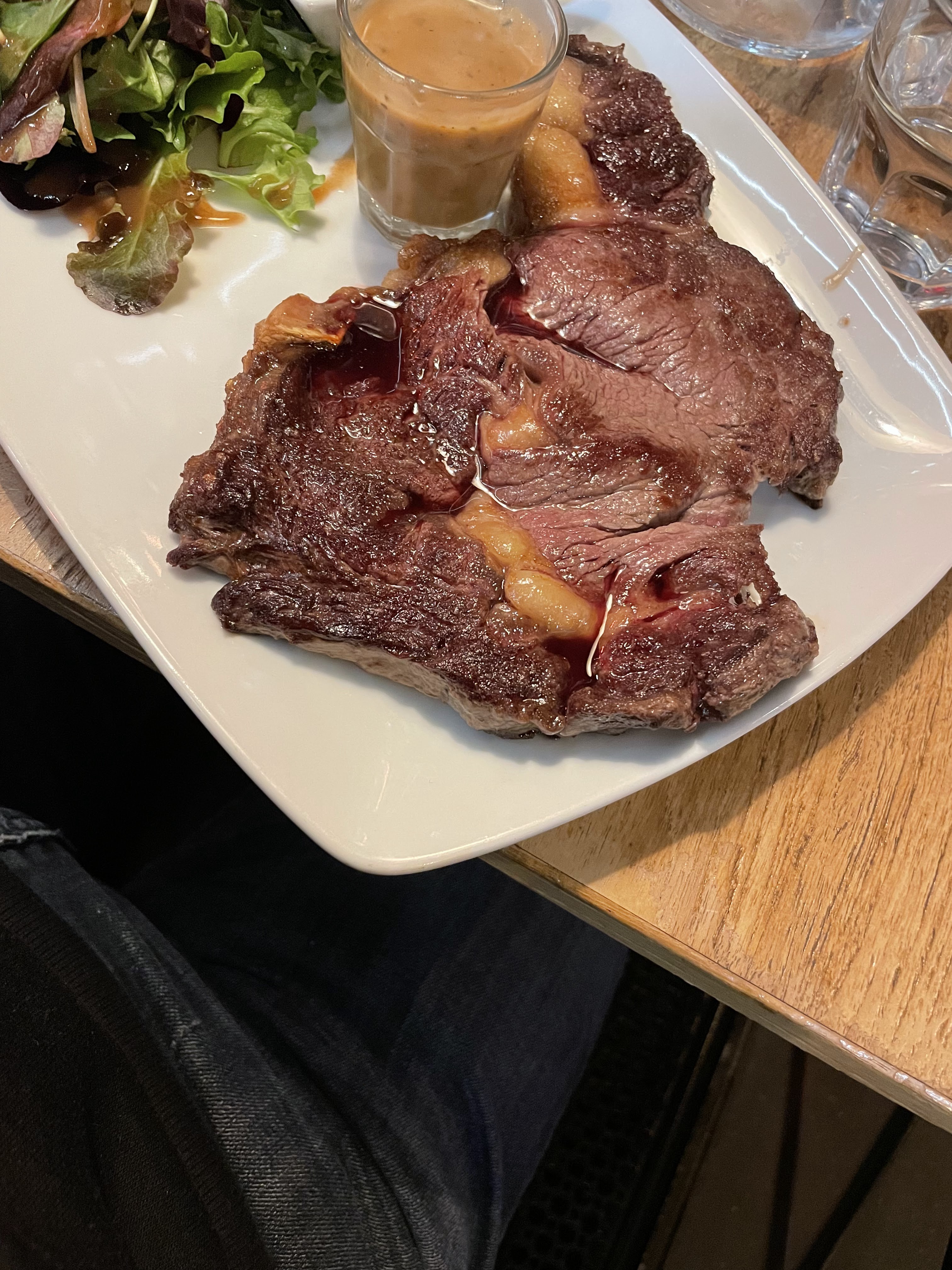 Les tables étaient un peu exiguës car elles étaient plaquées contre le dos des visiteurs de la table voisine, mais le restaurant dégage néanmoins une atmosphère calme et agréable. À plusieurs reprises, il semblait que le serveur nous avait oubliés, mais tout s'est bien passé. Nous avons pris la salade Chèvre chaud, mais en fait c'était deux toasts au fromage à côté d'une salade de roquette, c'était pas mal, mais ce n'était pas la salade à laquelle on s'attendait. Je dirais que cet endroit est plus adapté pour prendre une bière entre amis ou simplement venir prendre l'apéritif, mais pas pour dîner.