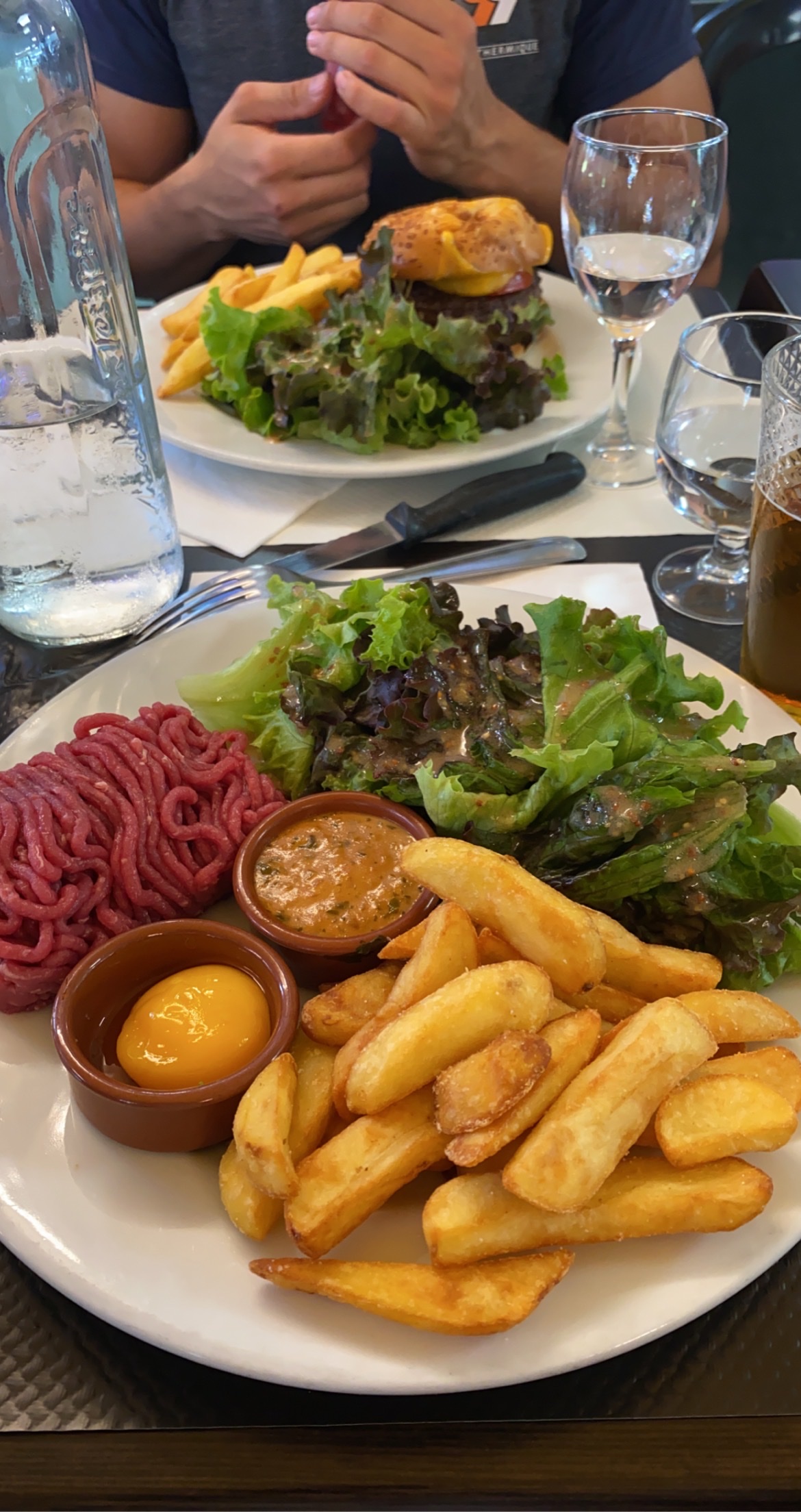 Le burger soi-disant saignant était archi cuit, le pain pas vraiment adéquat au burger car sec aussi. La salade et les frites étaient très bonnes et bien servies. Je précise j'adore la viande saignante. Si les plats sont maintenus au chaud, ne prenez pas ça... Le café gourmand c'est du n'importe quoi: un macaron, un mini tiramisu et une mini tarte citron meringuée, vu le prix cela fait cher. À refaire une autre fois pour un autre plat.
