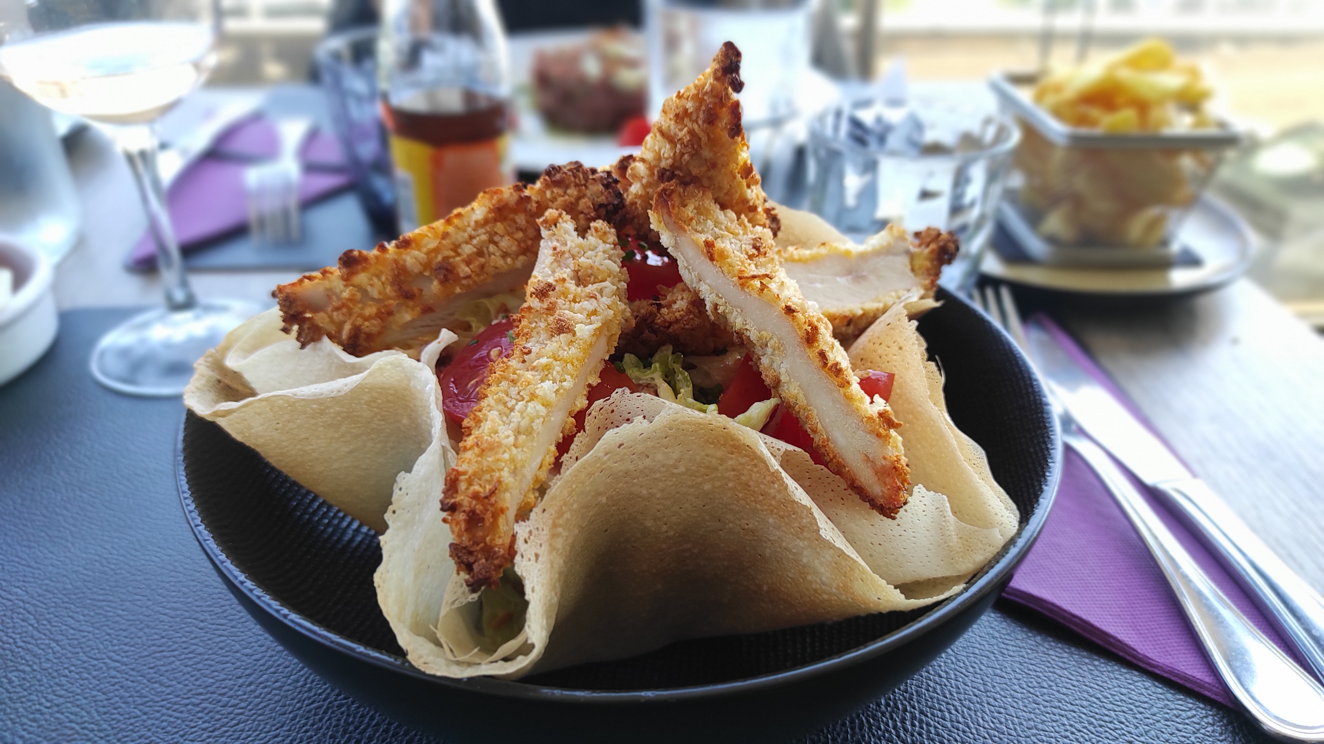 Salade César très bonne (servie dans une feuille de brick je crois qui malheureusement ramolli un peu avec la sauce, trop présente!) , les frites font parties des meilleures que j’ai mangées, les burgers sont très bons aussi. Malheureusement nous n’avons pas pris de dessert car nous étions en terrasse et trop de fumeurs... nous sommes vite partis.