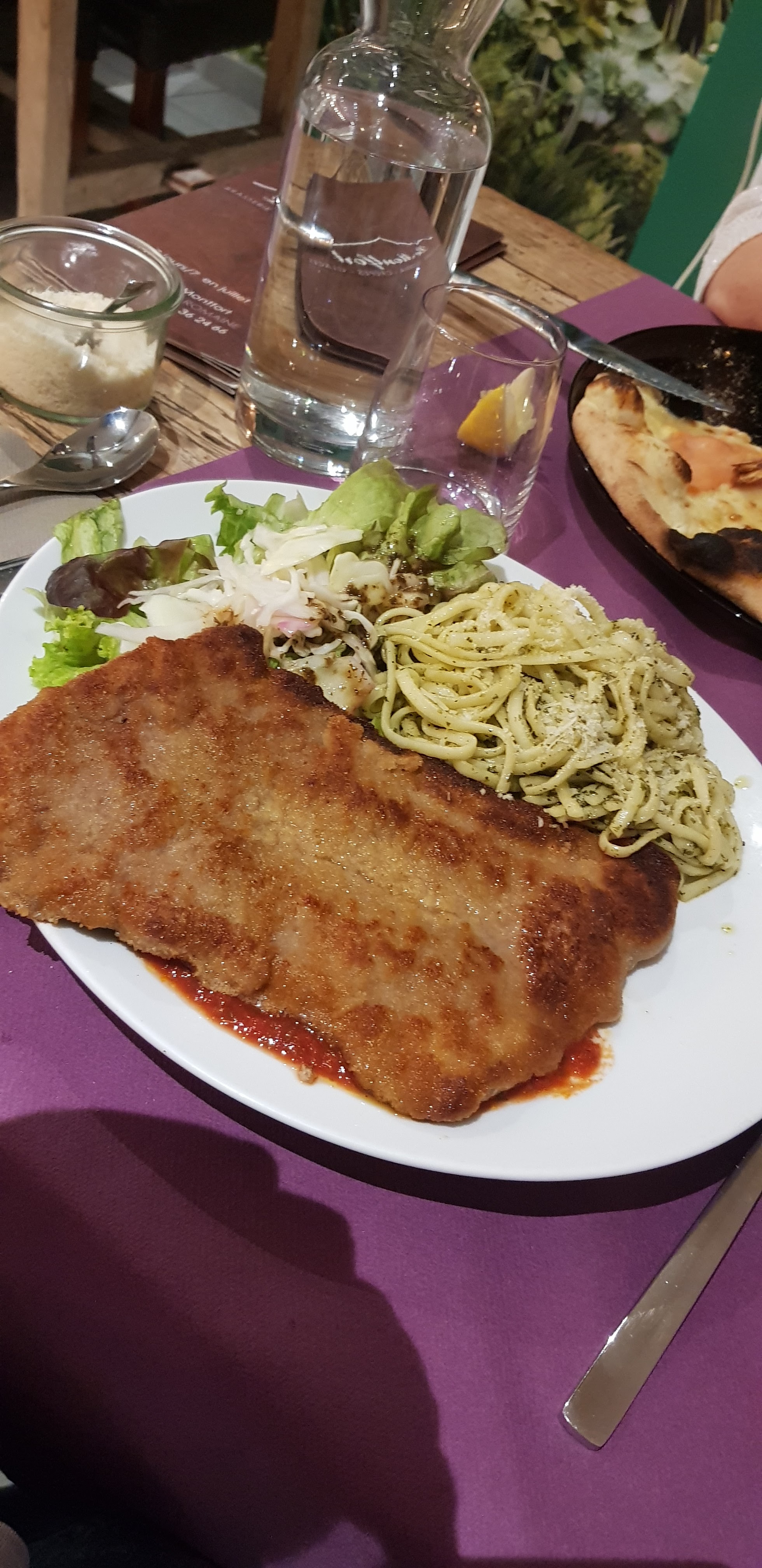 On en sort.... un avis a chaud... Au menu pour nous, une pizza norvégienne et une escalope milanaise. La pizza très bonne, généreuse et la pâte j ai adore.. Escalope milanaise, bien pané, de bonne taille, pas trop cuite, tendre, les liguines au pesto bonne et un pesto pas trop fort en goût... Pour le dessert, un tiramisu(sans oeuf👍) magnifique et pas trop sucré. Et un crumble au fruit avec un vrai chocolat fondu.... un régal. Pour couronner le tout, nous avons pris le temps de discuter avec le patron, sympa et qui sait écouter l avis de ses clients. Au final, c etait bon, pas excessif et un personnel sympa Je recommande...