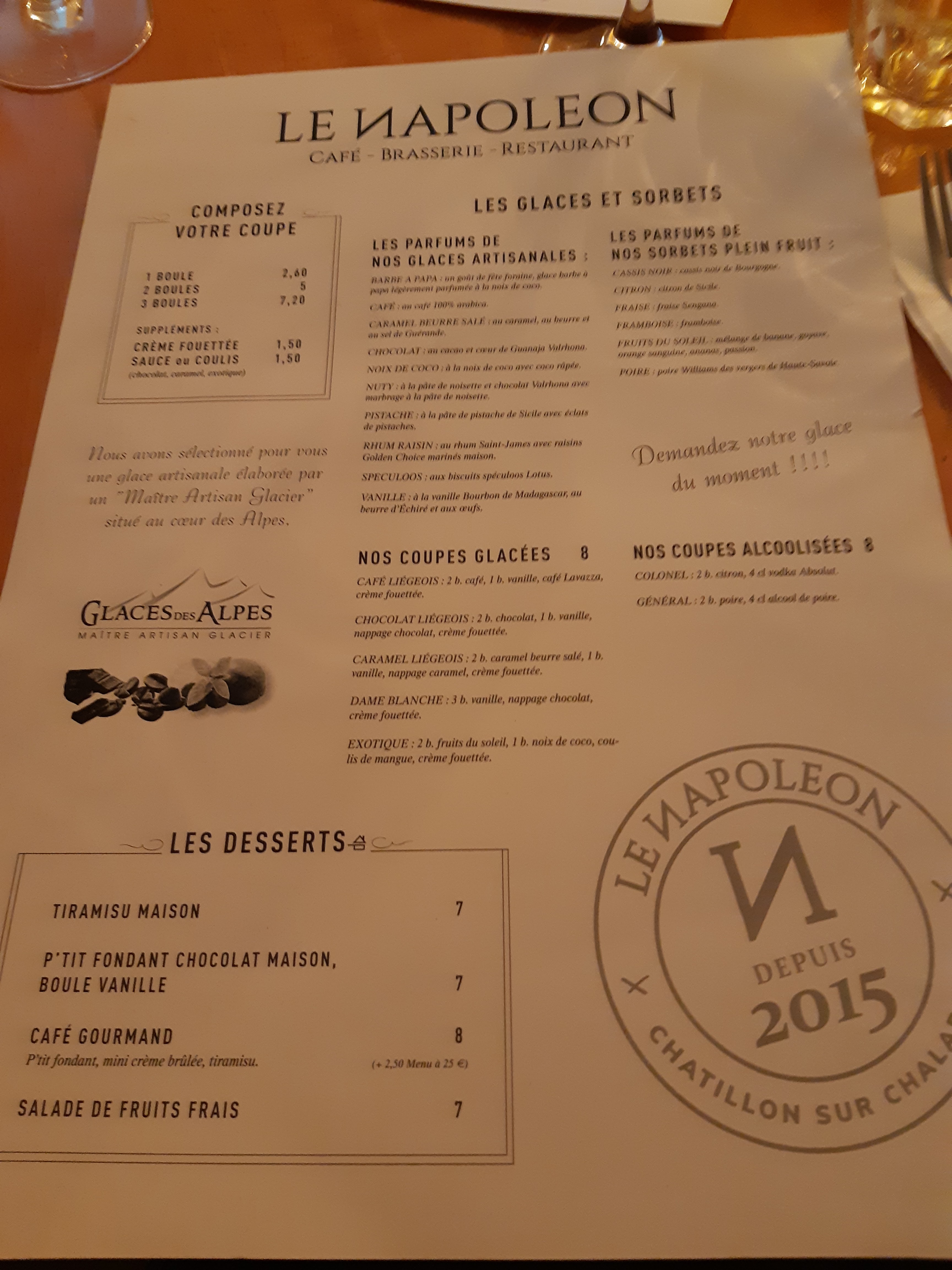 J'avais entendu beaucoup de bien du Napoléon, nous avons dû manger à l'intérieur à cause du temps, dommage, la terrasse à l'air sympa. Beaucoup de monde donc beaucoup de bruit. Menu du jour un peu cher par rapport à ce qui se pratique dans le coin d'autant qu'ici le fromage n'est pas inclu. Bon choix de bières Menu pas mal , service rapide (un peu trop). Je reste déçu par rapport à ce qu'on m'avait dit car il n'y a rien qui justifie le supplément de prix. Je connais mieux à chatillon