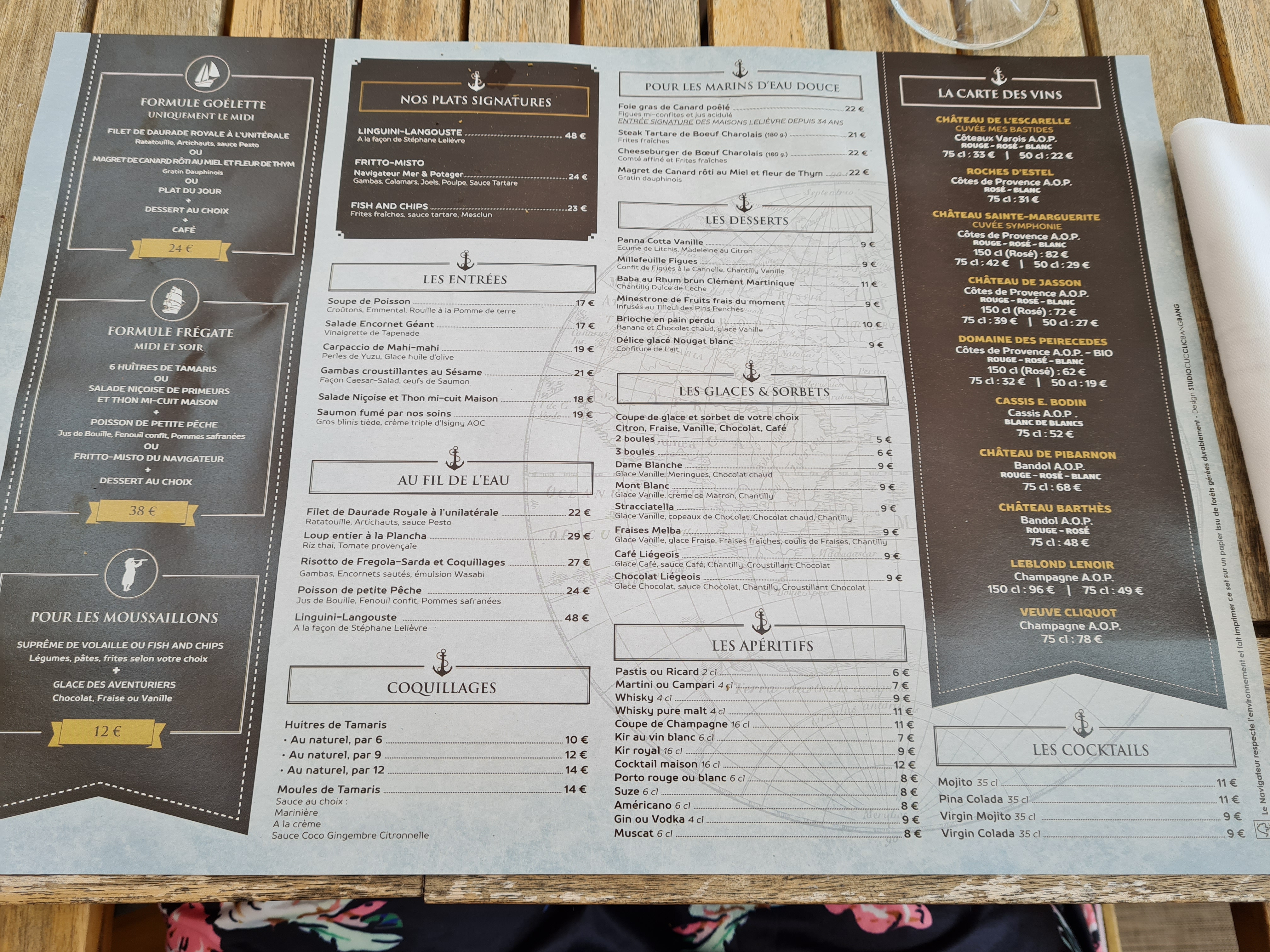Cela fait plusieurs fois que nous mangeons au navigateur, et cette fois ci c’était pas top, la reprise après Covid paraît compliquée nous ne sommes pas pénibles mais là il fallait être patient. Les serveurs se trompaient de tables régulièrement avec les plats. On nous a amené une bouteille de vin il a fallu réclamer son ouverture au bout de 20minutes... et nous nous sommes servis nous mêmes. Nous avons mis 3h00 à manger une entrée plat dessert. Le serveur s’est excuser sur le temps du service prétextant ne pas être assez nombreux. Peux être mais nous n’en sommes pas responsable. Nous avons pris le plat référence pâtes à la langouste, la langouste était très sèche et paraissait avoir patienté très longtemps avant d’arriver sur notre table. Et on ne vous explique pas tout, L’apéro Piniacolada pas bon , le jus d’huîtres dans le sac à main....cela ne sert rien de faire enfiler des costumes à vos serveurs si ils ne sont pas à la hauteur.