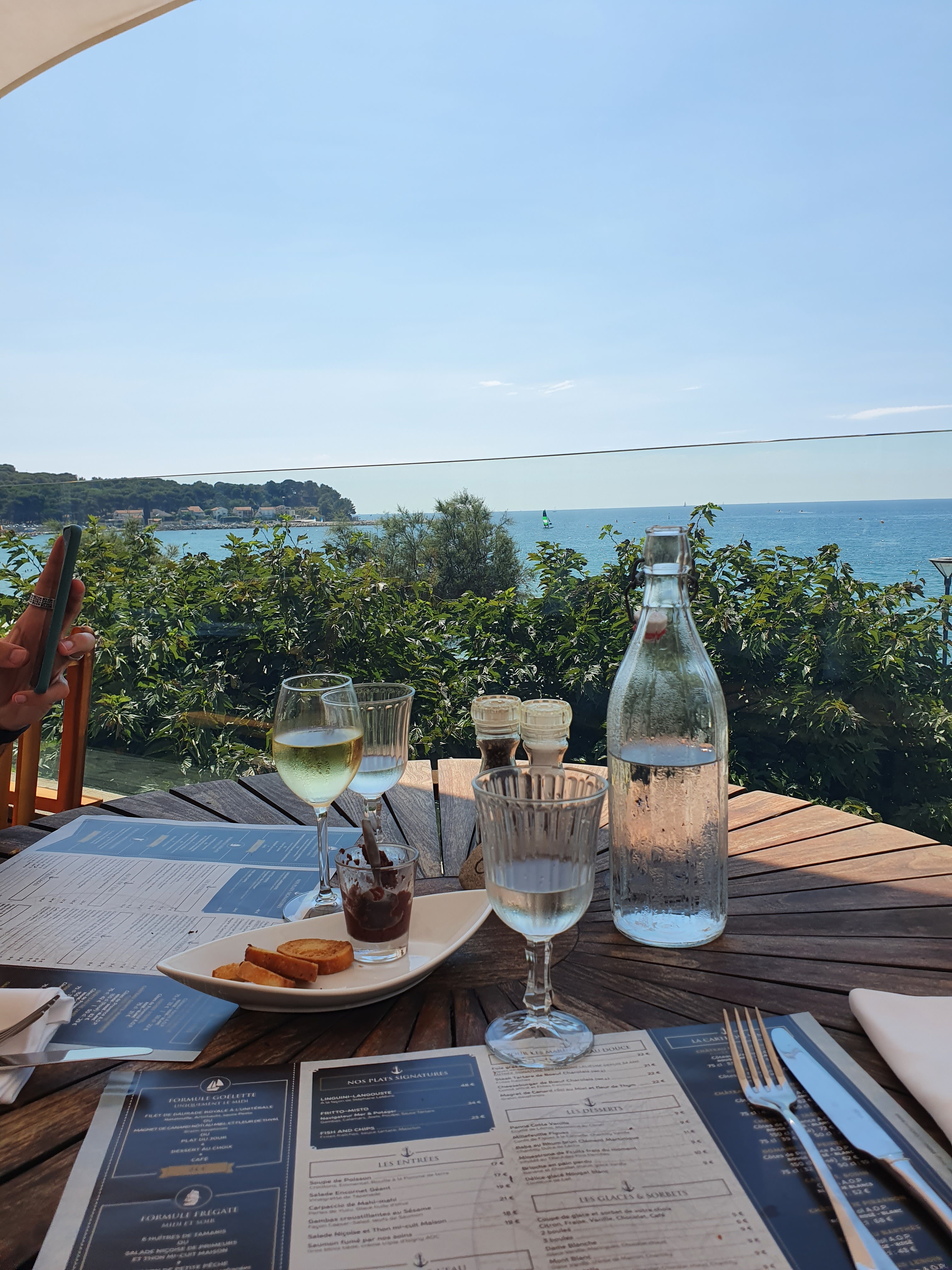 restaurant agréable, belle vue sur les deux frères, la demoiselle (italienne)qui s'est occupé de nous a été parfaite.Deux bémols : le garçon qui nous a servis manque d'expérience (service du vin et du plat principal avec sauce sur la table) et le vin rosé ( bandol LAROQUE pas terrible). dommage!. on reviendra pour essayer l'autre restaurant.