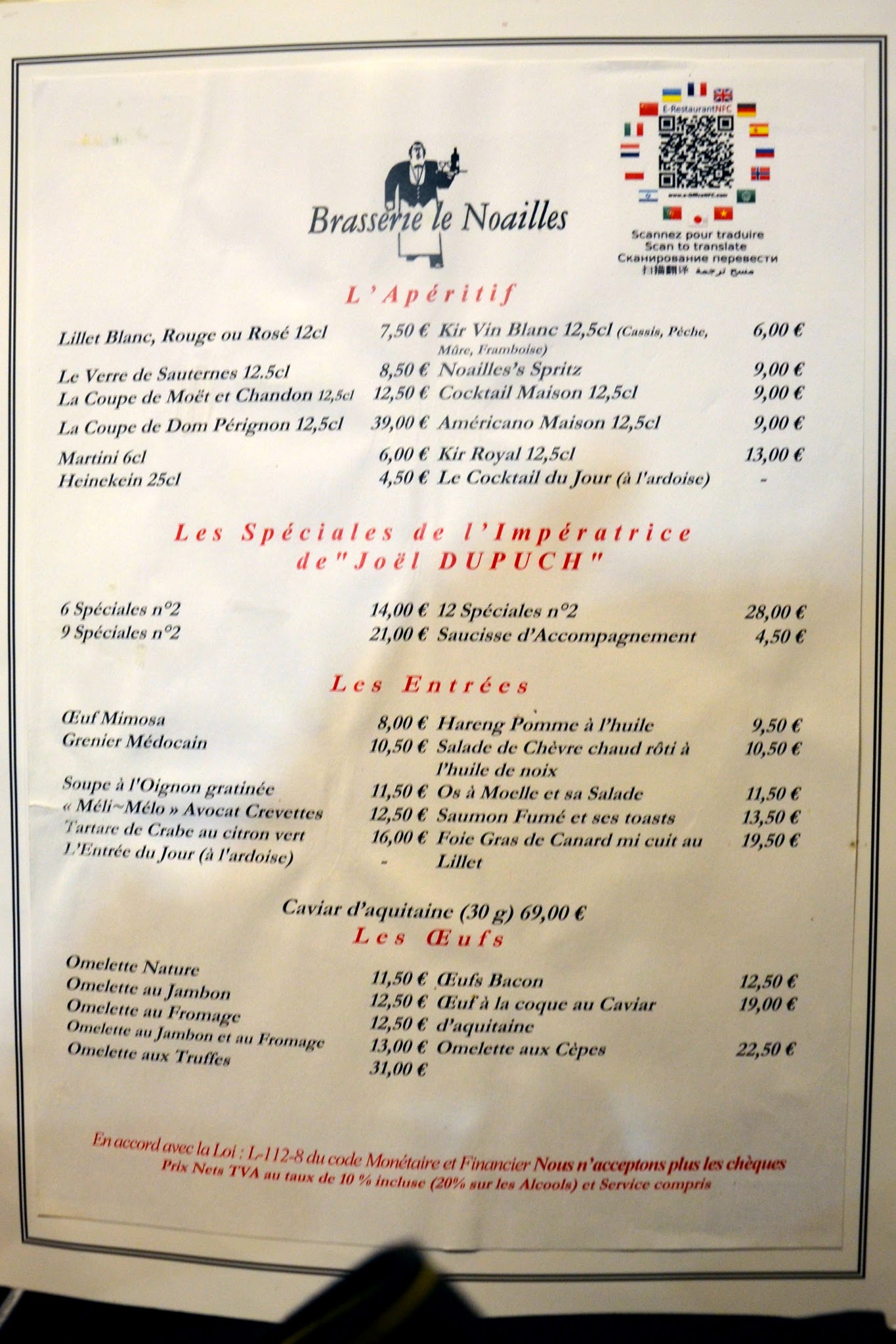 J' ai connu ce restaurant en des temps meilleurs, le 14/02/23 quelle déception et quel effarement ! : Les places à l'intérieur sont réservés aux habitués, ai tenté de déjeuner (après avoir réservé) en terrasse, les tables se touchent toutes, aucune intimité, Patron peu aimable, serveur très professionnel et gentil, nourriture infame : St.Jacques bouillies baignant dans une sauce blanchâtre dans laquelle des cèpes insipides trempaient ! heureusement la promiscuité nous a offert le spectacle. Il nous tardait de partir.....Le vrai Noailles est mort.