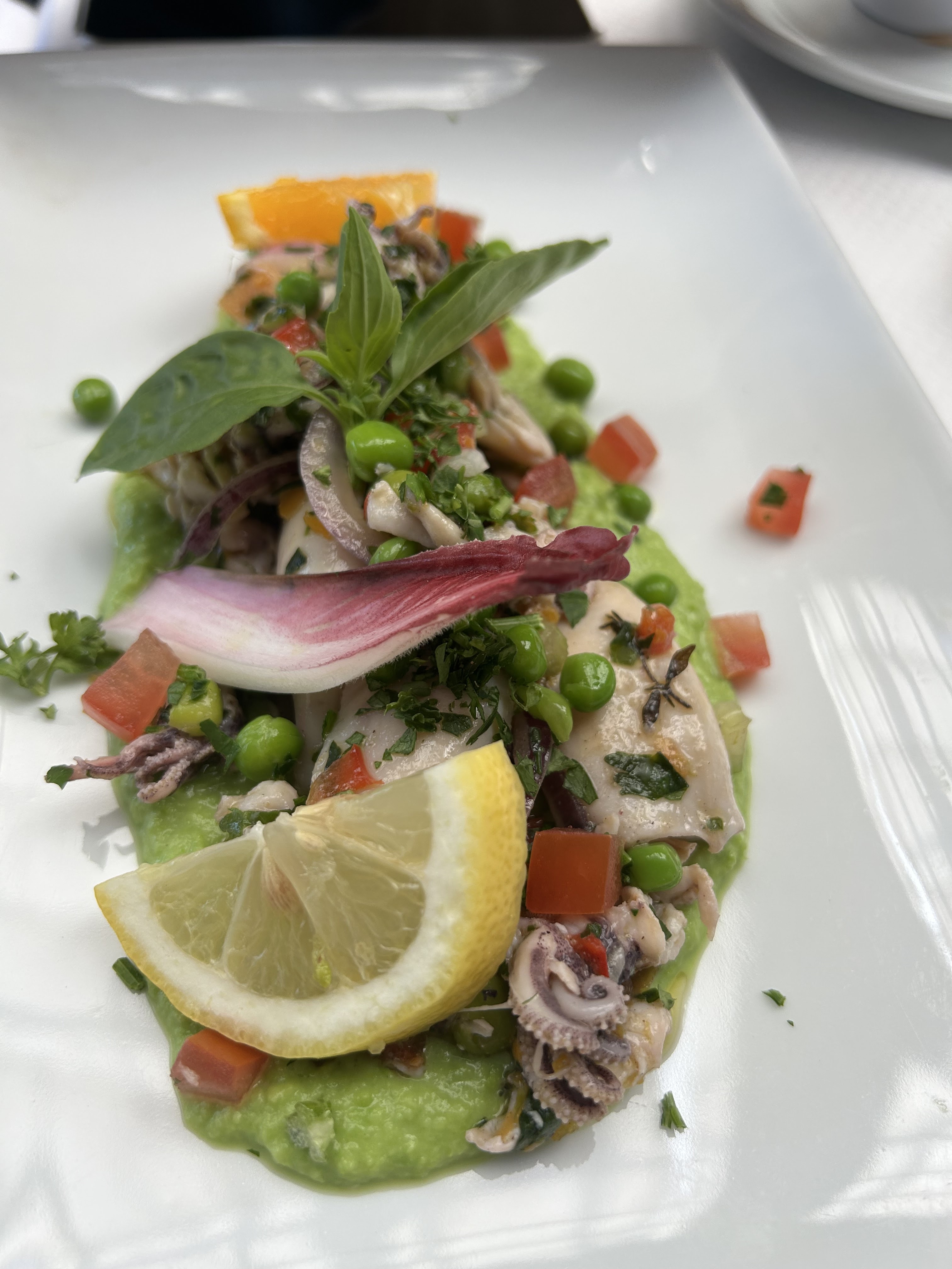 gaspacho acheté directement en brique, j'ai le même dans mon frigo, salade de poulpe gelatineuse et sans gout, sortie de boîte ? on peut se poser des questions sur le reste de la cuisine. Toilettes dégoûtantes, une maison qui vit sur son passé. Dommage mais ne correspond plus à son standing.