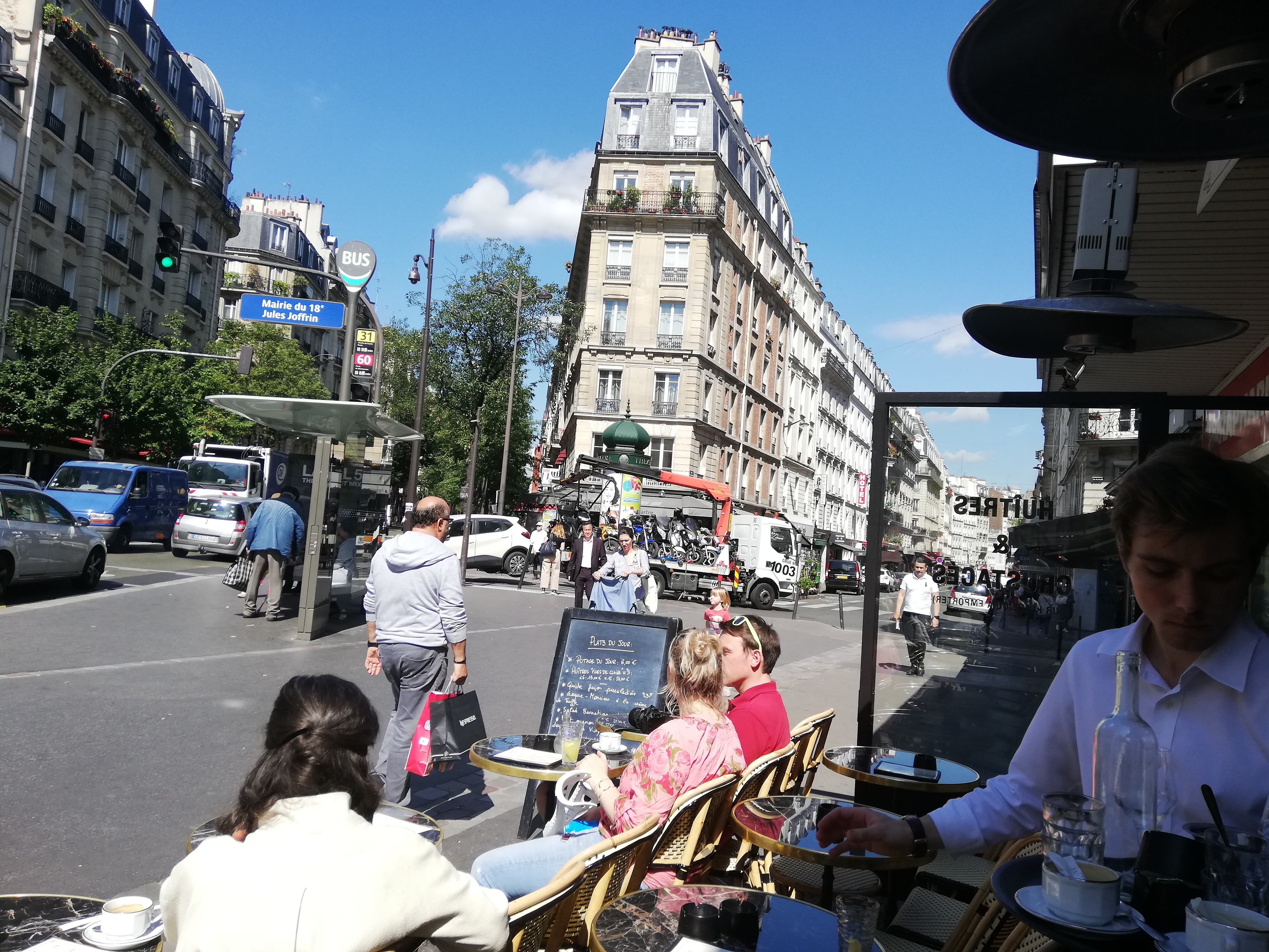 NOURRITURE Café avec vue. Paris est une grande ville mais les Parisiens restent dans leur quartier. Ils adorent prendre le café du matin au café « en bas de l’immeuble ». Les touristes disent que les Parisiens sont toujours de mauvaise humeur et grossiers. Mais si vous prenez le temps de les regarder, ils sourient parfois. J'apprécie prendre mon petit déjeuner express dans ce restaurant-bar avec vue sur la mairie du 18ème. Boisson chaude, jus frais et croissant au beurre. Il y a aussi une belle vue sur une vieille église.