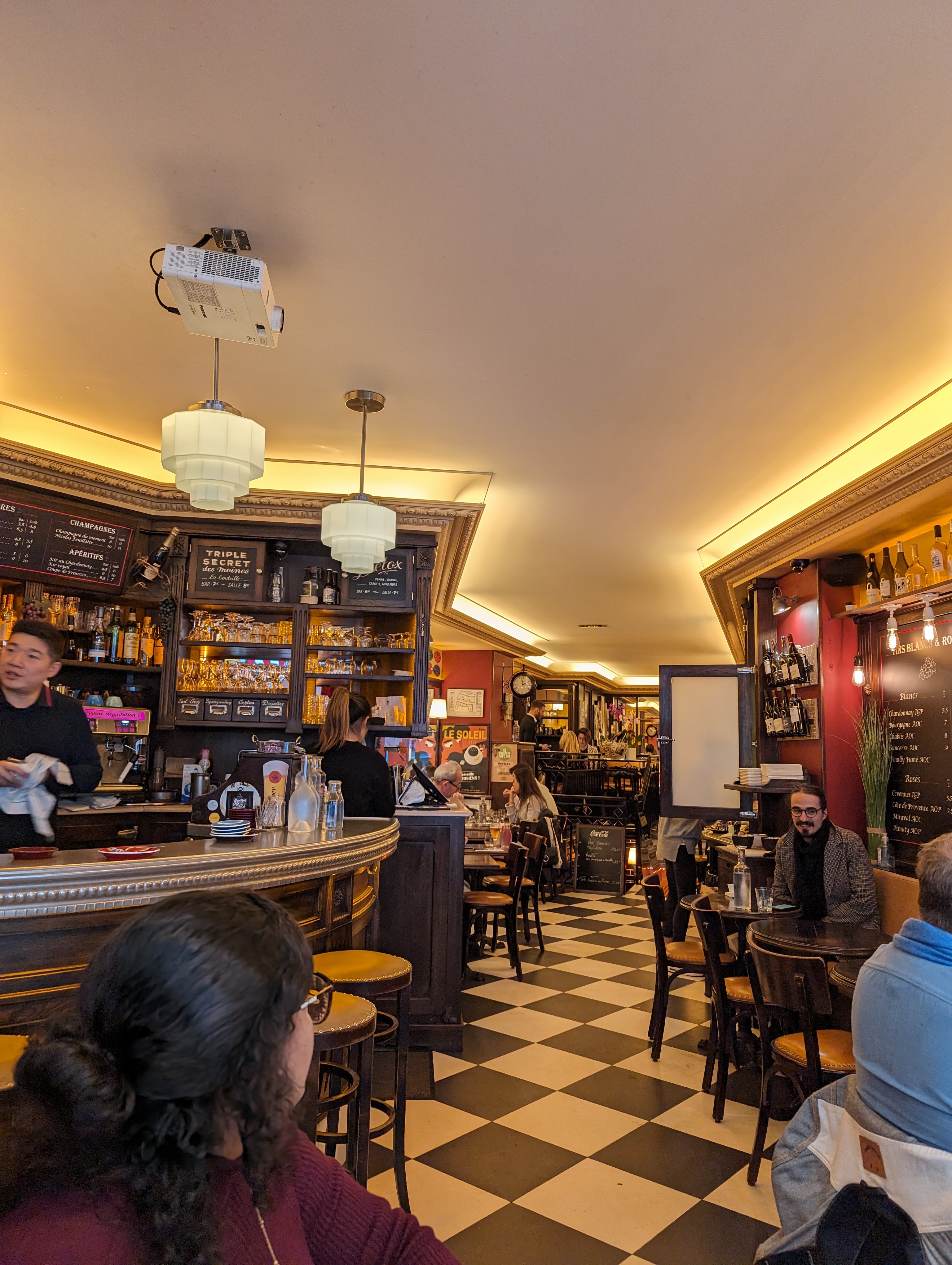 Notre famille, dont deux jeunes enfants, a visité ce café pour le dîner. Nous l'avons choisi car il était proche de l'endroit où nous logions pour un week-end à Paris mais avons été ravis de l'expérience. Les deux hommes qui travaillaient étaient très sympathiques et serviables avec nos enfants. La nourriture était préparée rapidement et tout était délicieux. Nous reviendrons absolument dans ce café. De nombreux autres cafés parisiens pourraient apprendre quelque chose de celui-ci !