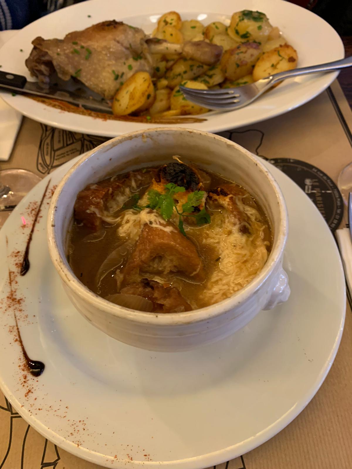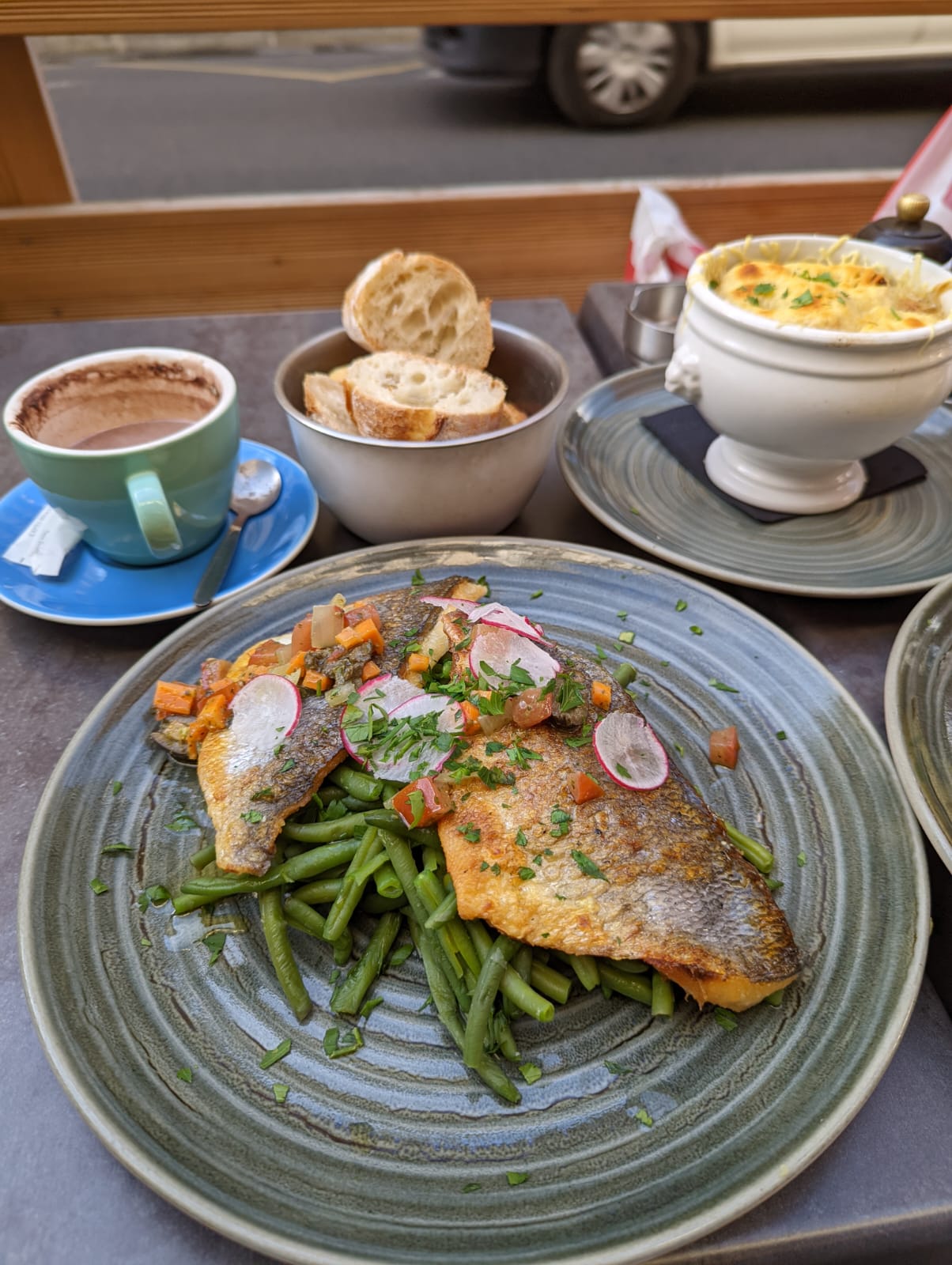 Notre première visite dans un restaurant français à Paris et a été accueillie avec une qualité alimentaire très élevée 👍🏻 J'ai commandé 2 plats principaux et 1 apéritif à partager entre moi et ma femme. 🦆 le canard confit était super, le meilleur que j'ai jamais mangé jusqu'à présent ! Très bien cuit, tendre à l'intérieur et croustillant à l'extérieur. La saveur était également au rendez-vous, pas trop salée tout en conservant tous les effets d'assaisonnement. 🐠 la dorade (filet de daurade) était très propre de la meilleure des manières possible également, peau croustillante et viande tendre, définitivement fraîche ! 🍲 la soupe à l'oignon était également bien équilibrée, même si nous n'avions aucun point de référence quant à sa qualité par rapport aux autres, étant donné que c'était notre toute première - mais le fromage et les oignons s'accordaient très bien. ☕️ le chocolat était bon, pas trop laiteux et pas très épais comme on le sert habituellement en Europe Dans l’ensemble, c’est un endroit idéal pour prendre un repas en plein air 👍🏻