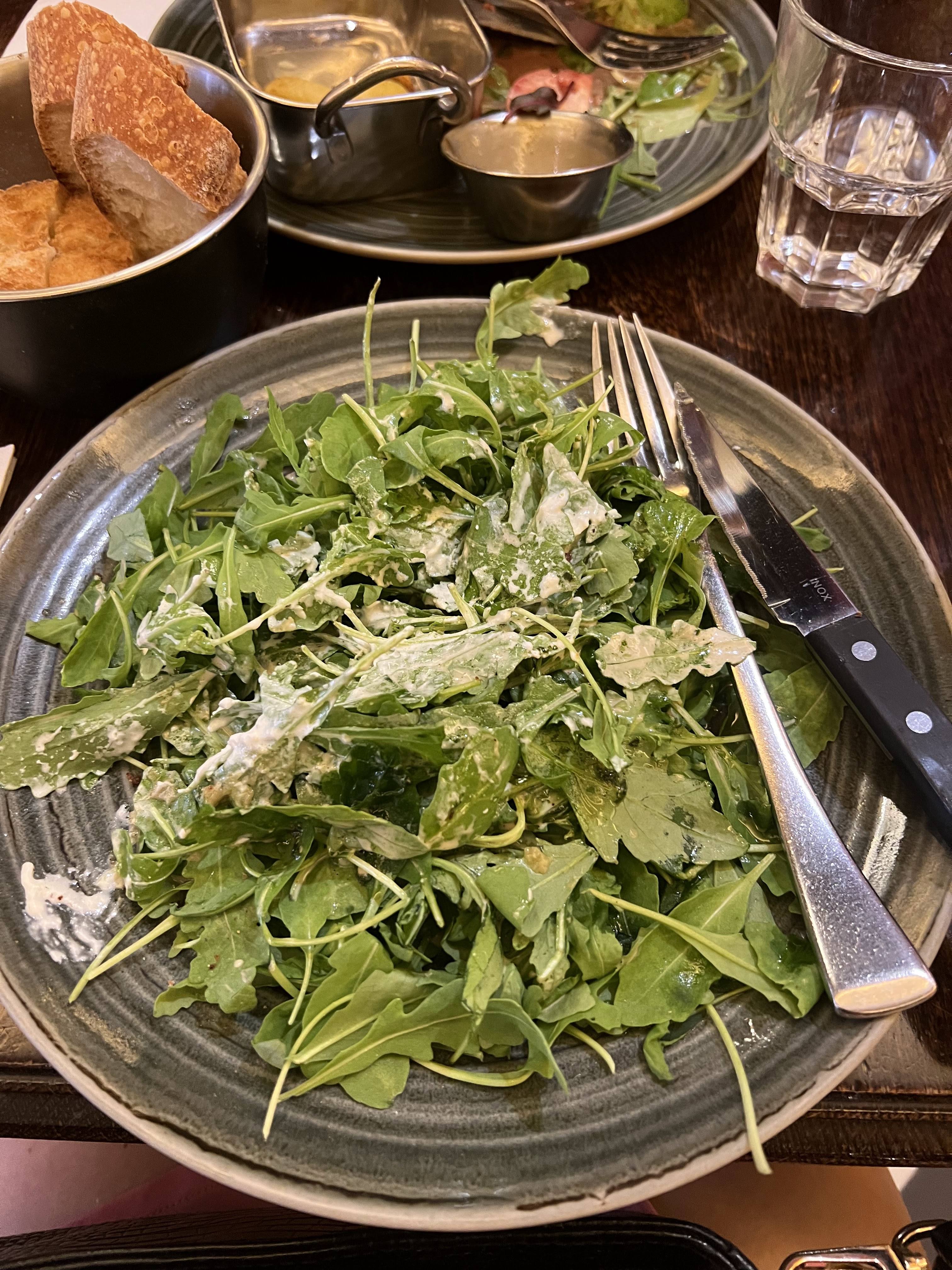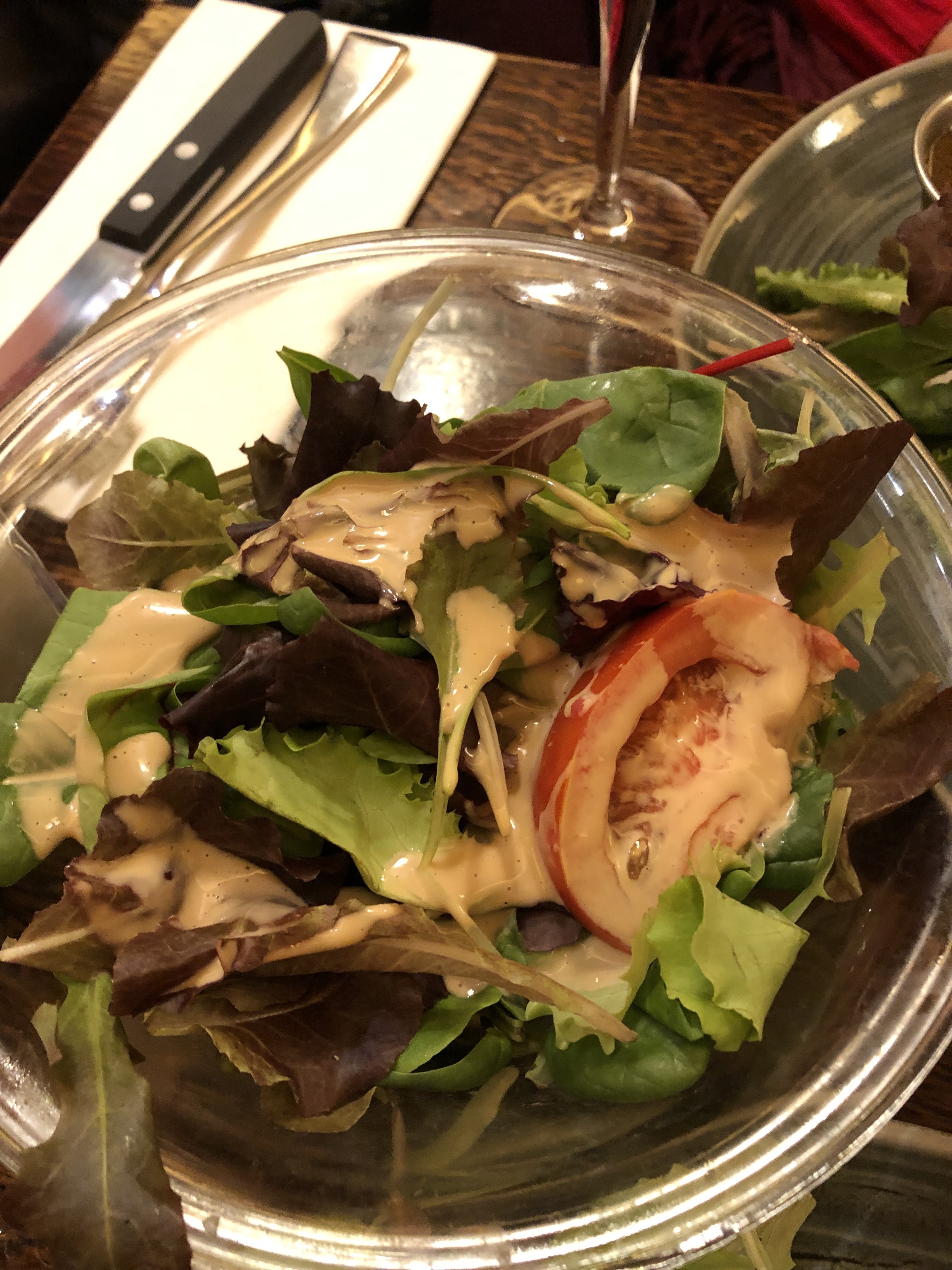 La salade était super acide et le steak mi-saignant était un morceau de viande bon marché bien cuit et à peine comestible.