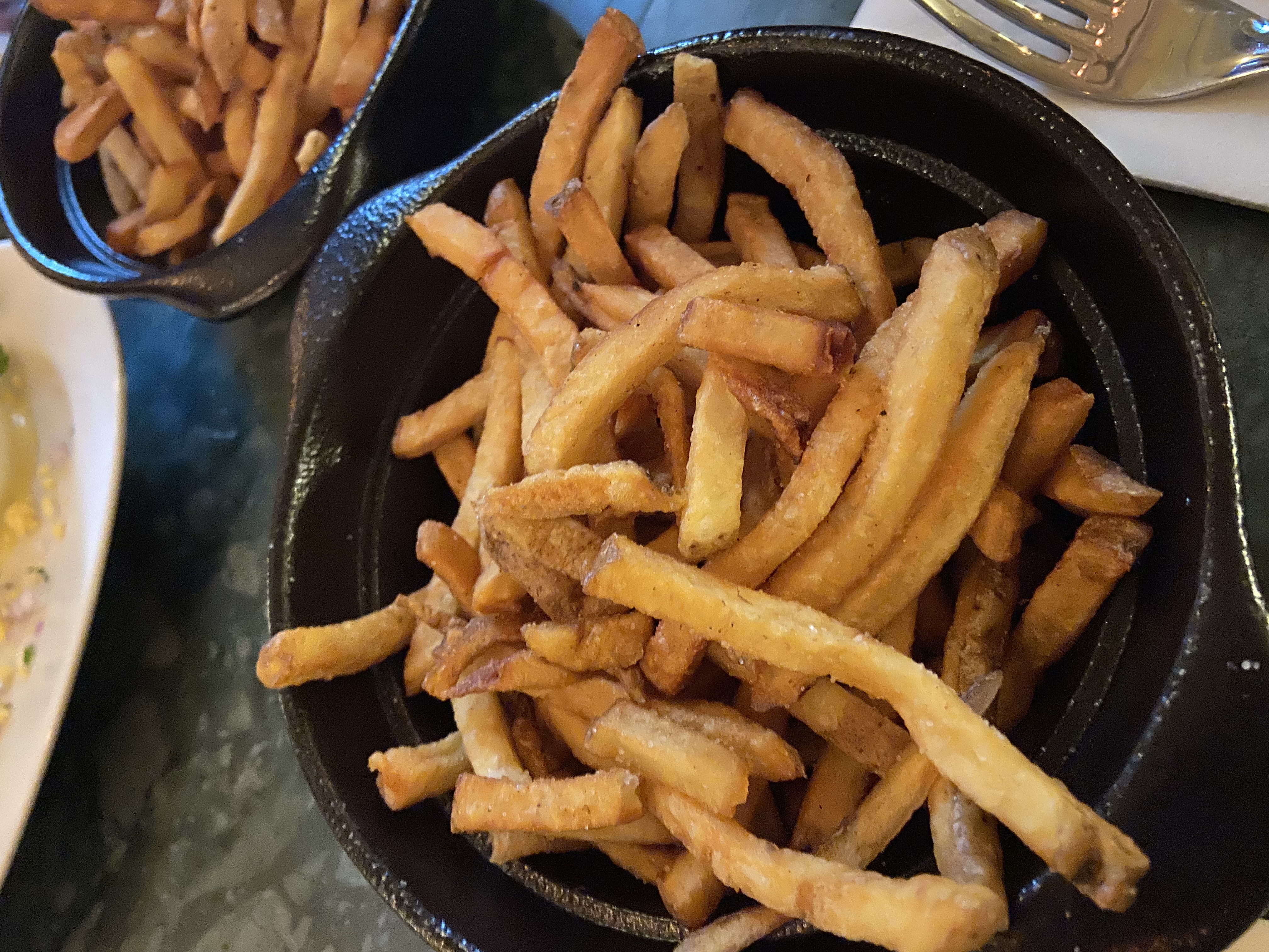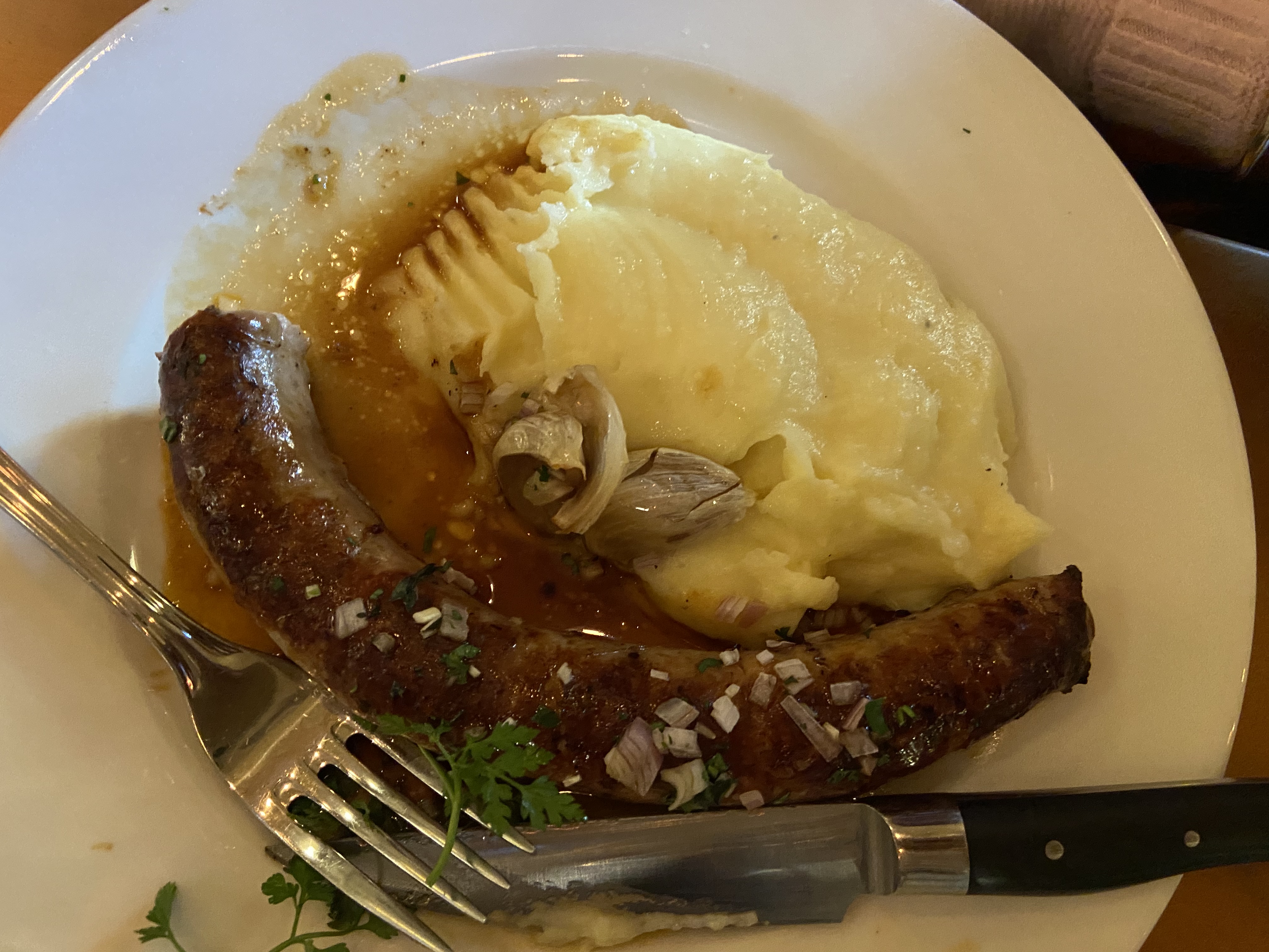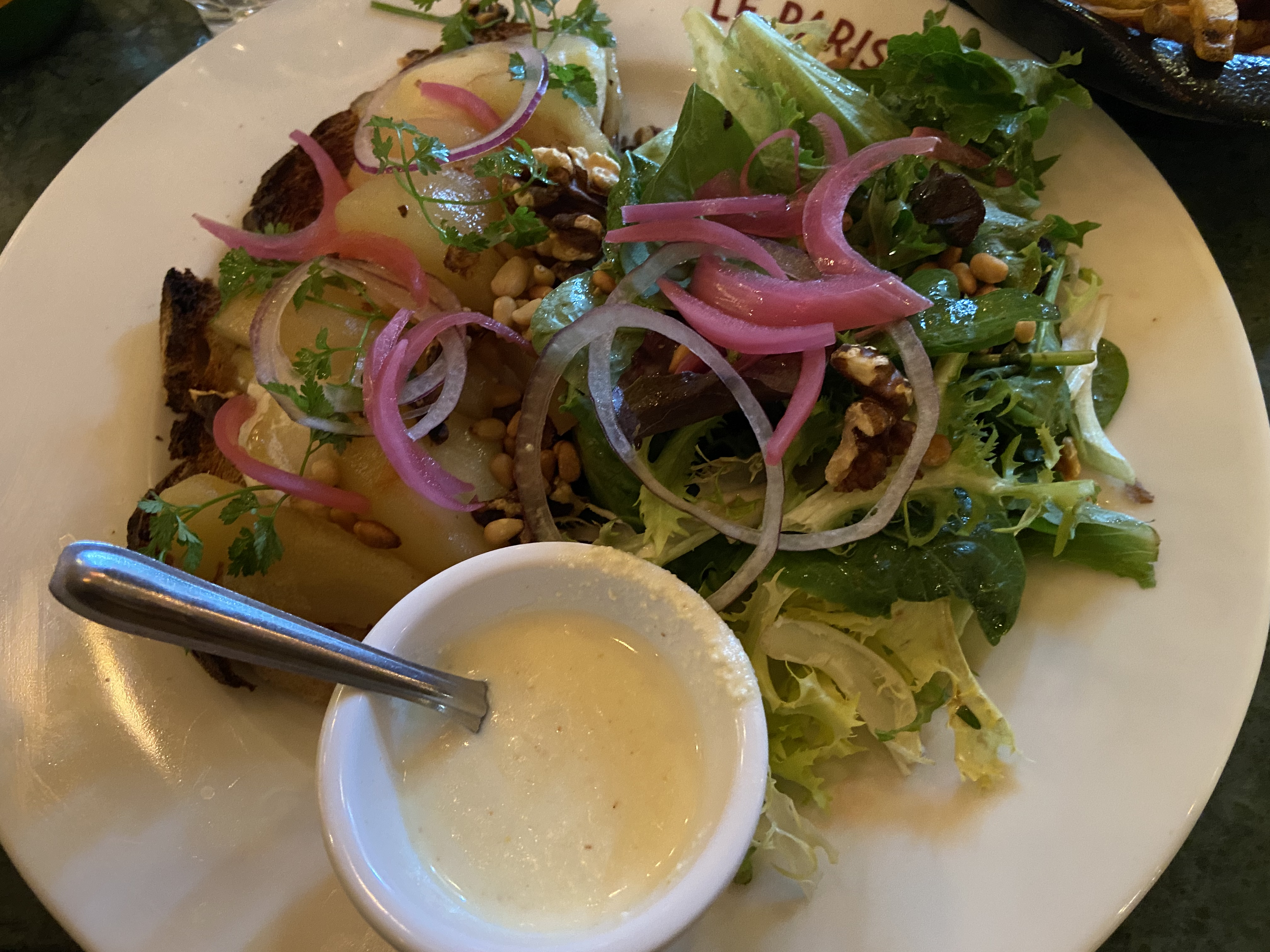 Je ne m'y attendais pas mais ce bistro propose des options végétariennes pour moi et ma fille végétarienne… nous avons eu la salade du chèvre sans bacon, œufs mimosa et frites. C'était parfait pour un dîner sans trop en attendre, vous savez ? En dessert, elle a pris une salade de fruits et j'ai partagé une tarte au chocolat et au caramel avec mon mari et ma belle-mère, qui. Au fait, il y avait les côtes de porc et la saucisse de Toulouse. Ils ont dit que c'était vraiment bien. Le serveur était incroyablement sympathique et tout le monde voulait juste être sûr que vous passiez un bon moment. Ah ! Oui! il y avait de la musique !!!! J'ai vraiment aimé ça! Alors oui, venez passer un bon moment pour dîner… nous reviendrons c'est sûr.