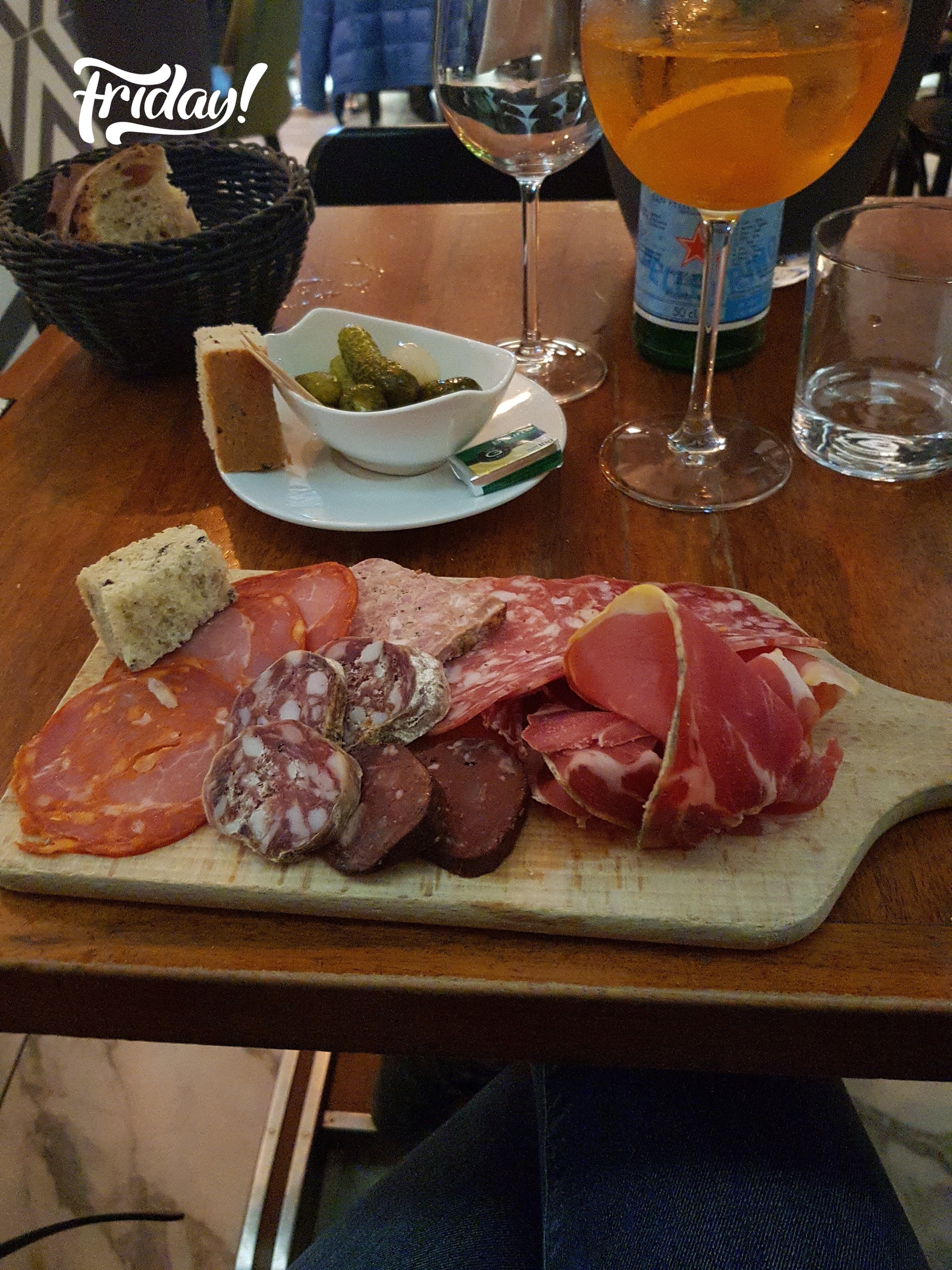Installé en terasse pour boire un verre entre amis, les serveurs sont très sympathique et l'happy hour vaut le coup, les cocktails sont bons et le cadre agréable. En revanche gros bémol sur la grande planche de charcuterie règlé tout de même 17€ et de portion ridicule... Il y avait plus de salade sur la planche que de viandes 😂. Nous avons même interpellé la serveuse en se demandant si il n'y avait pas eu une erreur sur la taille tellement ça nous a surpris et elle a osé nous en proposer une deuxième si on souhaitait davantage de quantité.... Heu le but d'une grande planche c'est de pouvoir la partager et non qu'elle subvienne à une personne. Je n'imagine pas ce que doit être la petite planche. Très déçu d'autant plus en comparaison au rapport quantité/qualité/prix des planches d'autres bistrots à proximité...