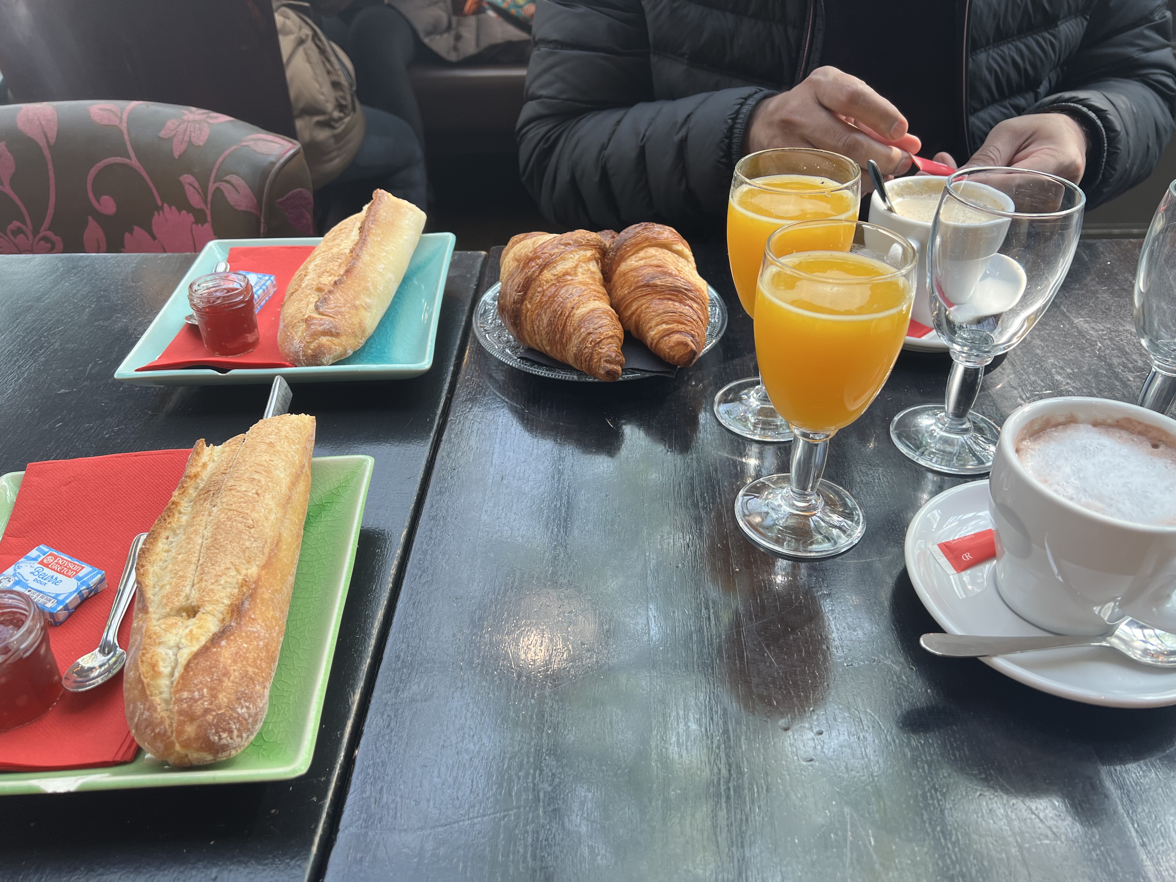 Petit déjeuner comme on l’aime : boisson chaude, jus pressé, tartine de pain, beurre et confiture, et croissant. Manque juste le choix avec une chocolatine ( clin d’œil au sud-ouest)