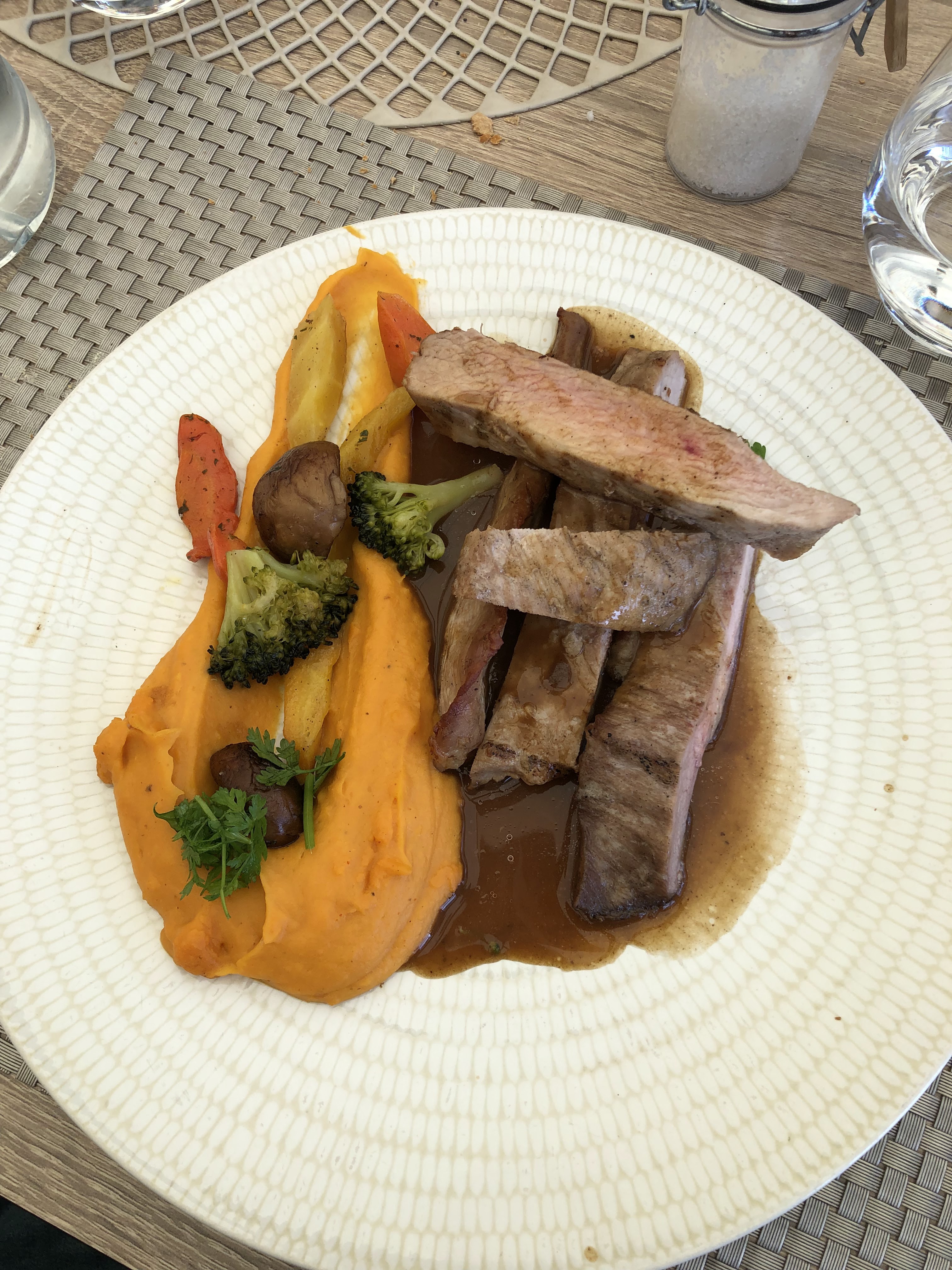 Super déjeuner en amoureux. La terrasse est superbe, l'accueil est très chaleureux et le service très attentionné. Petit tartare de bœuf en entrée très bon, ribs de porc mariné et frites en plat excellent. Tout était très copieux. Seul bémol le duo de fromage (la mimolette était très dure). Choix des vins variés. Je vous conseille de réserver ! Nous y retournerons