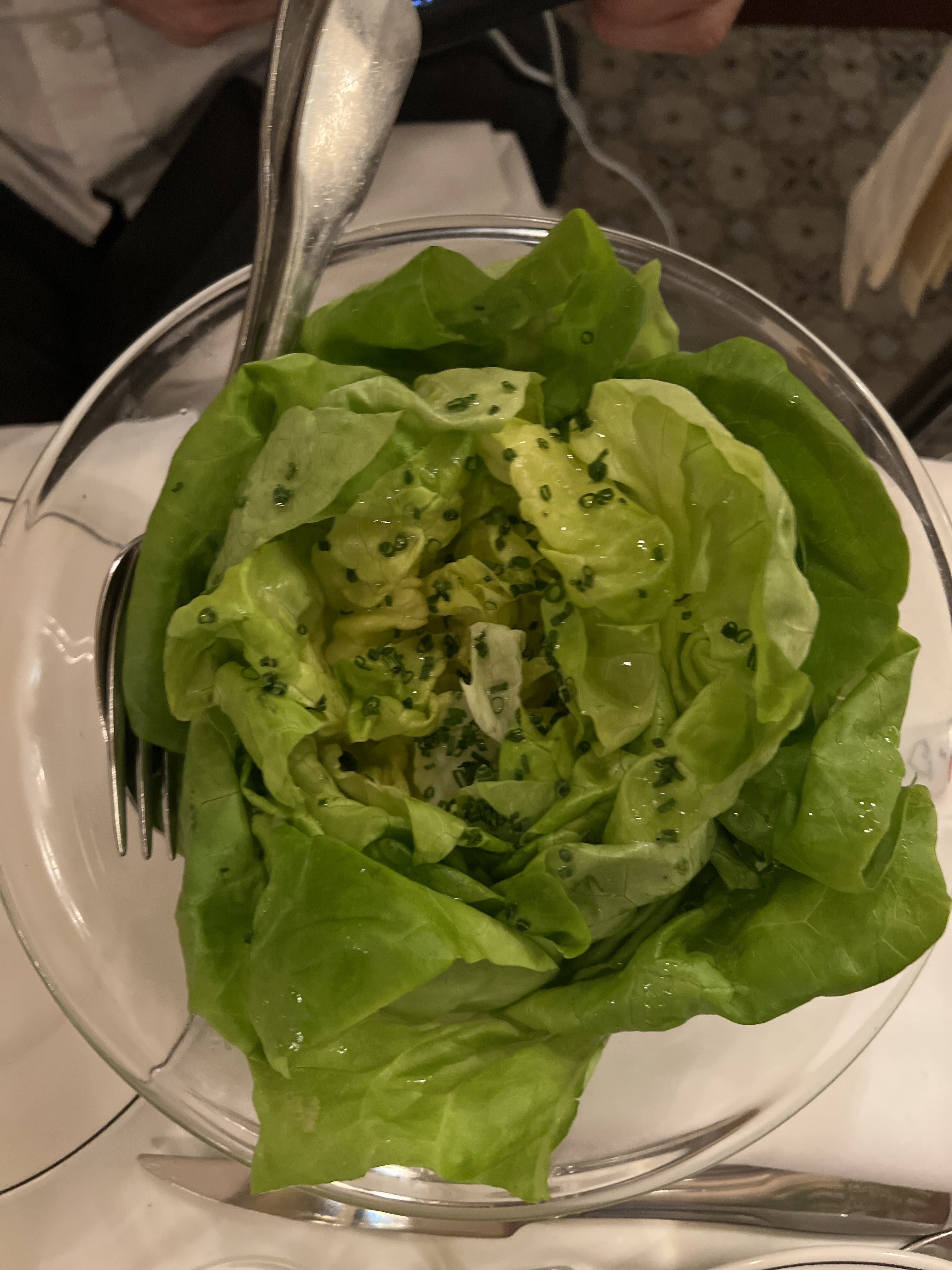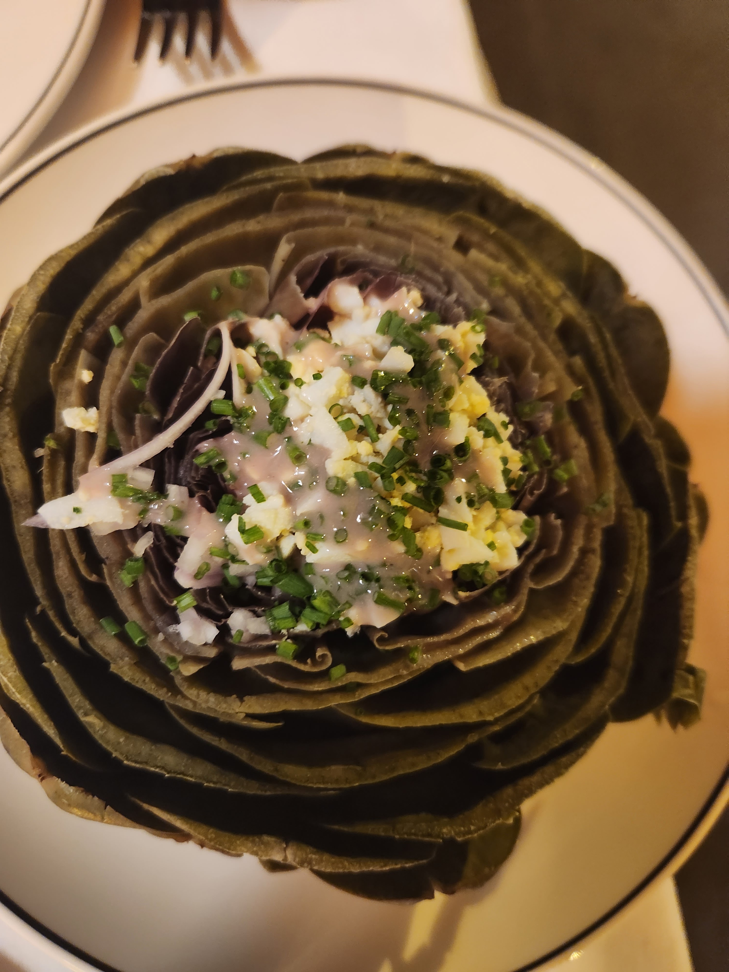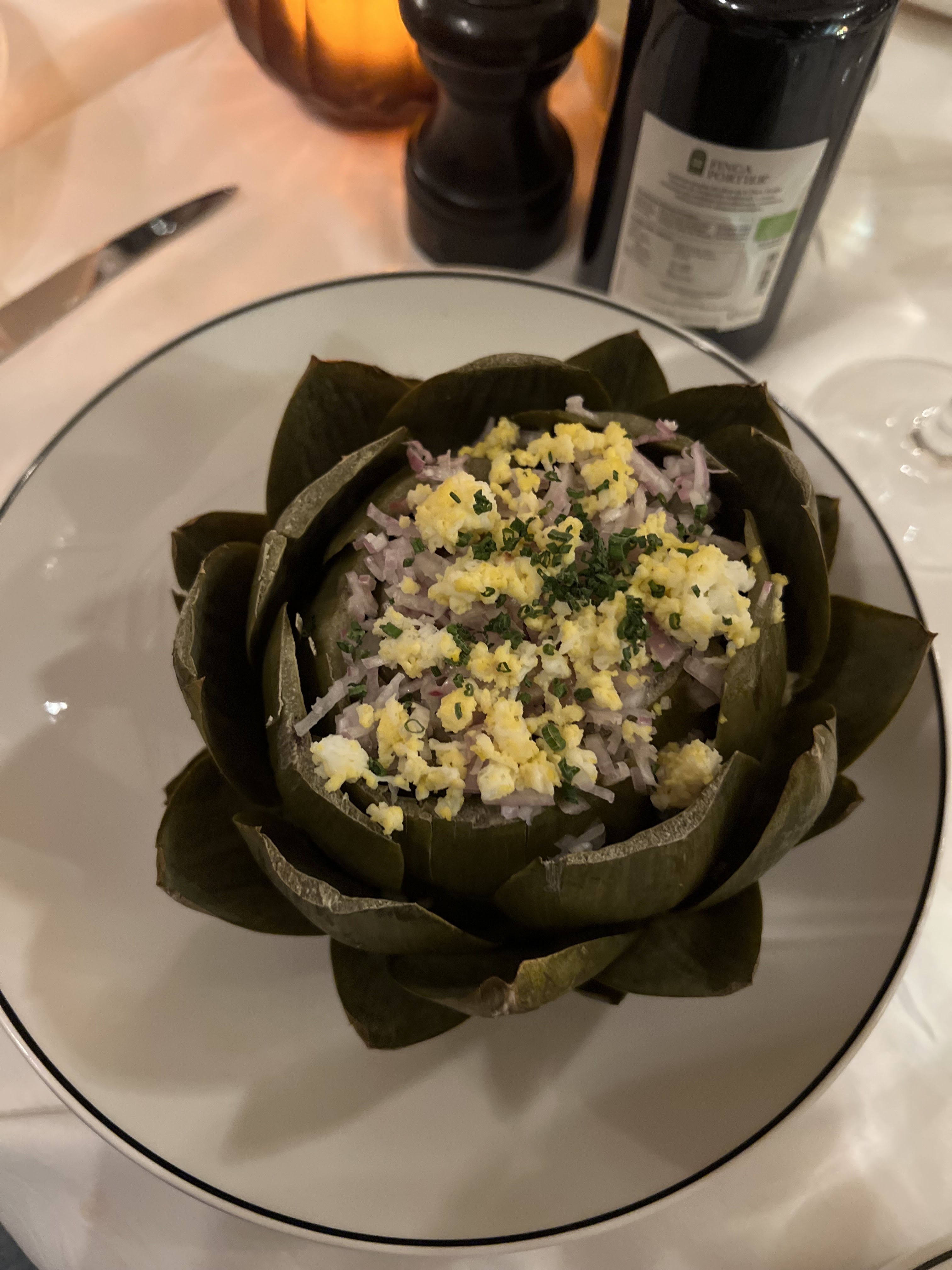 Artichaut incroyable! le steak tartare était magnifique. Saint Jacques excellent. Desserts ridiculement copieux et délicieux. Service très professionnel. Le seul inconvénient est le nombre de touristes américains importants…. Les Français étaient en infériorité numérique 10 : 1… Mais le restaurant est très sympa.