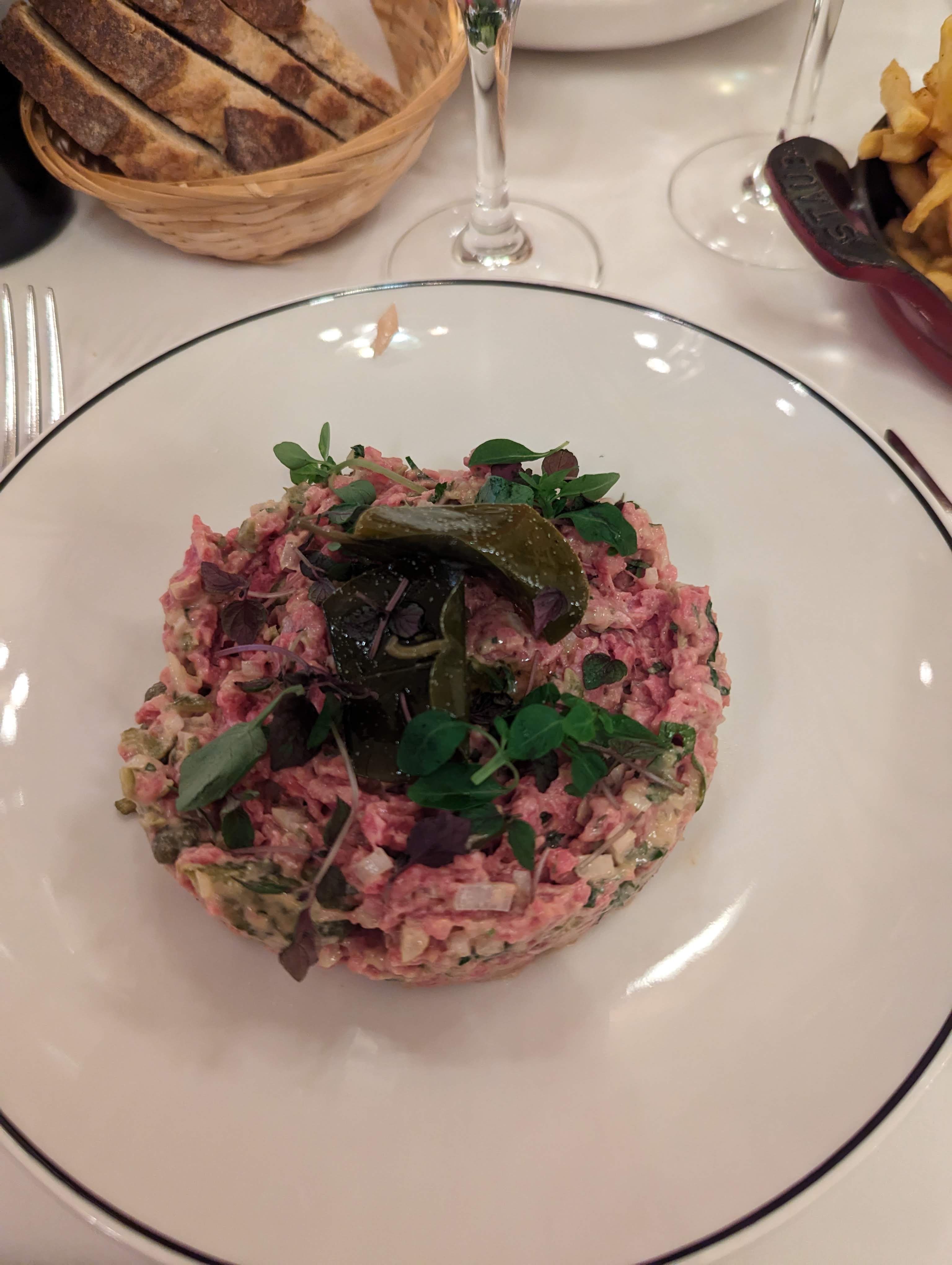 Un incroyable dîner parisien authentique - le personnel est sympathique et arrangeant avec les clients anglophones. Je recommande fortement de réserver car c'est un endroit très prisé. Je rêverai encore plusieurs jours du tartare de bœuf et des frites.