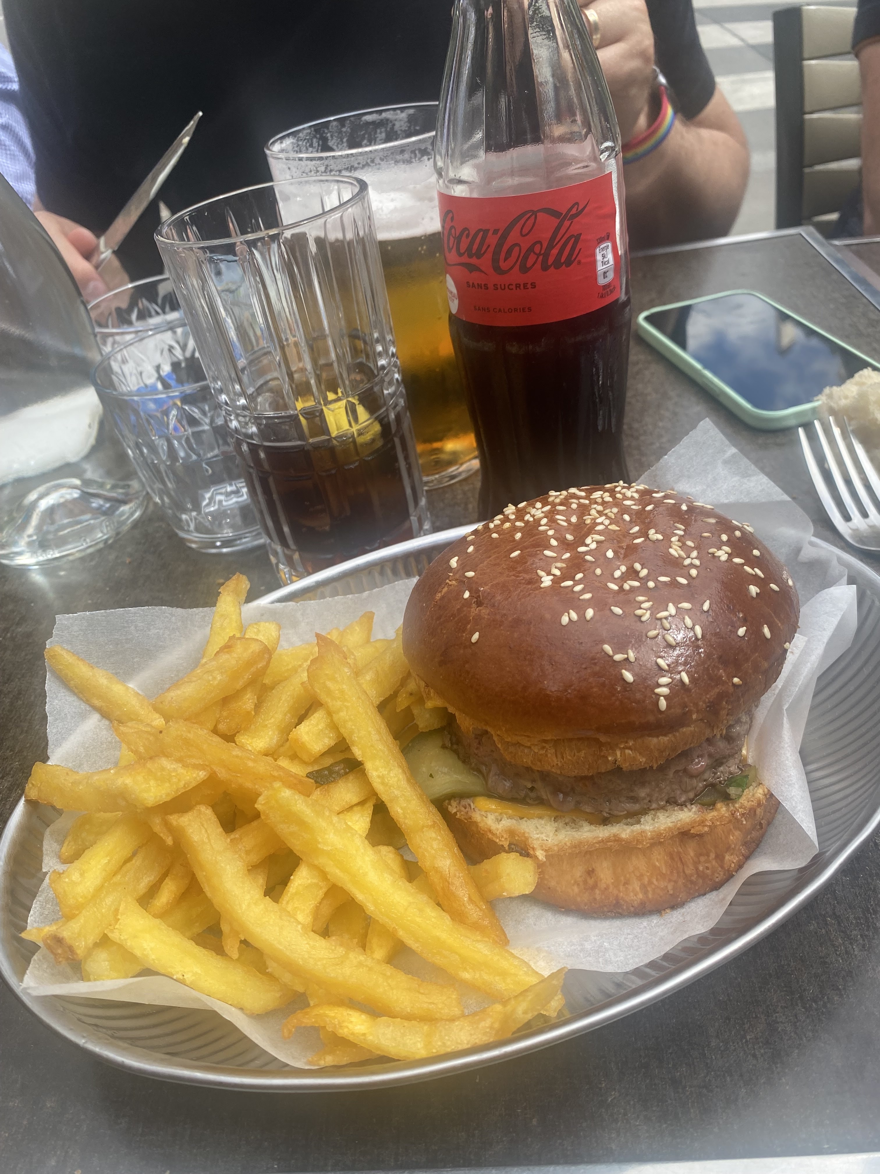 Portion généreuse je recommande les hamburgers. Prix raisonnable. Terrasse couverte très agréable. Un detail : j ai trouvé la table un peu basse, mais vite oublié quand le plat est arrivé.