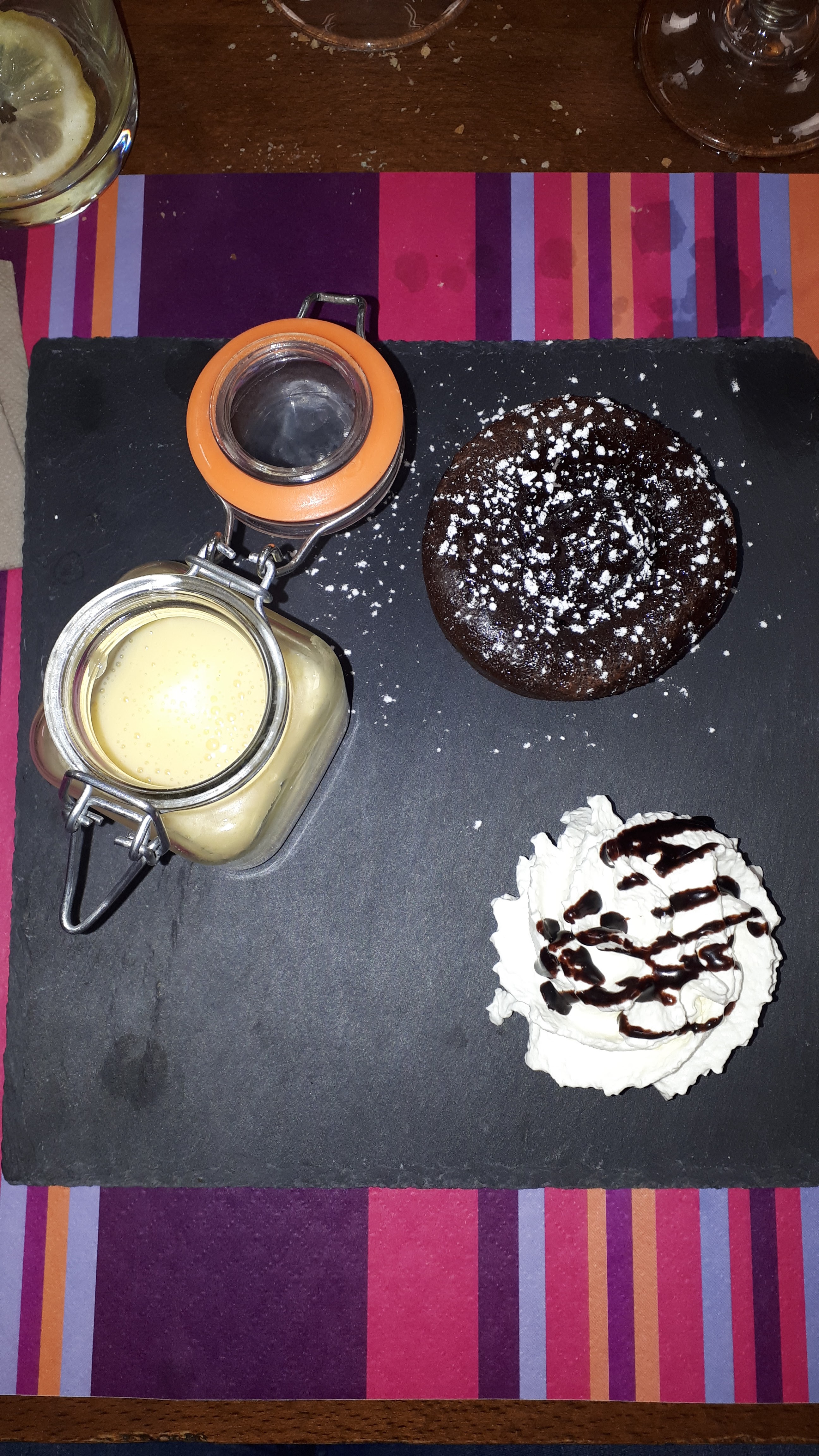 Super accueil ! Un mix-grill Catalan aux petits oignons ! Cerise sur le gateau ! La mousse choco !