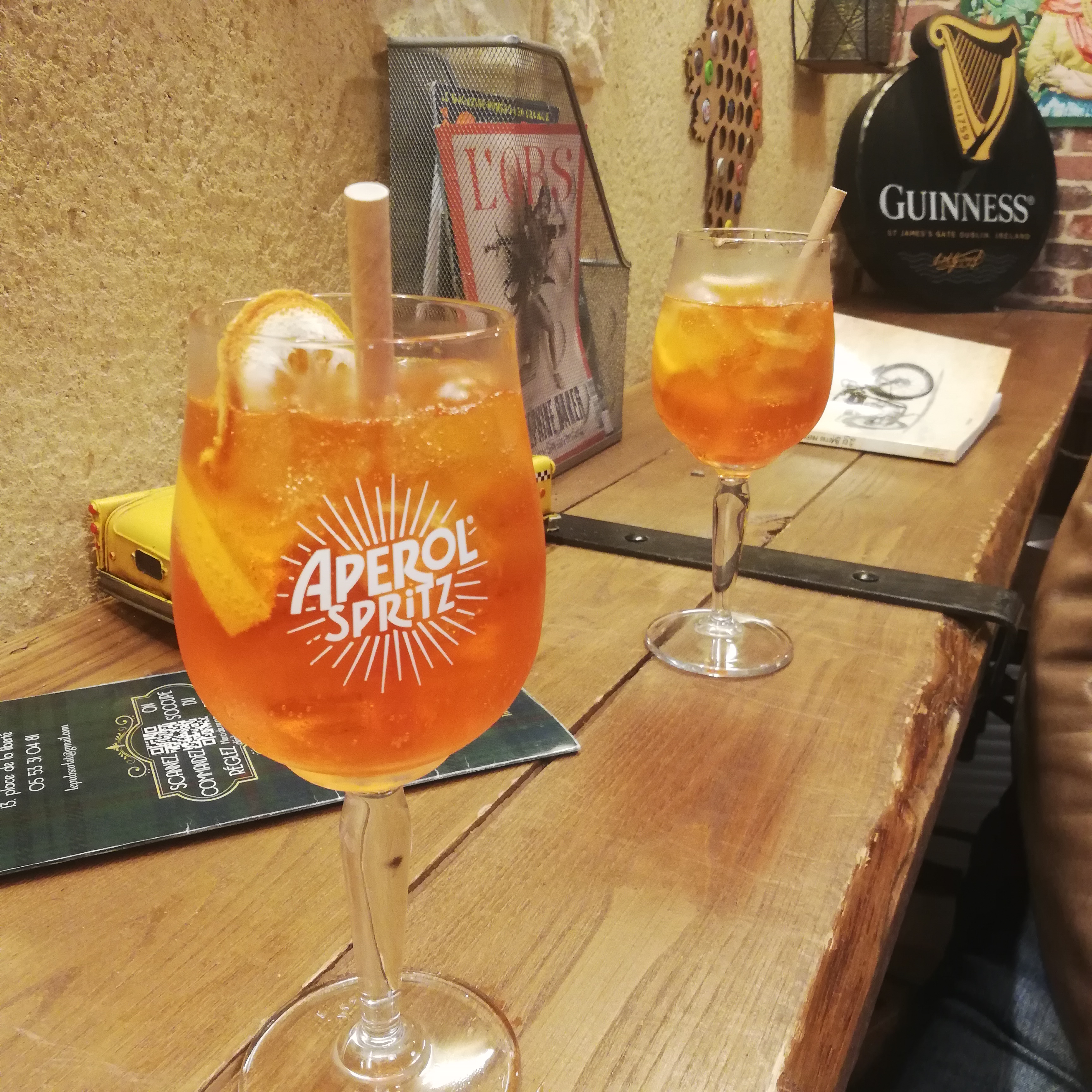 Spritz servi sans biscuits apéritif mais il est bon . Il faut fermer les yeux sur les toiles d araignées et leurs habitantes car la déco est sympa !
