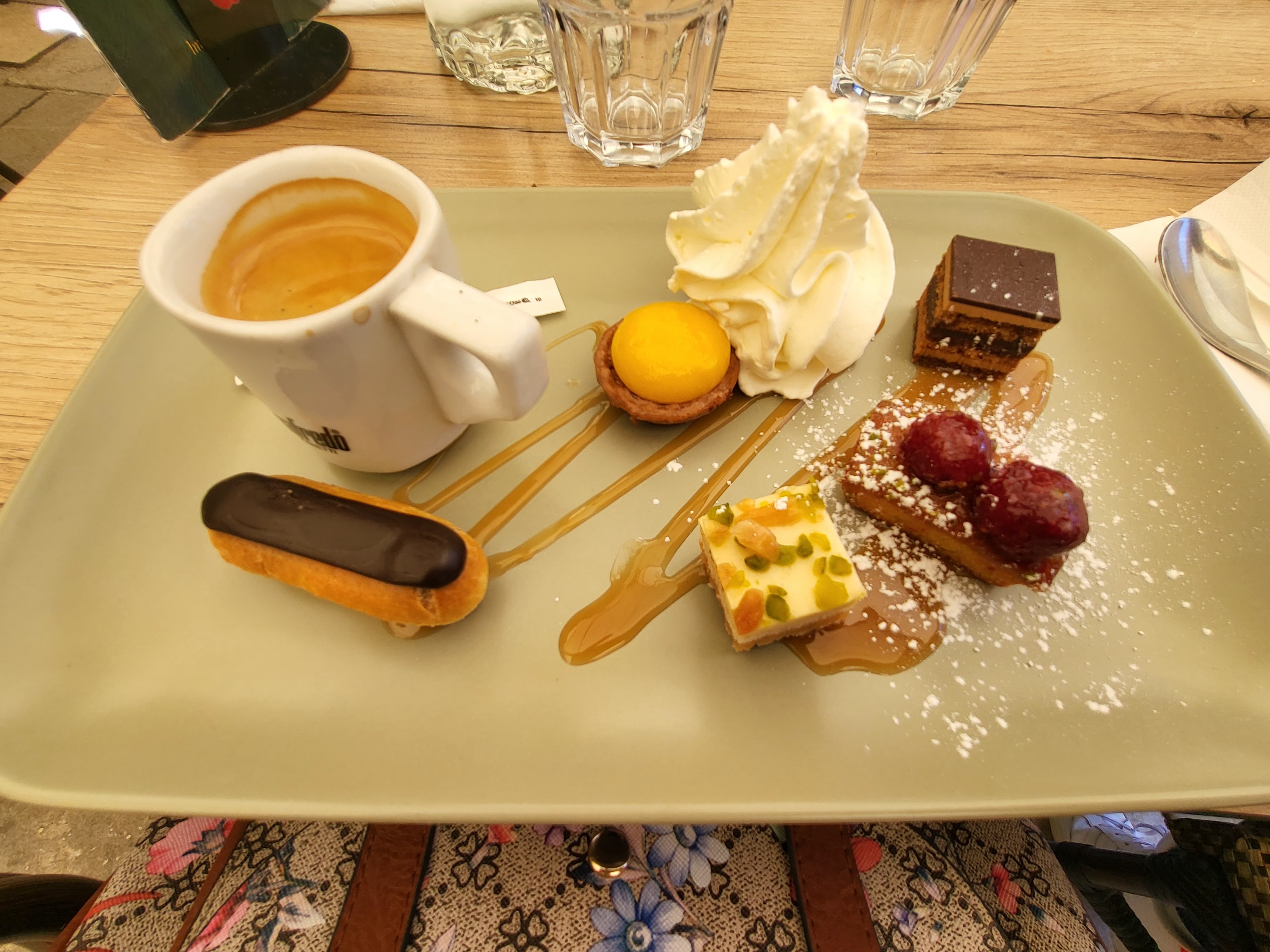 Bon prix, très bonne nourriture, emplacement facile au centre de la ville. Nous a apporté de l'eau pour le chien et nous a aidé avec le fauteuil roulant. L'assiette principale était grande, avec des pommes de terre, je n'avais même pas besoin du plat d'entrée. 2€ la noisette (shot d'espresso avec un peu de lait) ce qui semble bon marché puisque nous avons payé 4,5€ au dernier restaurant !