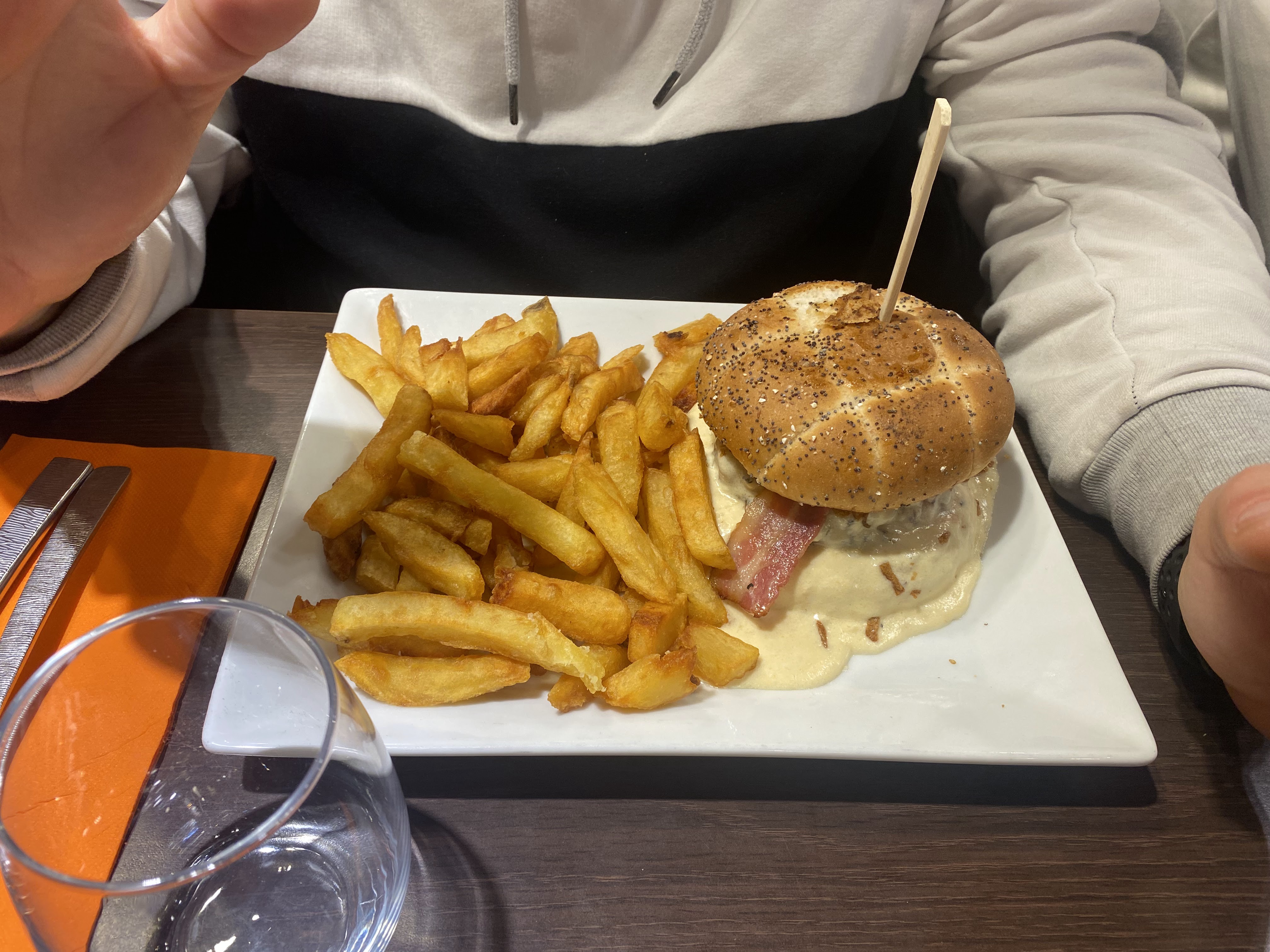 J’ai dîné seule en terrasse. Tout s’est très bien déroulé ! Pas de contact particulier avec le serveur, qui restait professionnel. Le repas était très bon (suprême de volaille à la bière et au maroilles). Cependant il était TRÈS TRÈS copieux ! Je mangeais des frites et j’avais l’impression que cela ne descendait jamais 😂 Je recommande cette étape si vous avez TRÈS faim !