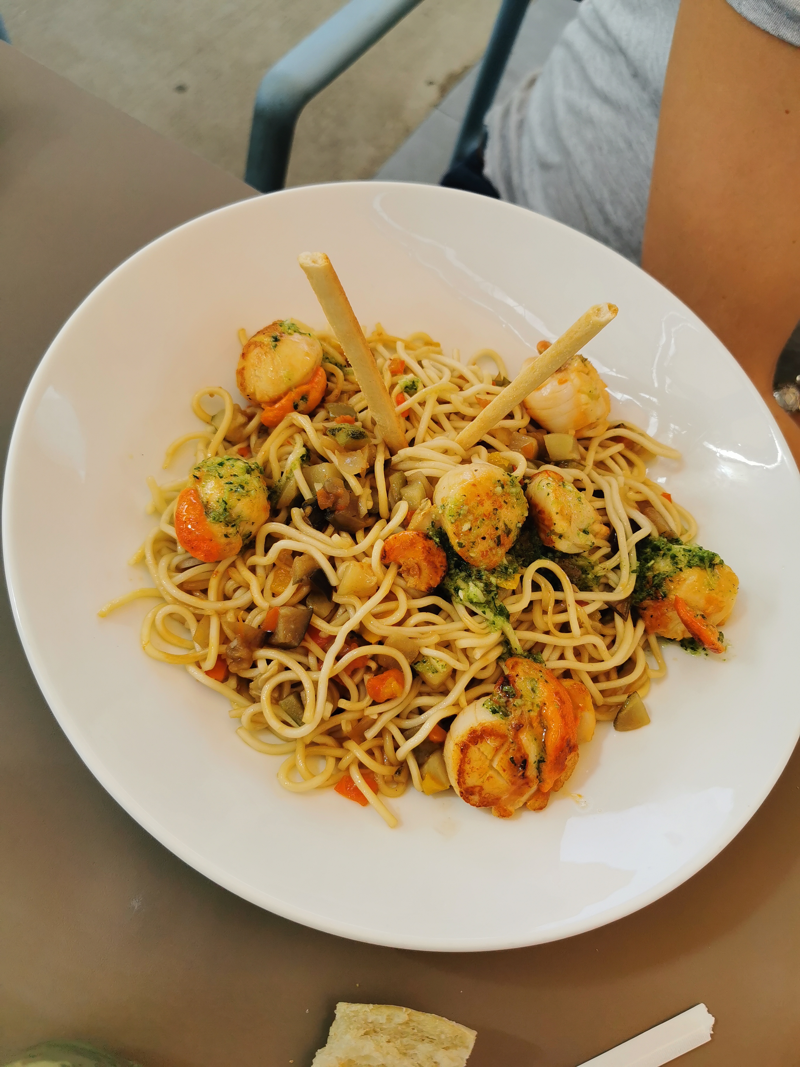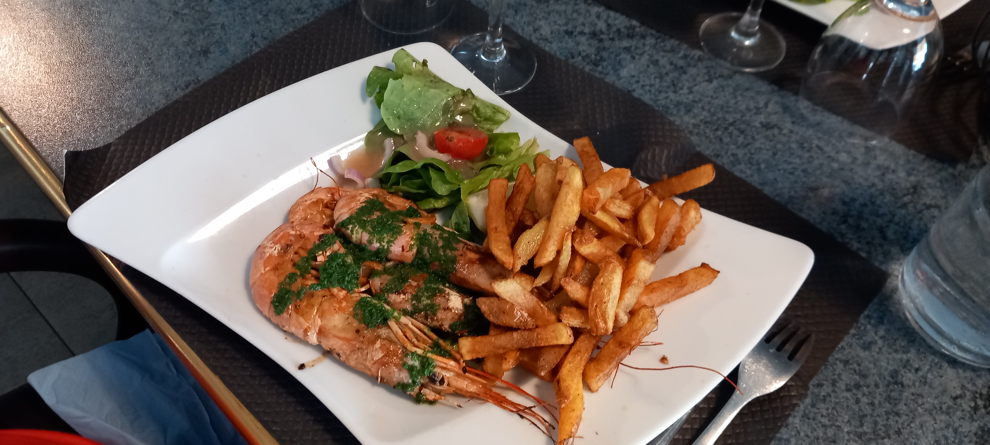 Terrasse très bruyante. Payer 21€ pour décortiquer ces propres gambas pleines d’huiles et d’herbes, c’est cher payé. Le plateau de charcuterie parlons-en : du salami, rosette mortadelle et jambon blanc de supermarché, de qualité médiocre… je préfère de loin, le restaurant voisin…
