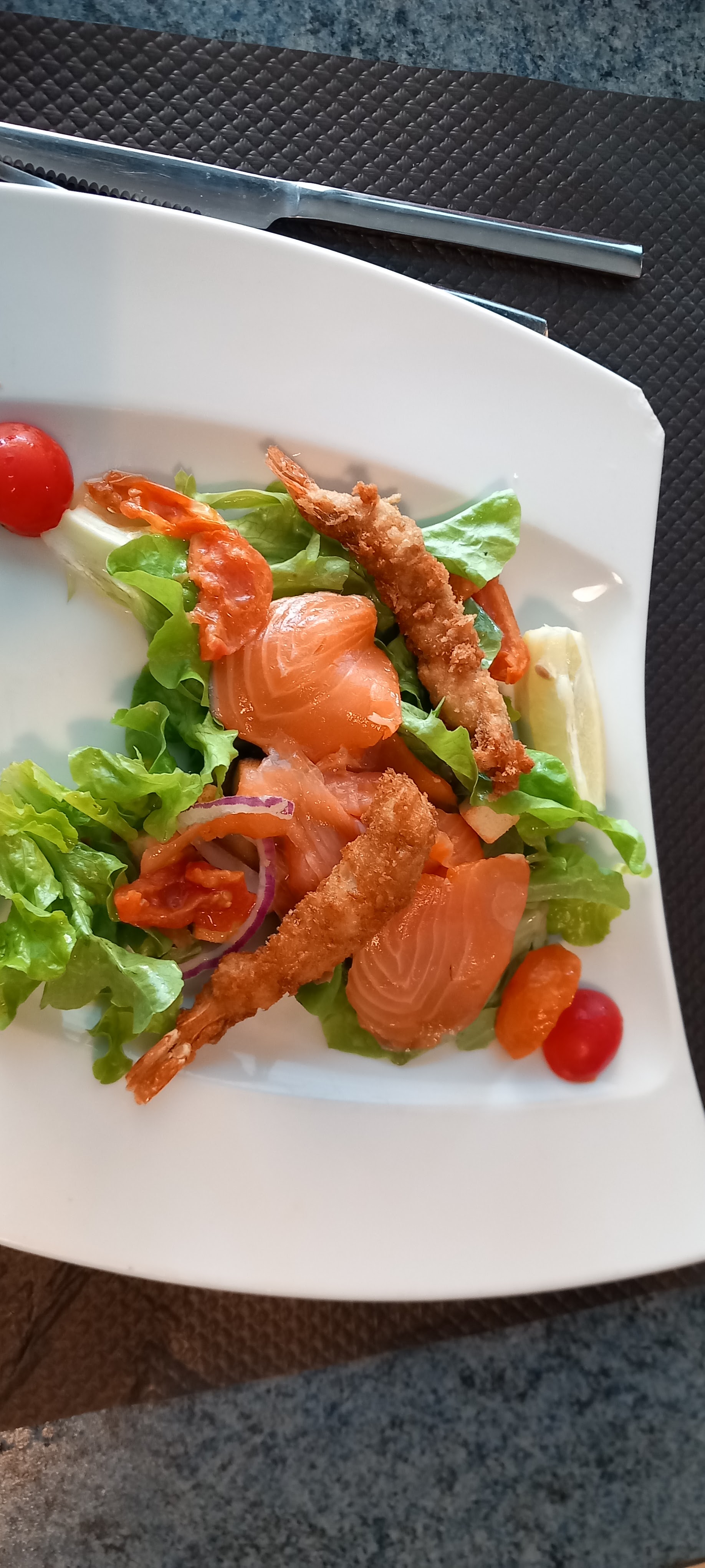 Assiettes copieuses.Mais tout congelé et très fade.soupions,calamars,gambas sans goût.accueil agréable.service rapide.