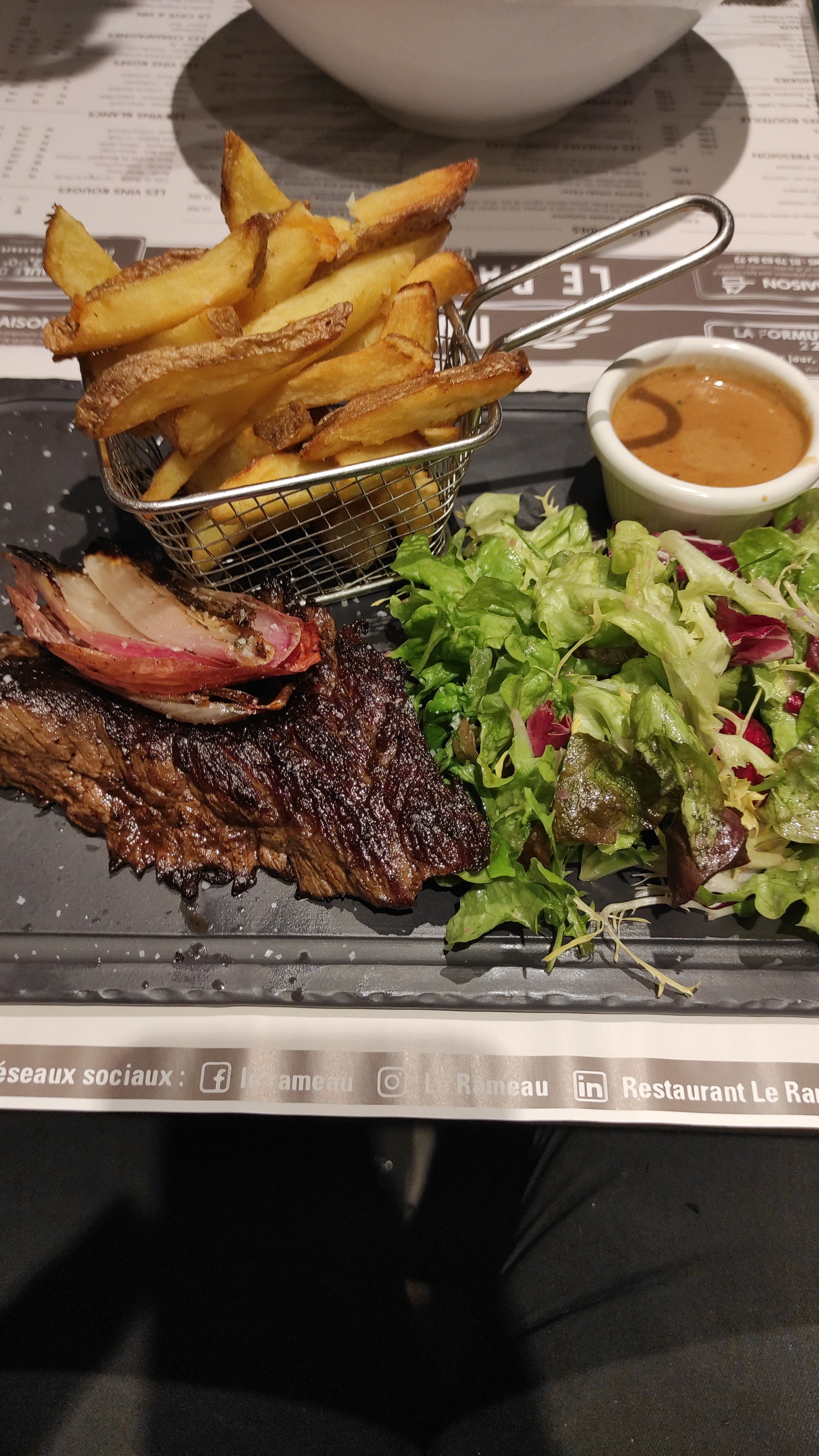 Un plat vraiment excellent, je me suis régalée ! La viande est parfaitement cuite, la salade bien assaisonnée, les frites délicieuses. Le prix est correct vue la qualité ! Un petit bémol pour l'attente mais la salle était pleine. Merci!!