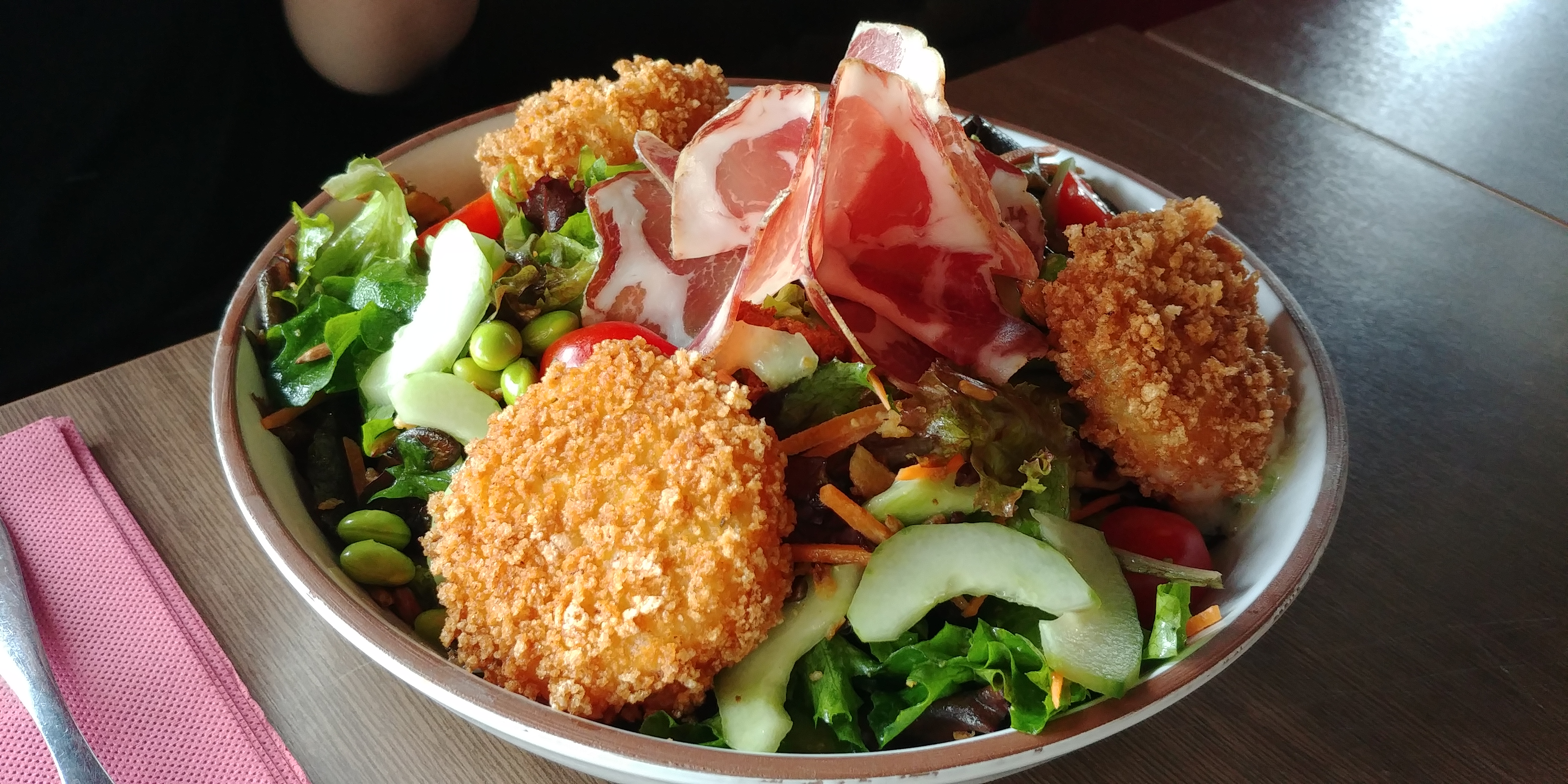J ai pris une salade rustique effectivement c est de la salade mais verte a foison avec trois fines tranches de jambon ainsi que de fromage de brebis on y voit presque a travers avec 1/4 d oeuf dur le tout pour 16€! C est une honte! Le chef du moins ce qu il prétend etre a du me prendre pour un limace! Bref nous avons payé et mange le dessert plus loin.