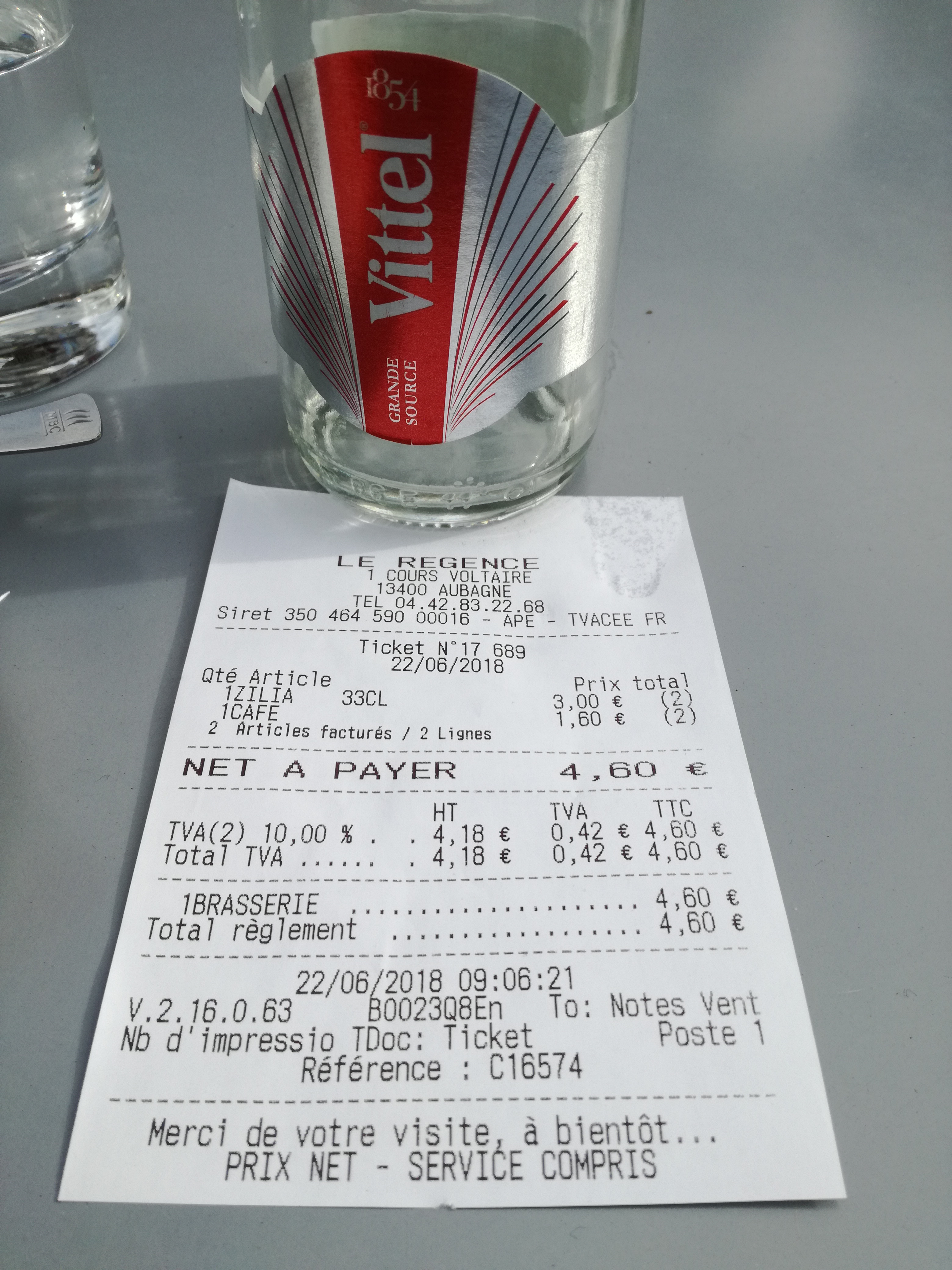 Je commande un vittel et un expresso total de 4€60 sans ticket Je demande un ticket on me rapporte le ticket avec 1zilia 33cl montant 3€ /1€60 pour l expresso Au lieu d un vittel servi 25cl