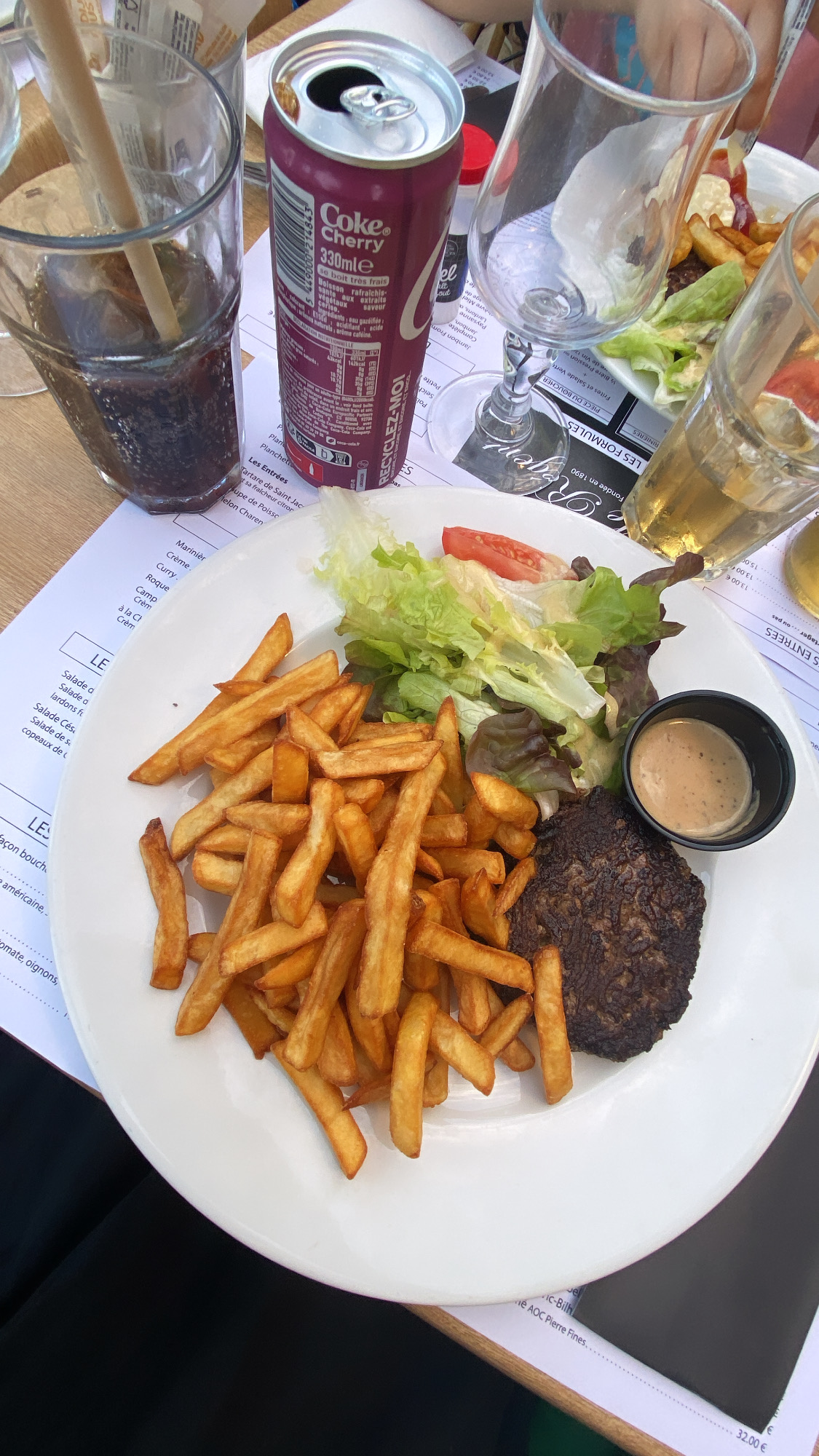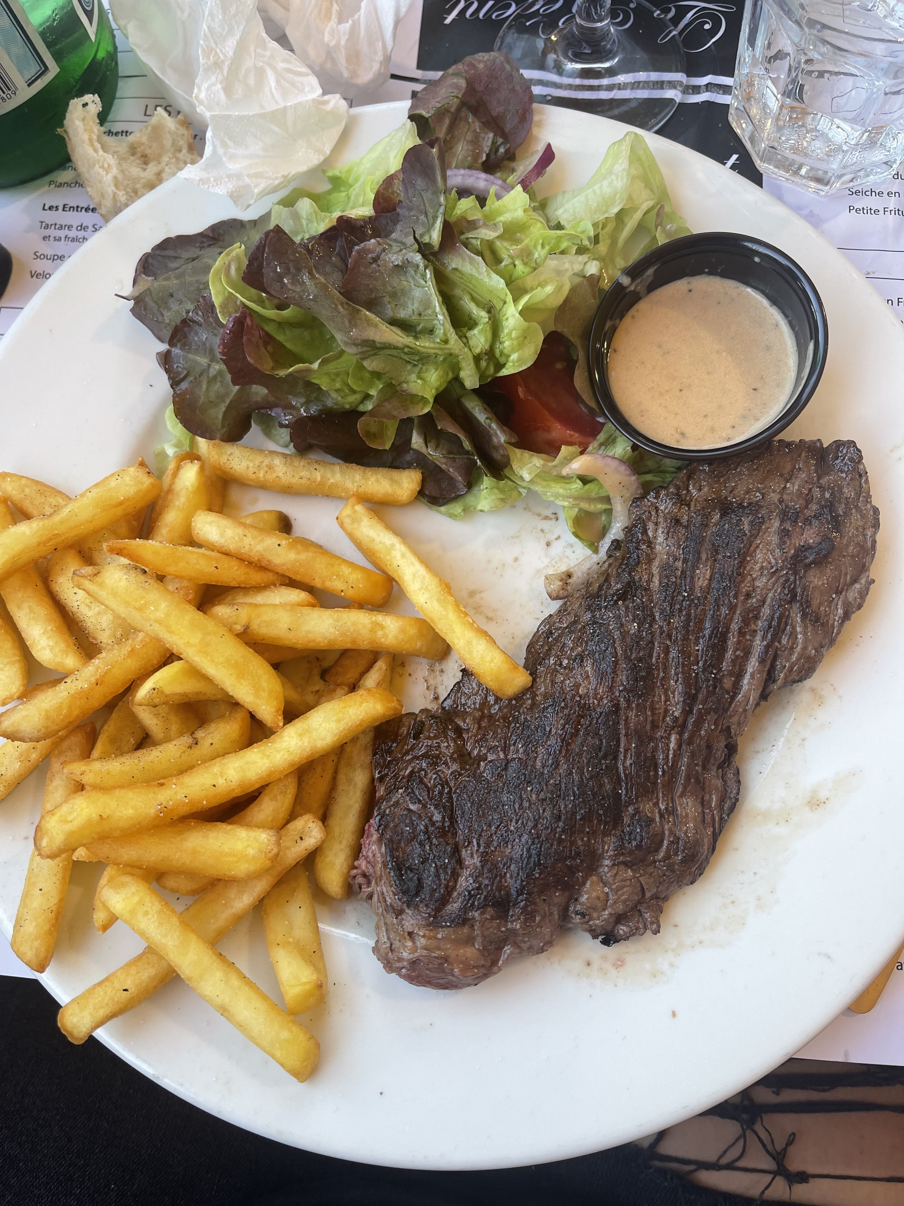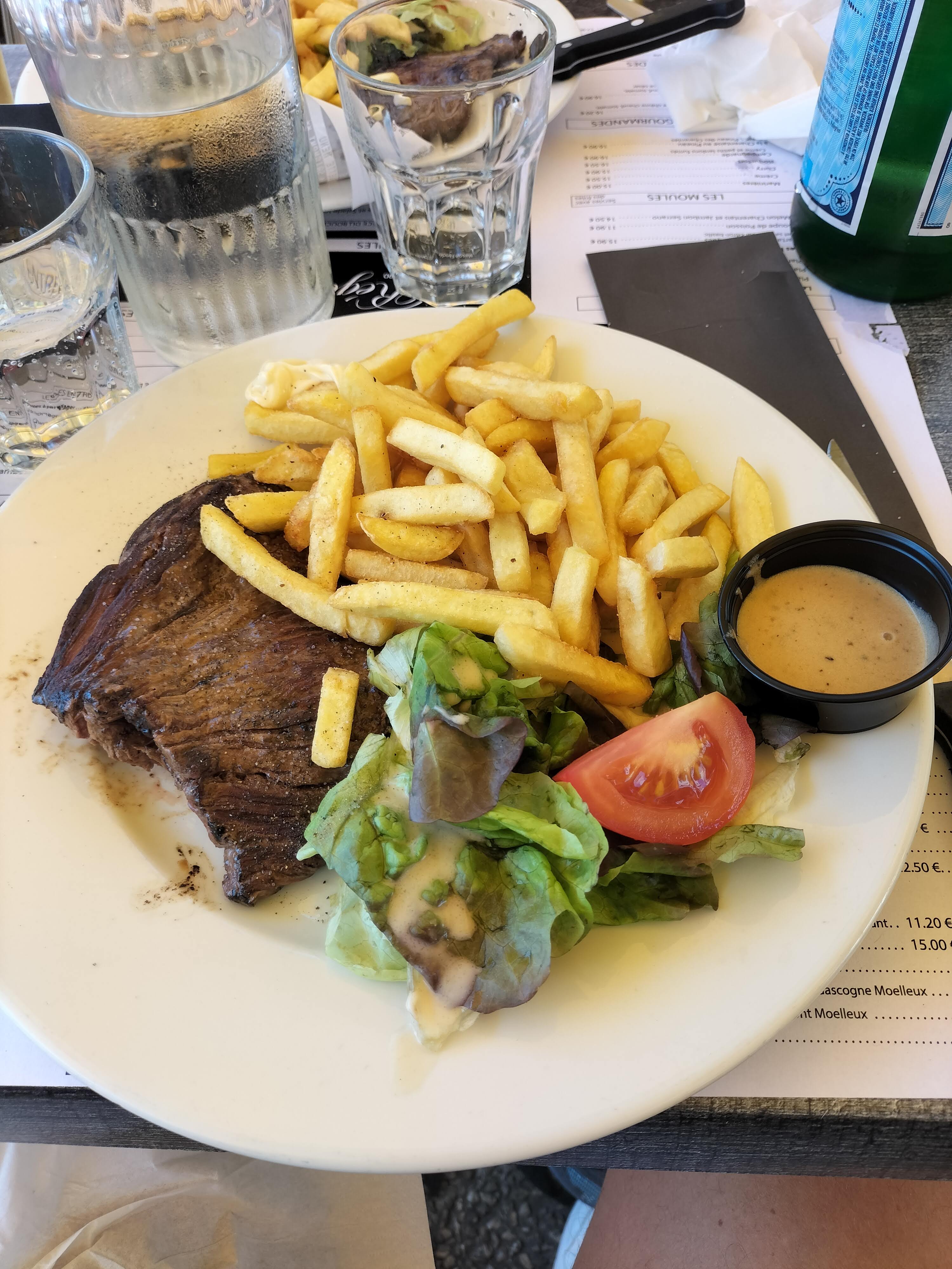 On a reçu un steak bien cuit au lieu de saignant , mon steak au poulet froid et la salade plus bonne , on m'a donné un aluminium pour l'emporter je trouve ça scandaleux, étant en restauration c'était horrible je ne recommande pas du tous, les serveurs fesait tous la tronche et pour avec une carafe d'eau il fallait quémander et faire des regarde très insistant ! Beaucoup trop insistant! Bonne soirée à vous