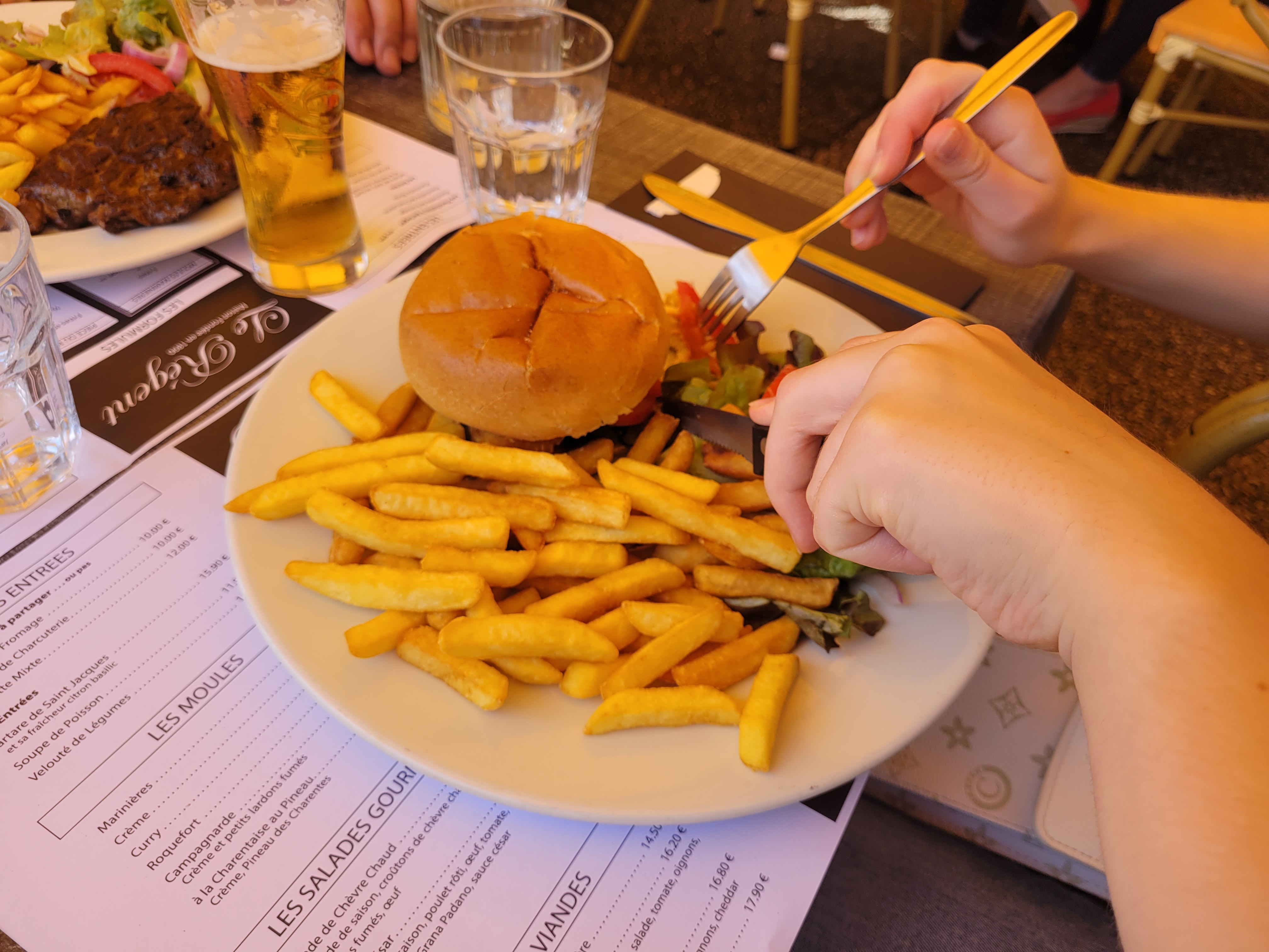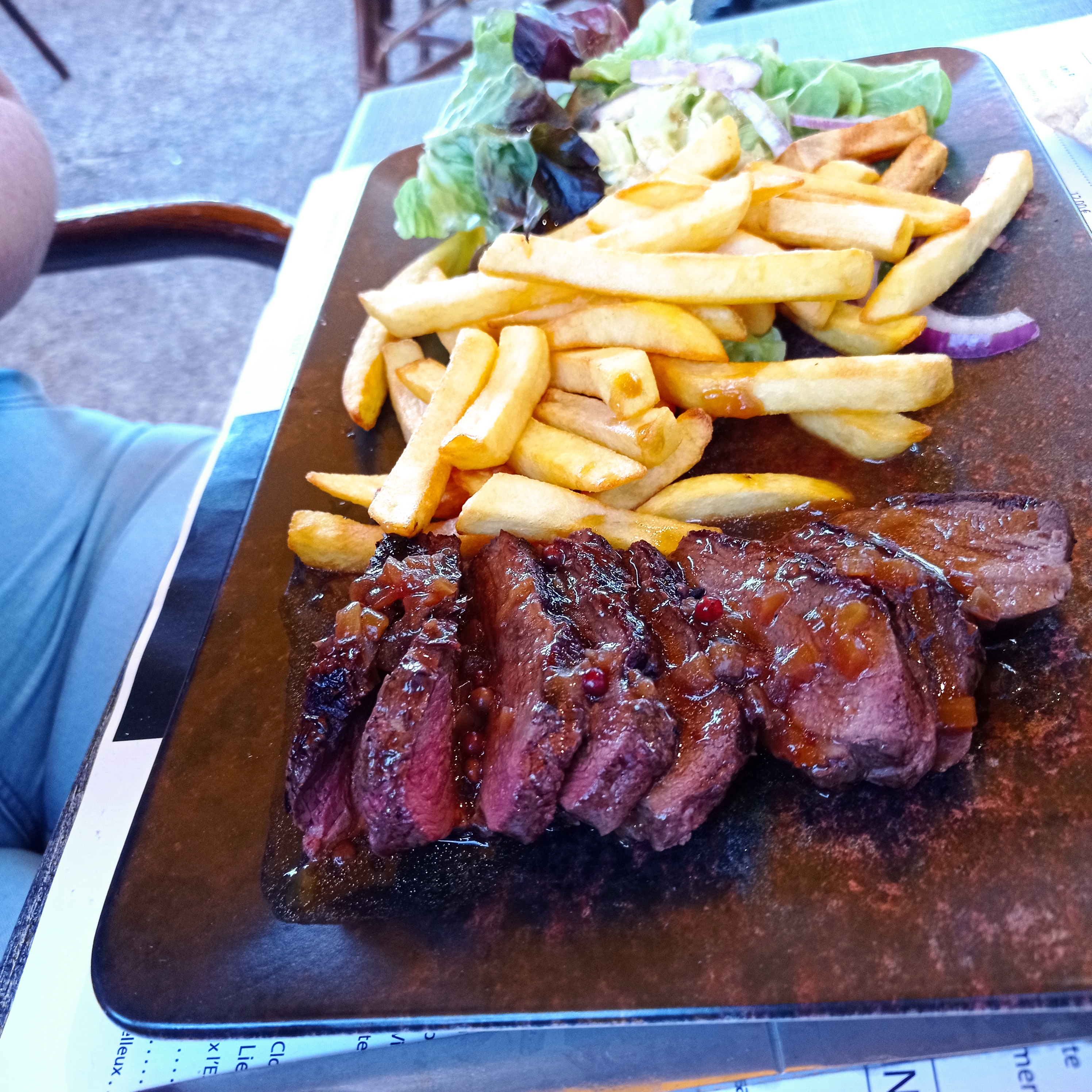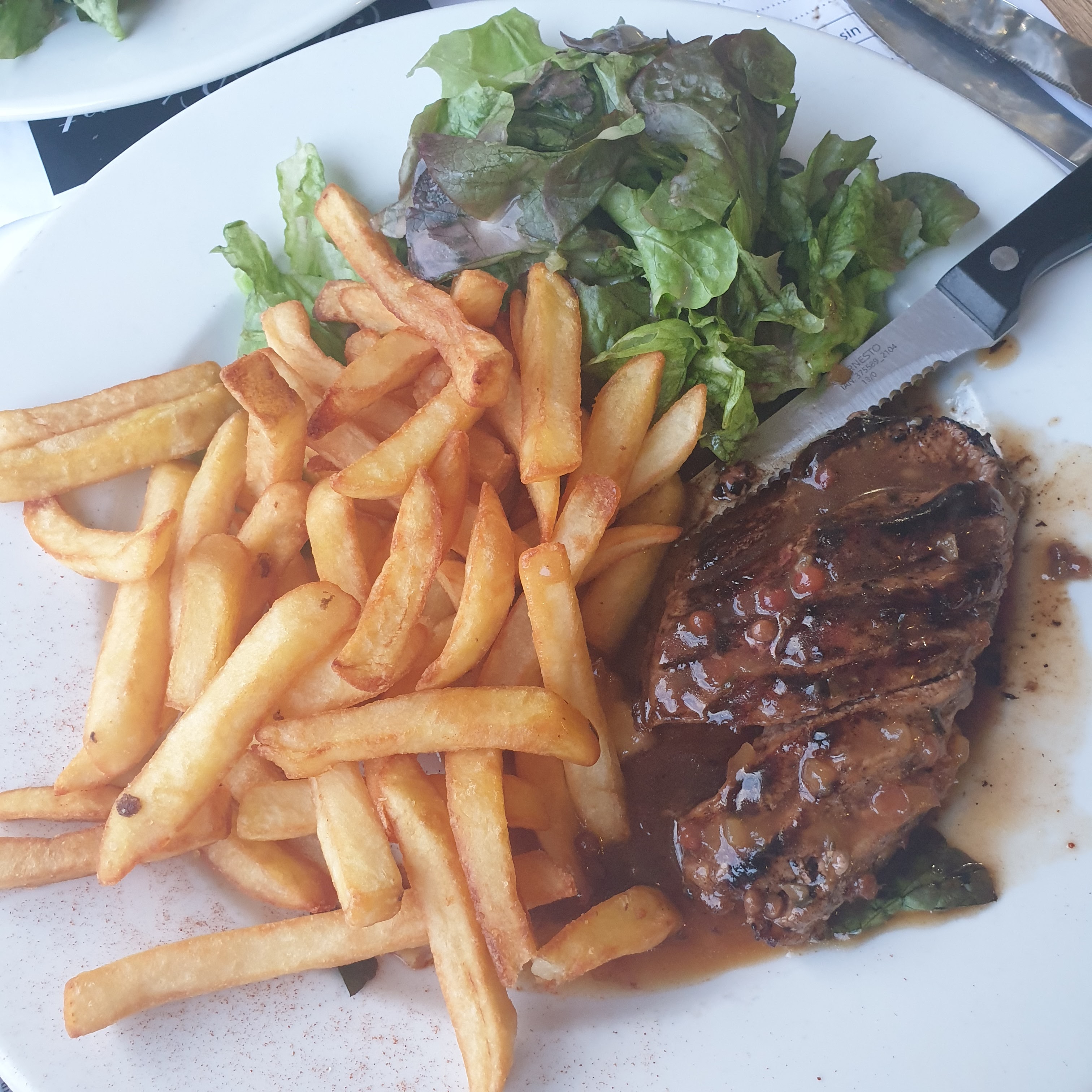 On a reçu un steak bien cuit au lieu de saignant , mon steak au poulet froid et la salade plus bonne , on m'a donné un aluminium pour l'emporter je trouve ça scandaleux, étant en restauration c'était horrible je ne recommande pas du tous, les serveurs fesait tous la tronche et pour avec une carafe d'eau il fallait quémander et faire des regarde très insistant ! Beaucoup trop insistant! Bonne soirée à vous
