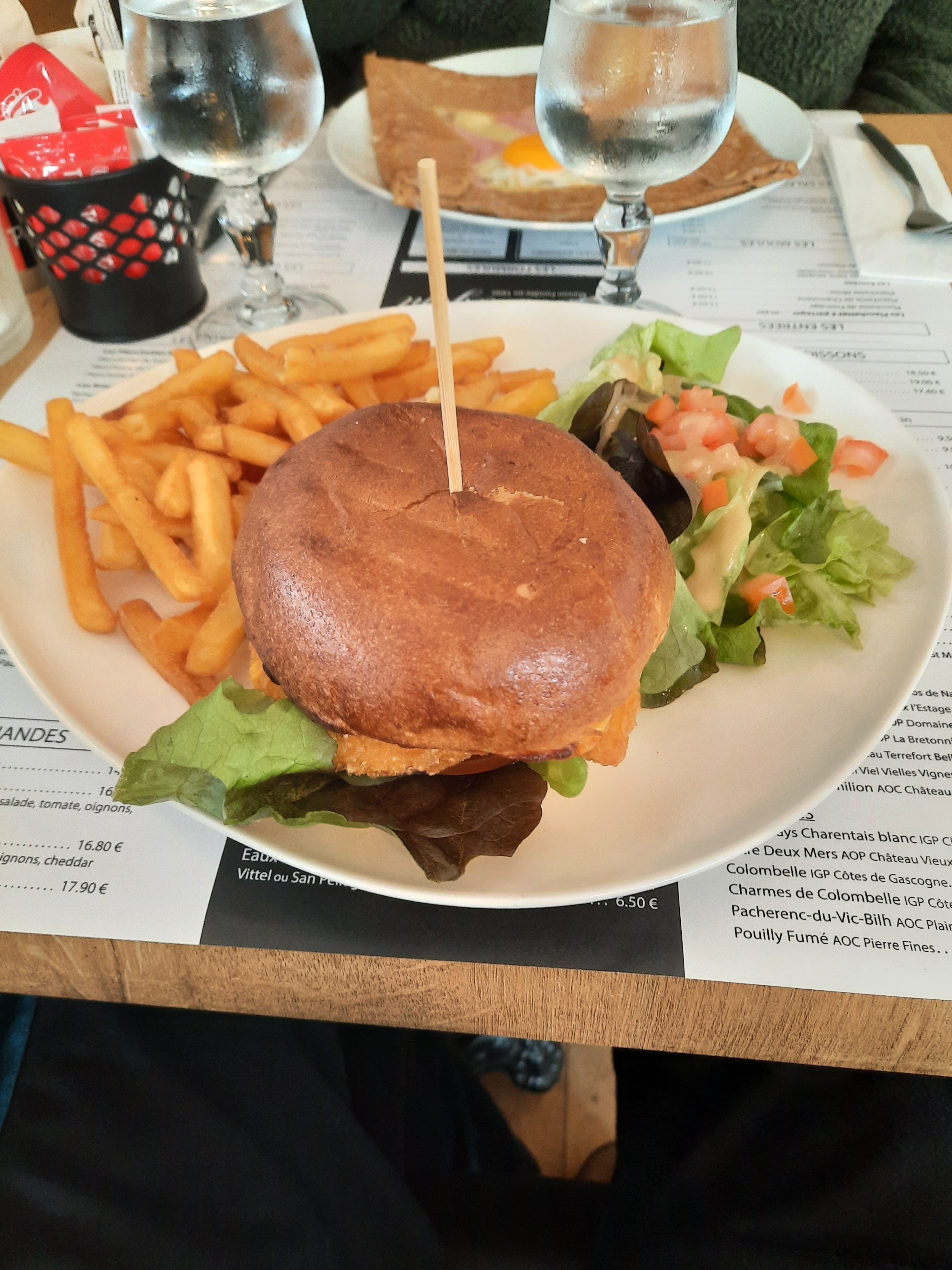 Service du 23 mai 2024 au soir, moules à la crème excellentes, ainsi que le Burger poulet, et également les gaufres Chantilly ! Nous avons été reçus et servis par plusieurs petits jeunes super gentils et polis.