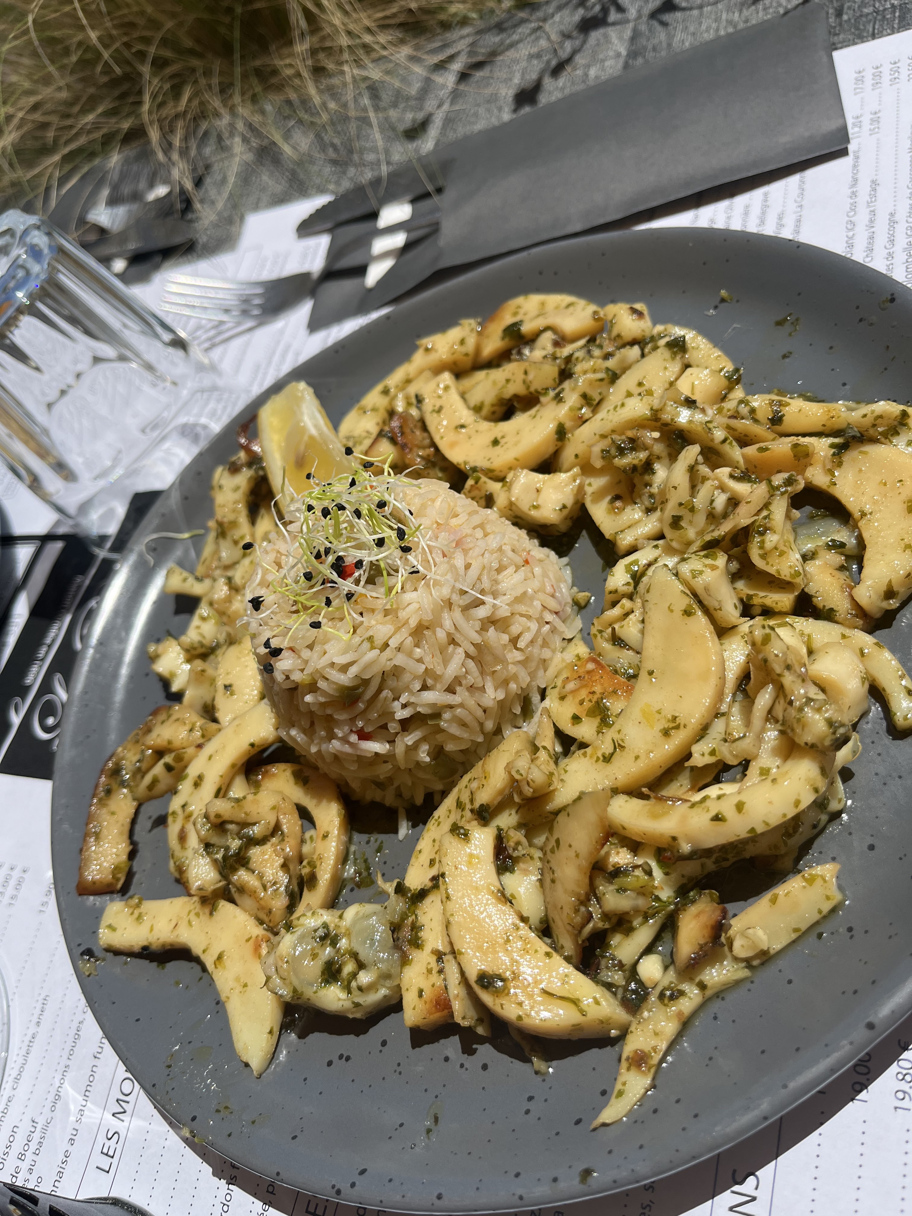 A FUIR!!! j’ai prit des « seiches » en persillades, étant mon plat préféré de base, immangeable… je n’ai mangé que la moitié de mes frites congelées, je rends l’assiette en disant que je veux bien payer les boissons et la part de frites le responsable me dit qu’il en a « rien à foutre » et m’accorde simplement une réduction de 10€ ) plat a 19€, j’ai donc dû payer 9€ des frites congelées même pas finies! mon conjoint a prit des moules, coquilles vides, moules minuscules, sauce infâme… malheureusement pour nous nous avons vu les mauvais commentaires que trop tard photo de la super assiette appétissante: