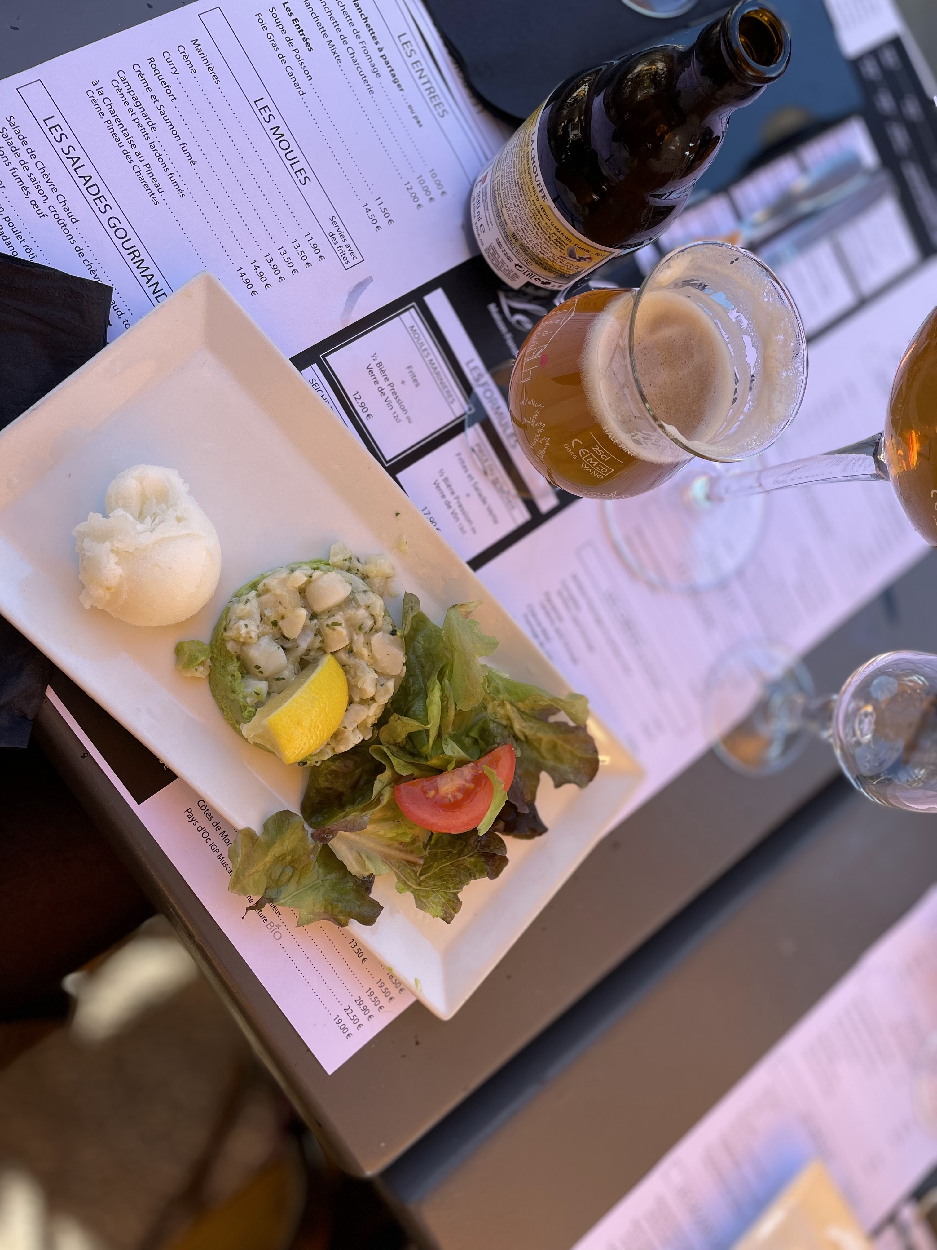 C'est la 2 fois que je mange, 1ere fois parfait. Là aie aie aïe. Je voulais dire un grand bravo pour la serveuse qui est restée très professionnelle avec 3 vieux gros c... insupportable avec la serveuse. Côté organisation 0, car le menu du jour pas à jour pas de beignet de crevettes, ils ramenent à la place œufs mimosa au saumon sans demander l'avis des clients, la salade pas de sauce. Le cuisto très mauvais ne goûte pas ses plats avant de servir aux clients, on c'est retrouvé avec des moules au roquefort qui n'avaient pas le goût du roquefort mais goût brûler pas d'excuse ni geste commerciale avec un plat qui coûte presque 20€ On revient à 16h30 pour manger une bonne glace. Le serveur n'a pas réussi à gérer son côté pas motivé ou vif au bout de 30mn on est partie sans manger de glace ils ont perdu une commande de 70€ et on était pas les seuls à partir. Votre tartare coquille St Jacques toujours très très bons