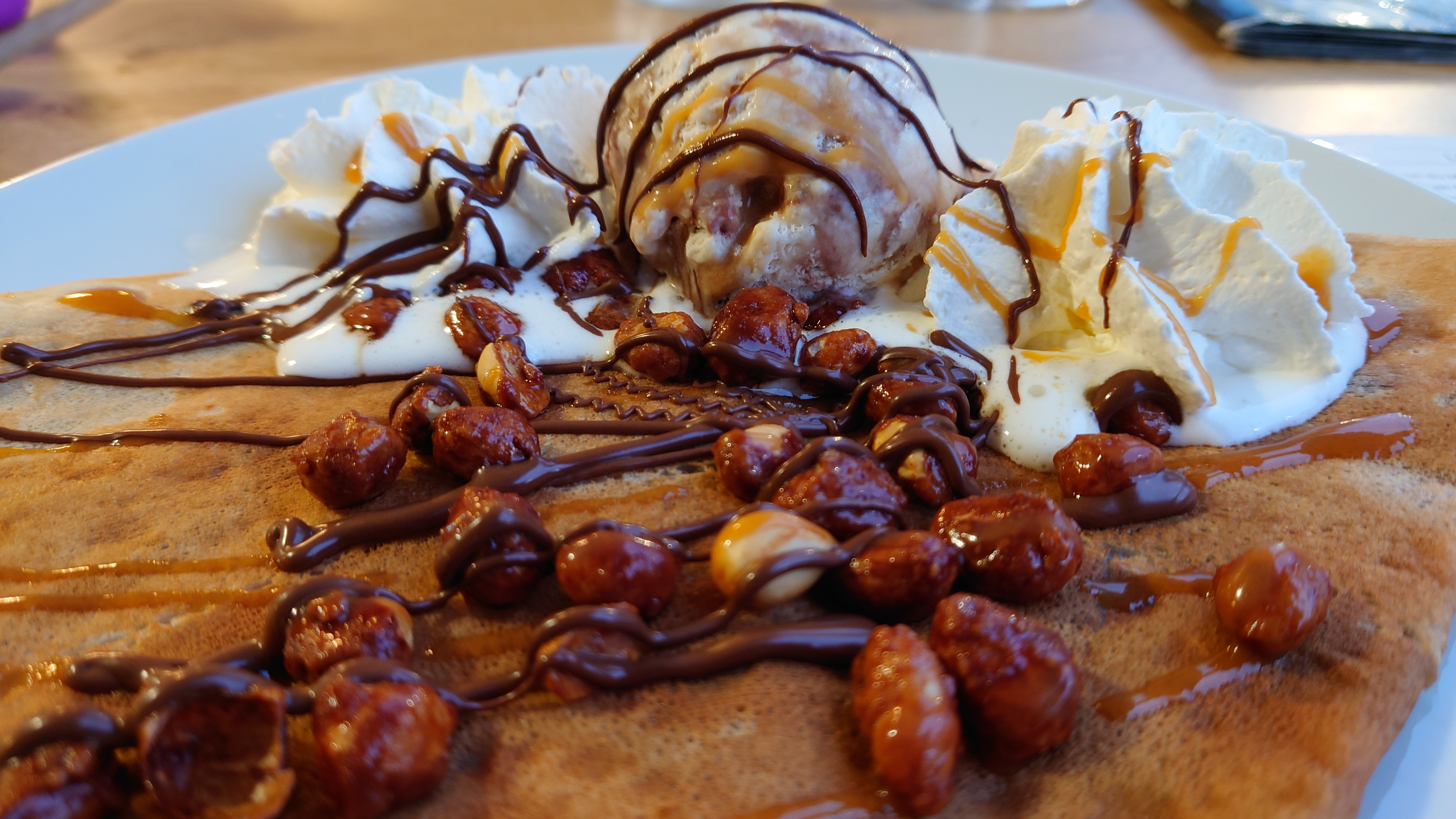 Armez vous de patience lors des matinées d’août car malgré une terrasse peu bondée, nous avons eu le temps de revisiter tous les jeux de cartes avant d’avoir pu passer commande. Une deuxième heure s’écoule avant de la recevoir, et malheureusement les crêpes et les gaufres arrivent froides. Simple hochement de tête du serveur quand on lui fait remarquer. Pour une prestation de qualité vous pouvez chercher ailleurs.
