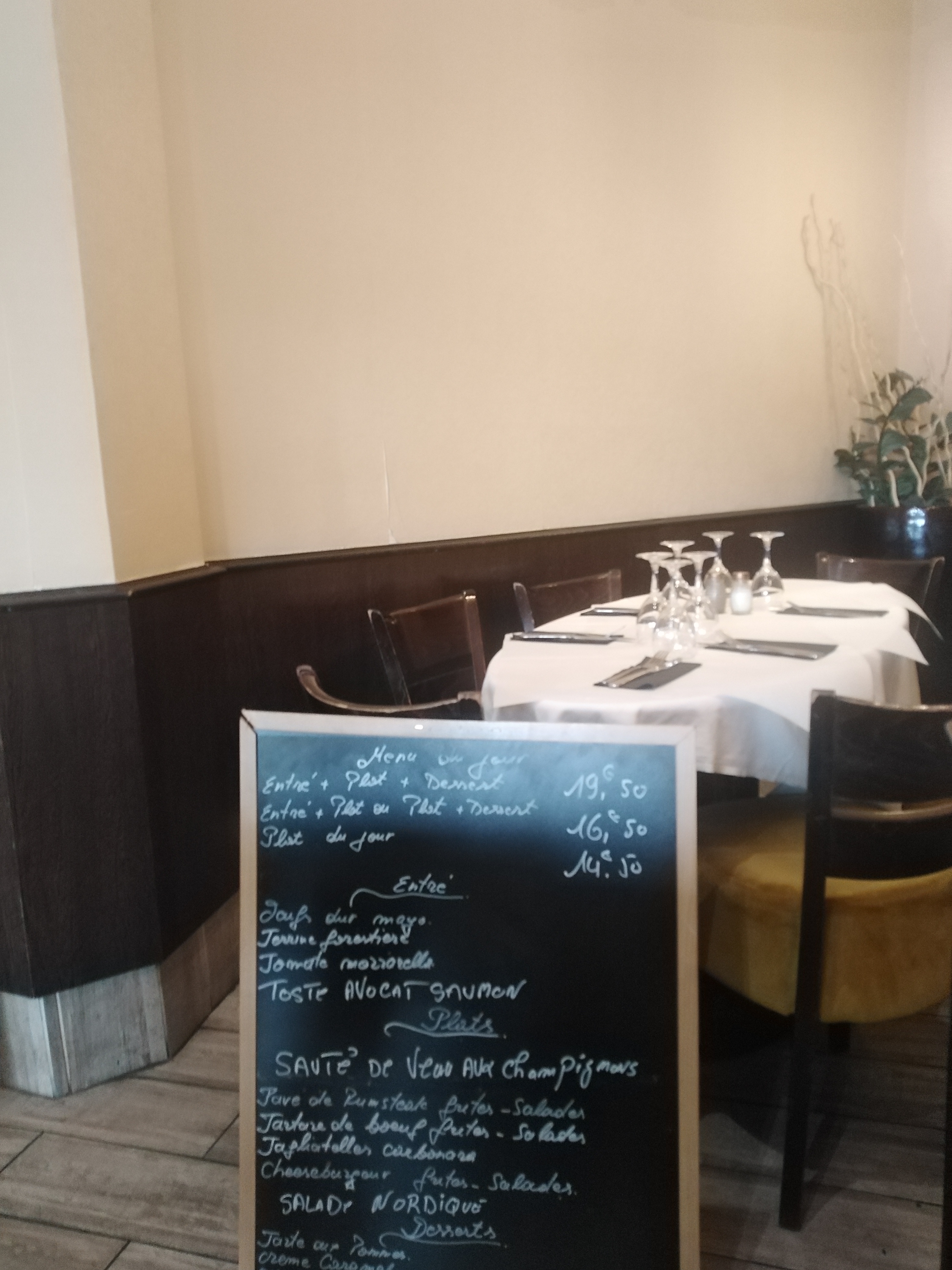 Une bonne adresse. La formule du soir (entrée plat et dessert) à 19.90€ est plus que correct. Le saumon était bien préparé, les pâtes très bonnes et en prime une assiette de légumes poêlés frais (qui n'a pas été comptée comme supplément). Les desserts sont apparemment maison et cela s'est ressenti sur le tiramisu. Le personnel très sympathique et lorsque la musique est trop forte à l'intérieur, il suffit de demander de baisser. Je recommande chaudement 👍