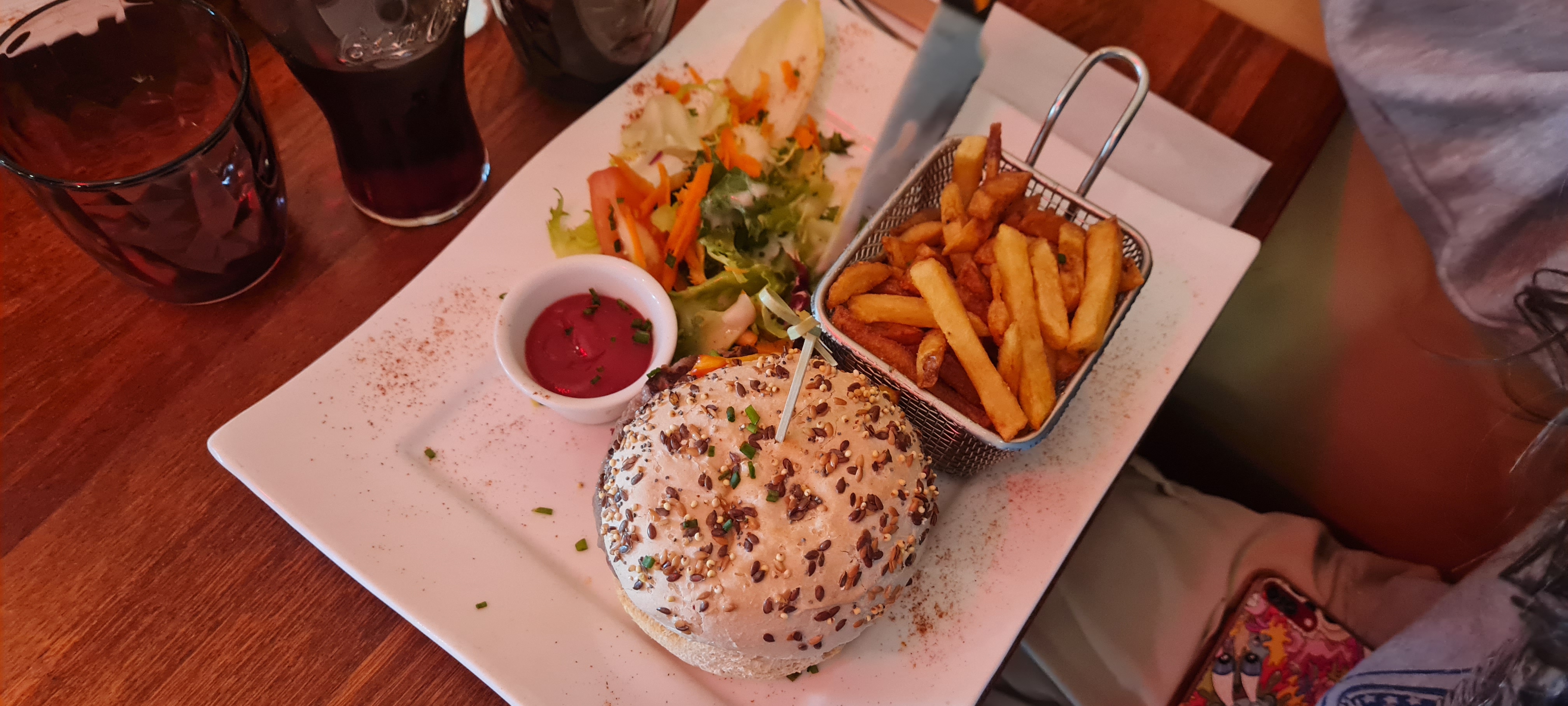 Ils auraient mieux fait de ne pas proposer de pizza. Une pâte à pizza traditionnelle contient de la levure de boulanger, fermente pour être plus digeste et gonfle moelleusement tout autour. Ici on a plutôt une espèce de crêpe craquante. Quant au burger Montagnard : beaucoup trop d'oignons et un fromage sans goût (probablement basse qualité) qui ne rappelle pas vraiment la montagne. Accompagné de frites toutes molles. Pour finir la carte restaurant qui ne passe pas à l'addition soit disant parce-qu'il y a un problème technique alors que j'observe sur mon appli que l'opération est refusée car le commerçant n'est plus abonné à la carte restaurant.