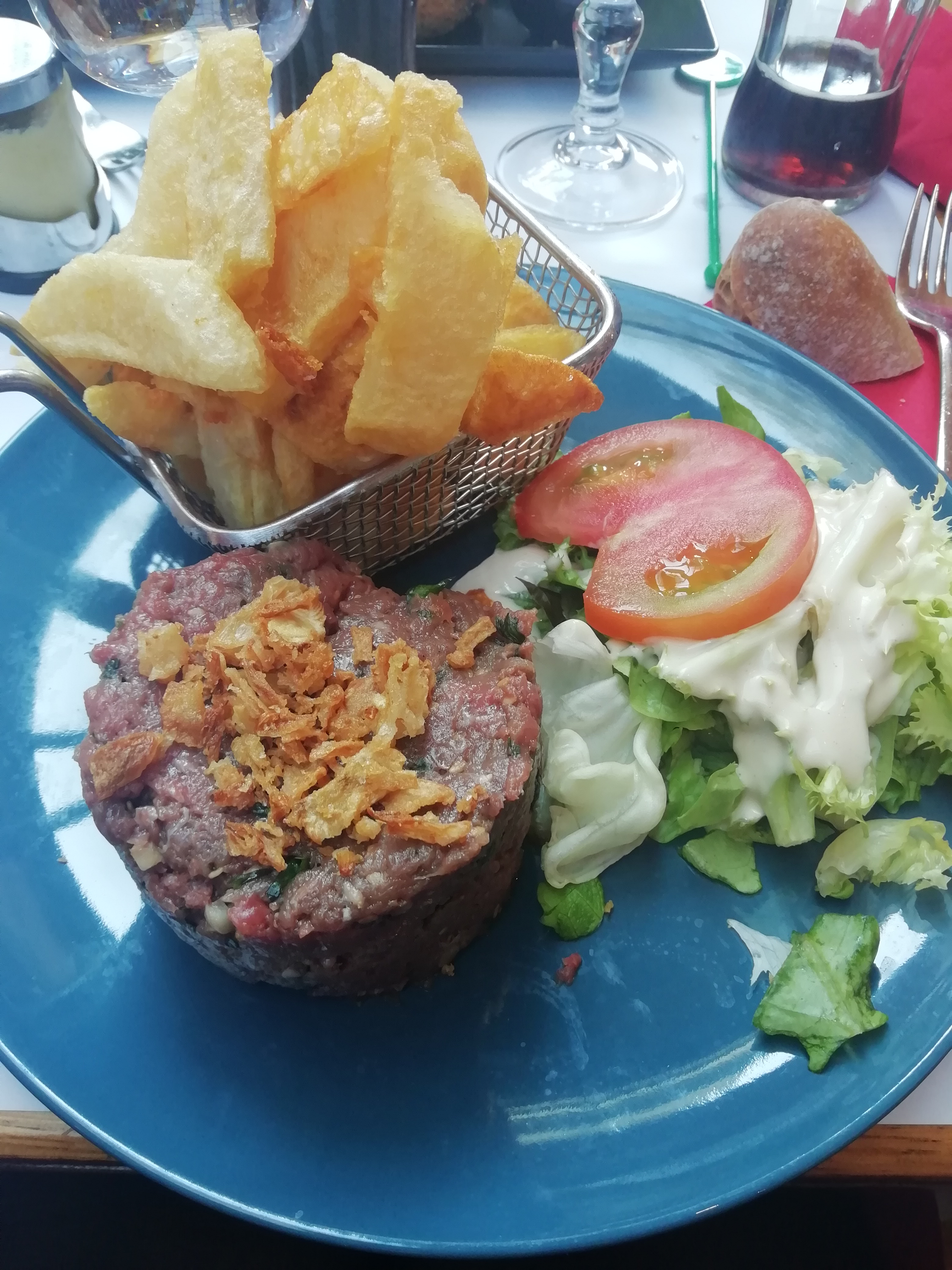 Le service était nickel, le steak bien tendre et les frites bonnes (fraiches ?) Par contre le tout servi dans une assiette froide (et donc fait manger vite sous peine de manger froid) et la tarte au citron vraiment pas terrible (congelée ? Aucun croquant)