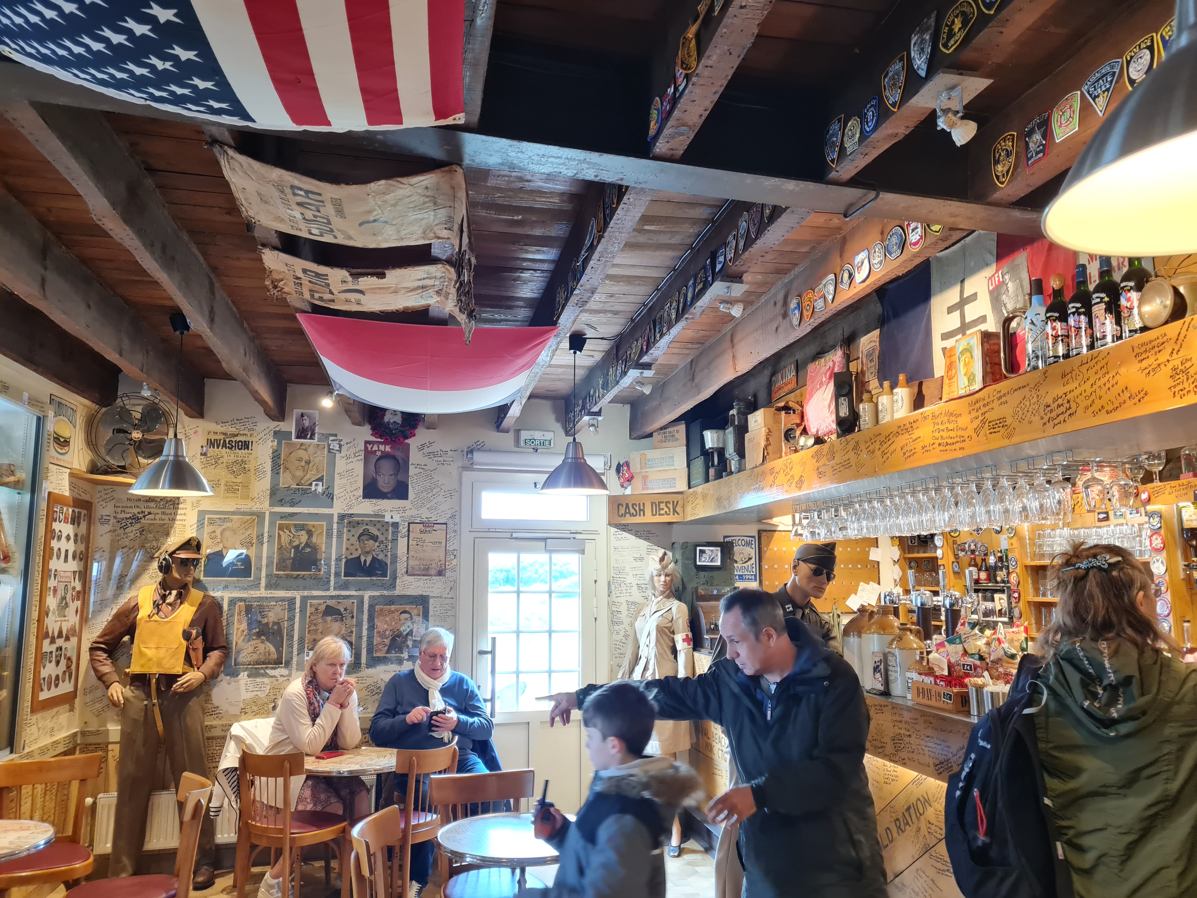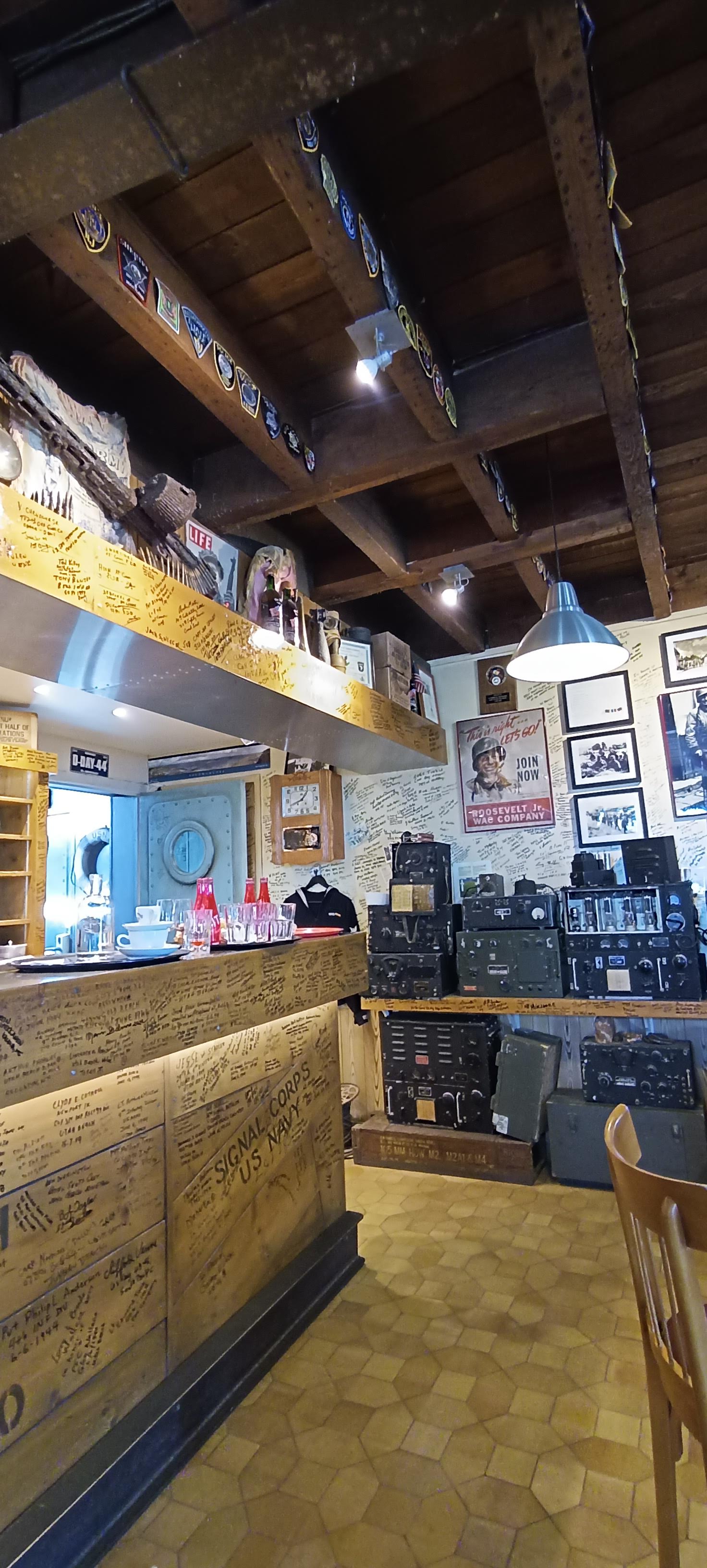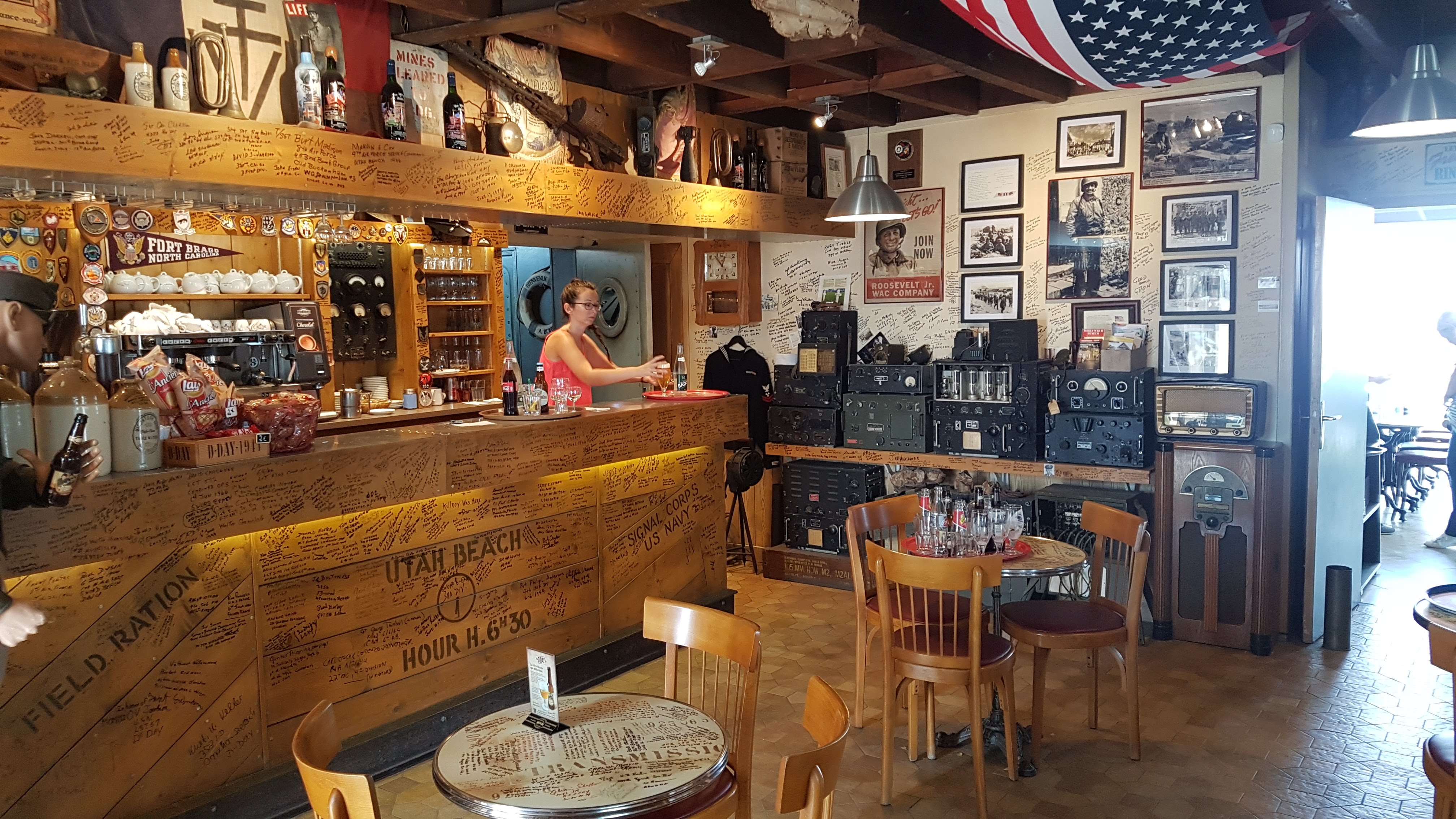 Petit arrêt dans ce bar atypique qui fait également restaurant. La décoration est vraiment unique à voir avec des vestiges de la période du débarquement. Des dédicaces sont signées un peu partout sur les murs et le bar. Des photos de vétérans sont aussi affichées ainsi que de nombreux blasons et insignes militaires. Les toilettes sont également à voir, installées dans une imitation de bateau de guerre. Ajoutez un patron sympa et vous comprenez que cet endroit vaut le détour. Je ne me prononce pas sur les repas n'ayant pas mangé mais juste bu un verre.