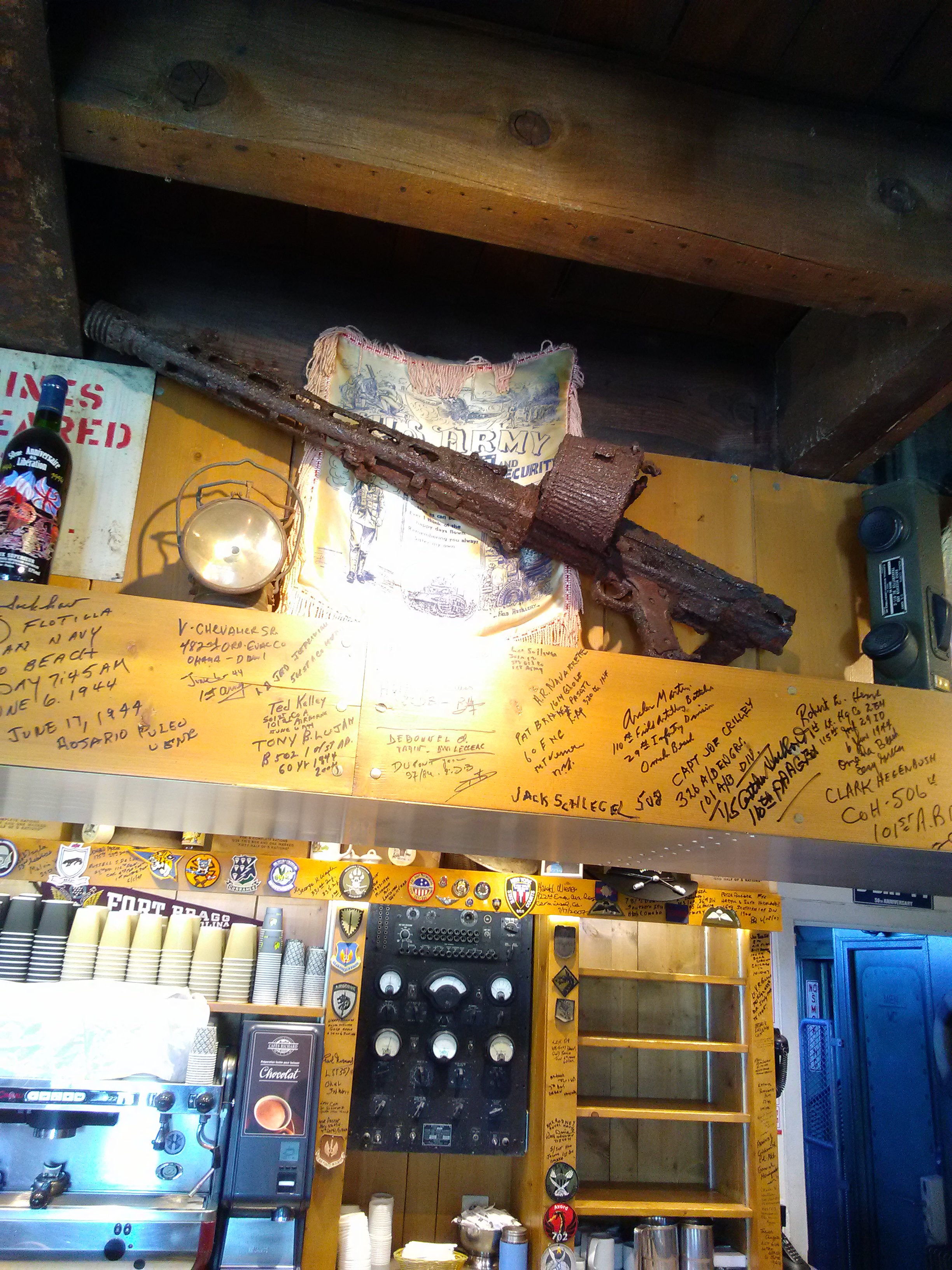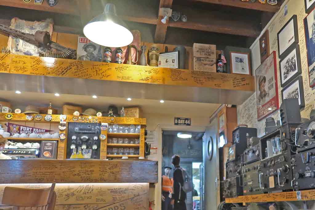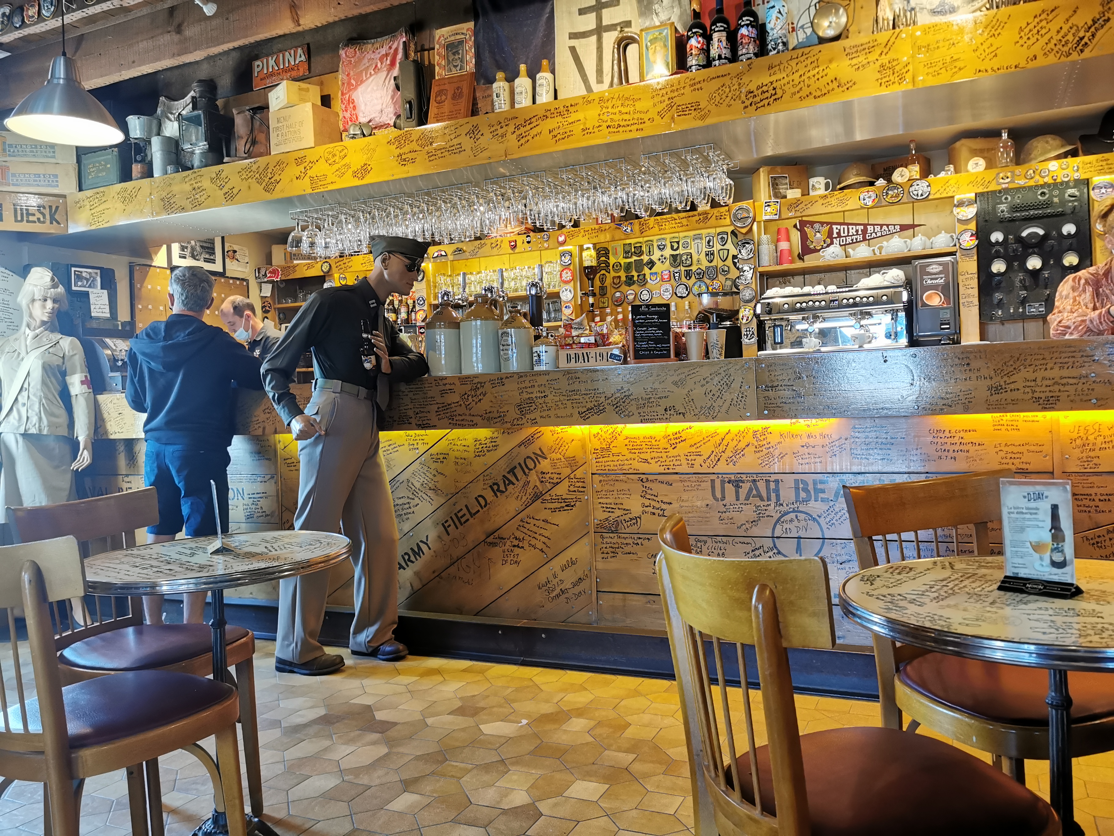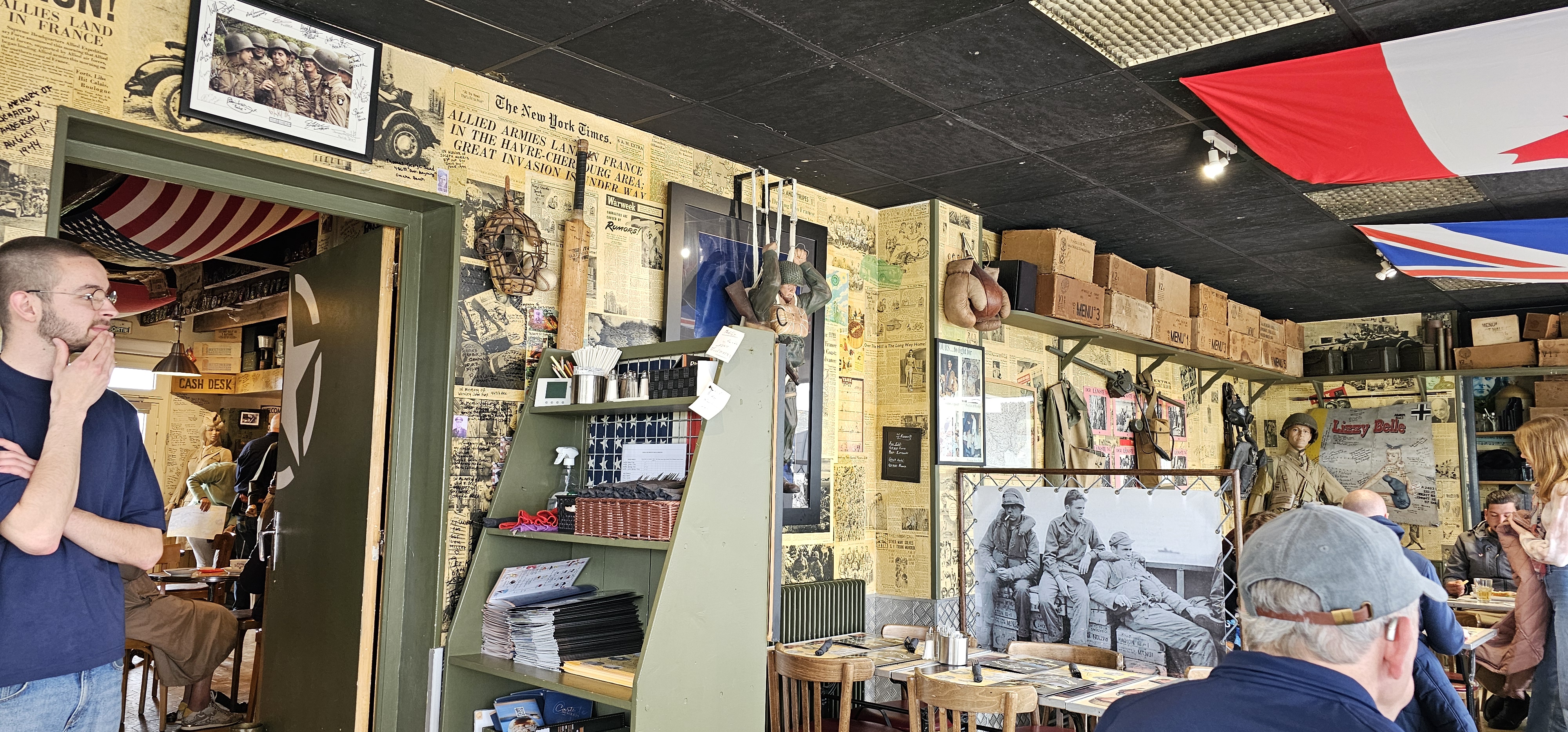 Petit arrêt dans ce bar atypique qui fait également restaurant. La décoration est vraiment unique à voir avec des vestiges de la période du débarquement. Des dédicaces sont signées un peu partout sur les murs et le bar. Des photos de vétérans sont aussi affichées ainsi que de nombreux blasons et insignes militaires. Les toilettes sont également à voir, installées dans une imitation de bateau de guerre. Ajoutez un patron sympa et vous comprenez que cet endroit vaut le détour. Je ne me prononce pas sur les repas n'ayant pas mangé mais juste bu un verre.