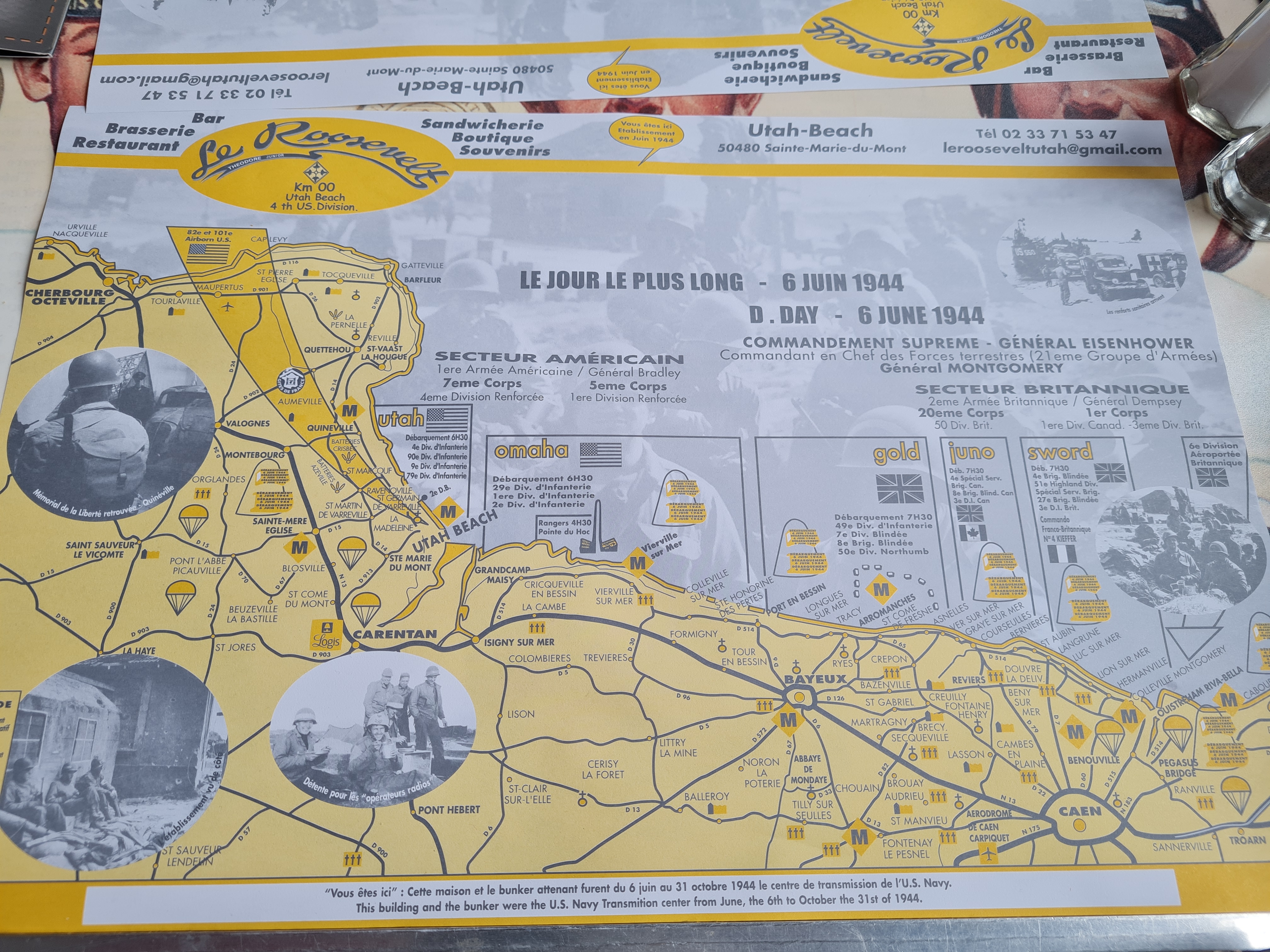 Ce restaurant est très sympa ! Il y a des radios d’époque et des mannequins habillés en tenue d’époque américaine, des set de table avec la carte du débarquement en Normandie le 6/6/44. Le menu du jour est très bien (ce jour andouillette sauce camembert et crumble), nous avons également goûter les moules et le burger qui étaient excellent ! Les glaces aussi sont très bonnes (la dame blanche est succulente ). Personnel sympathique et serviable. Service rapide. Je recommande ce resto si vous allez sur Utah! De plus il y a une petite boutique de souvenirs à côté où vous pouvez trouver divers objets tee shirt, bouteilles, cartes postales, plaques US ainsi que des billets de 0€ d’Utah.