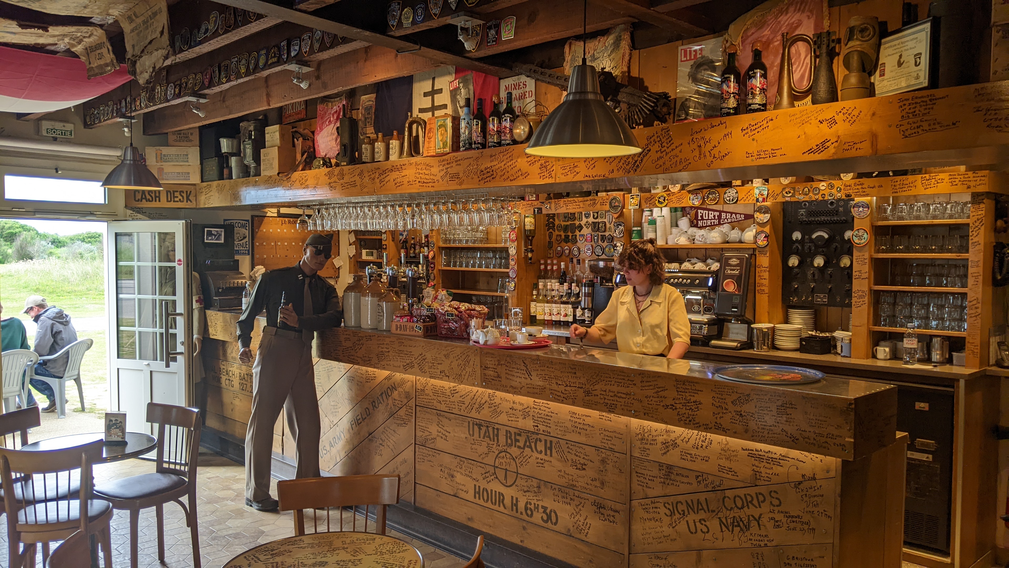 Nous y sommes allés plusieurs fois pour le goûter, nous recommandons. Un super décors avec les signatures de vétérans, des mannequins représentatifs, une ambiance du débarquement fortement présente! Bonne proximité avec la plage et le musée. Néanmoins, service pas très chaleureux.